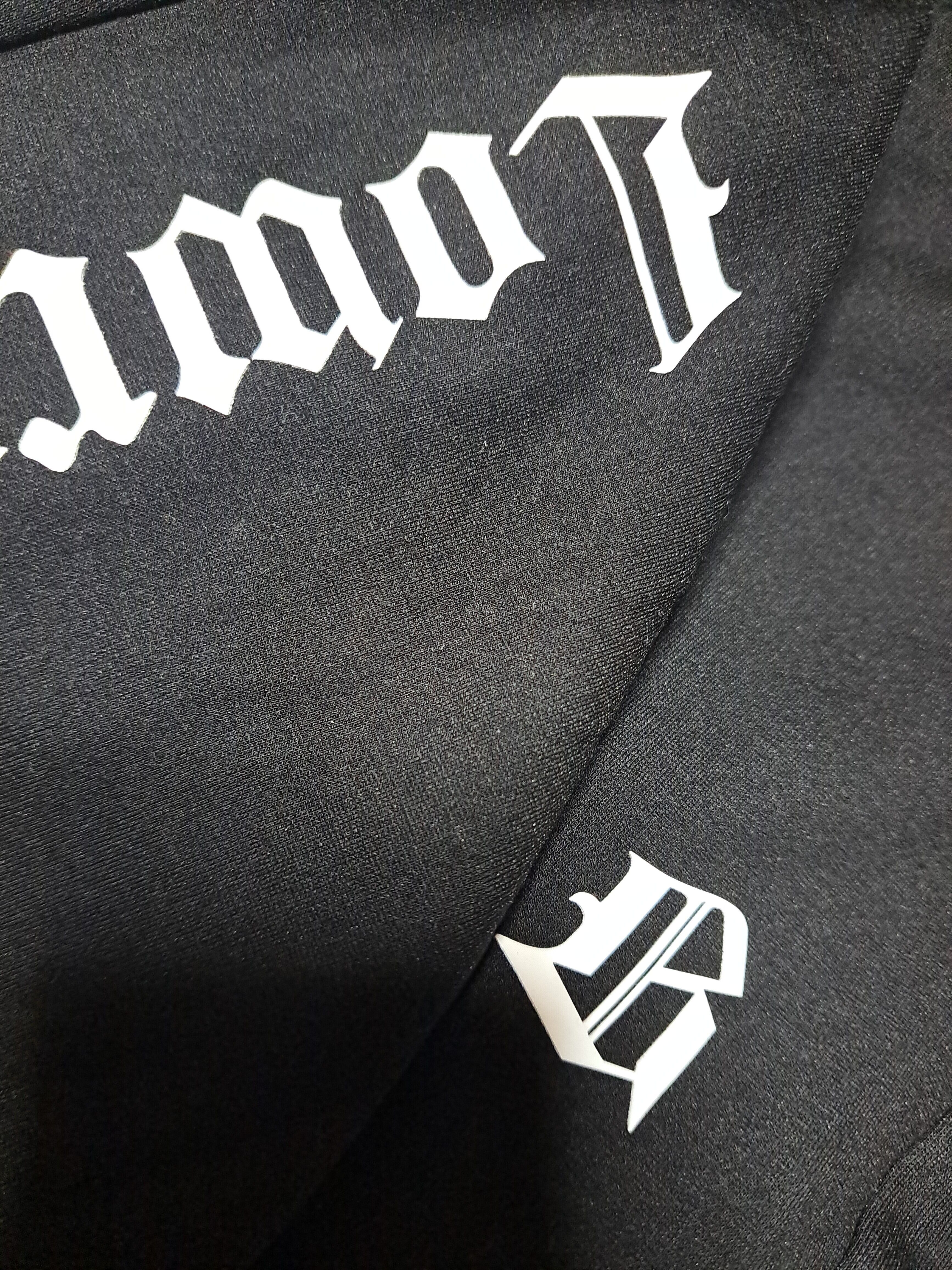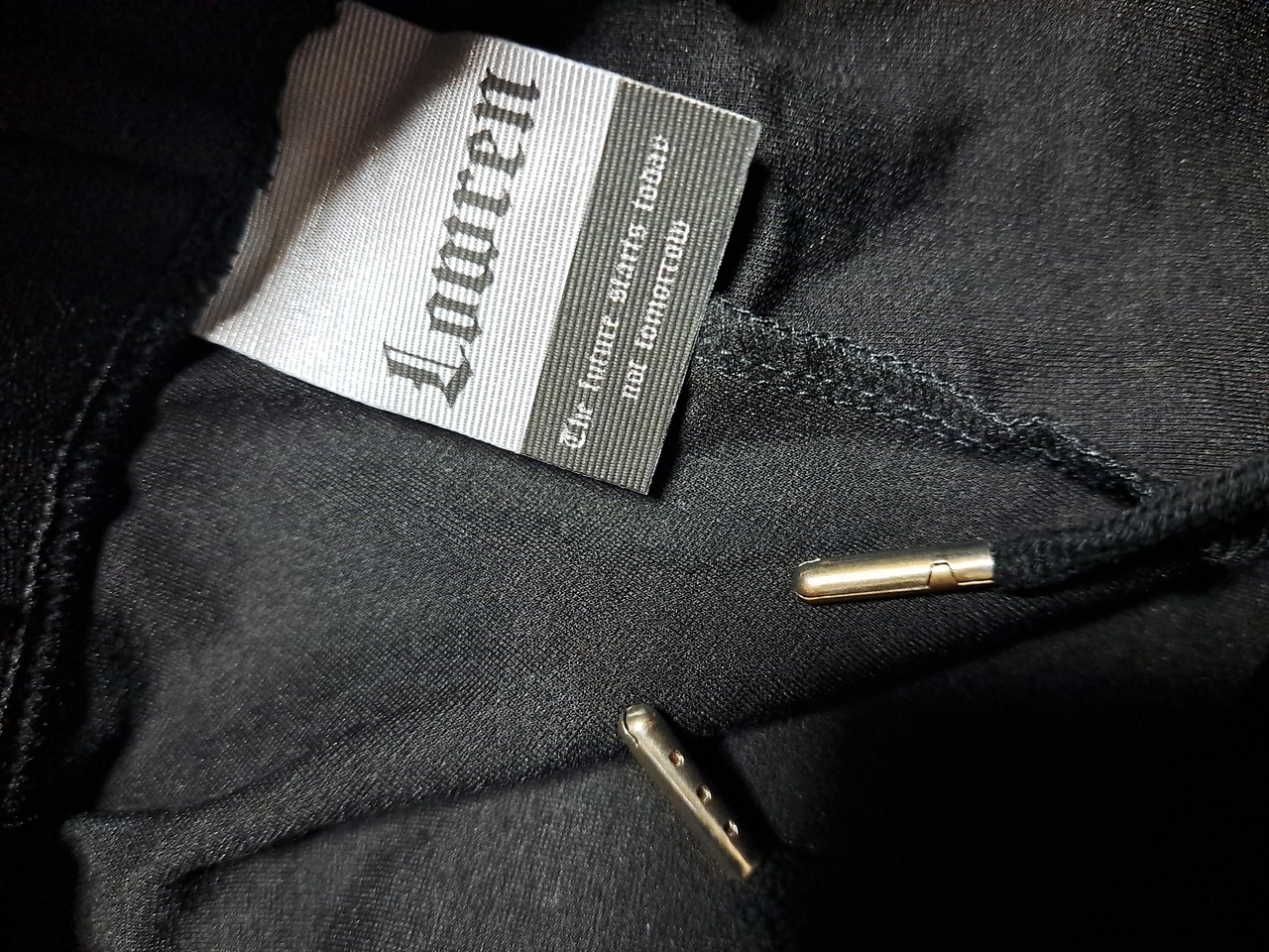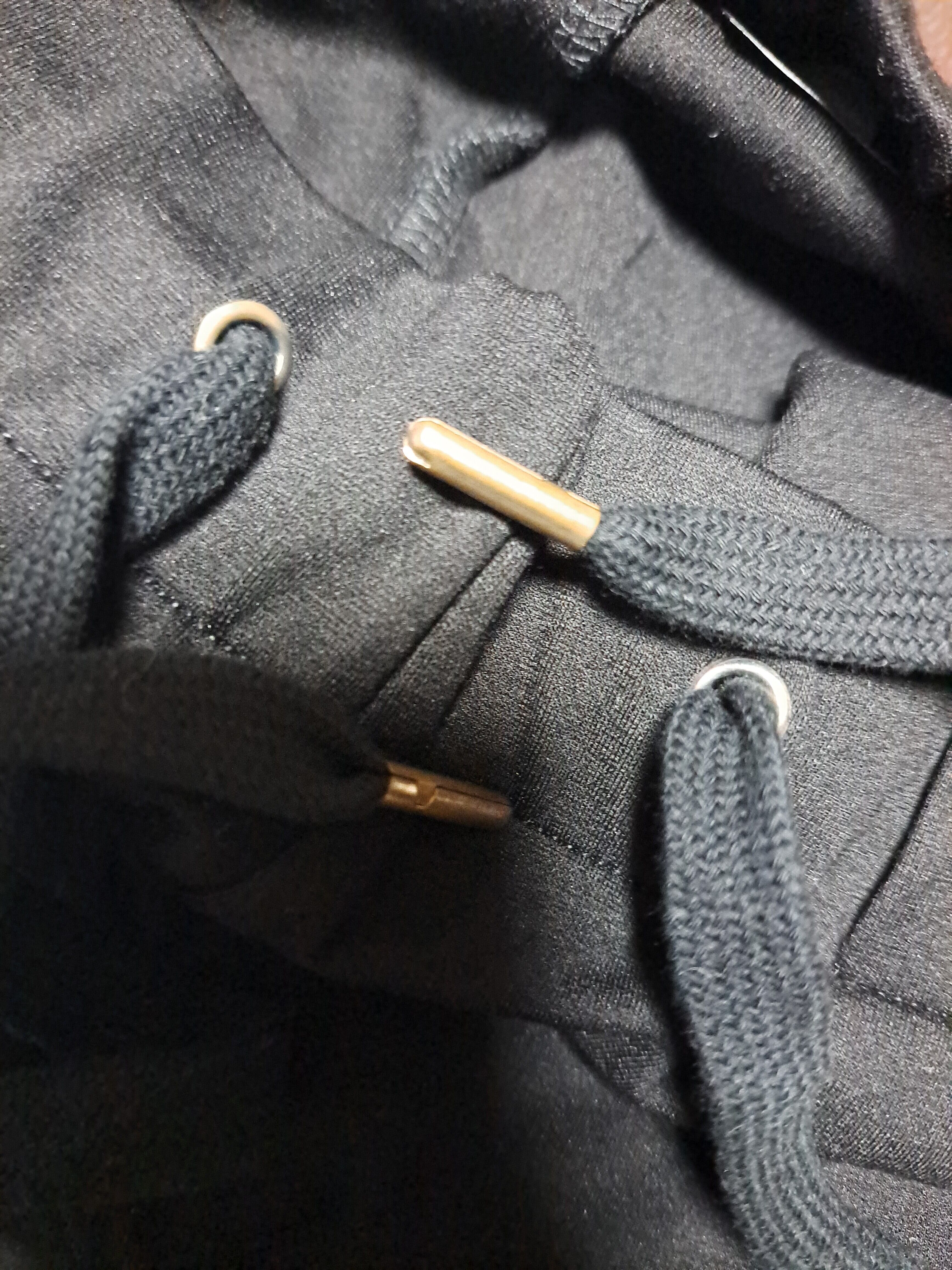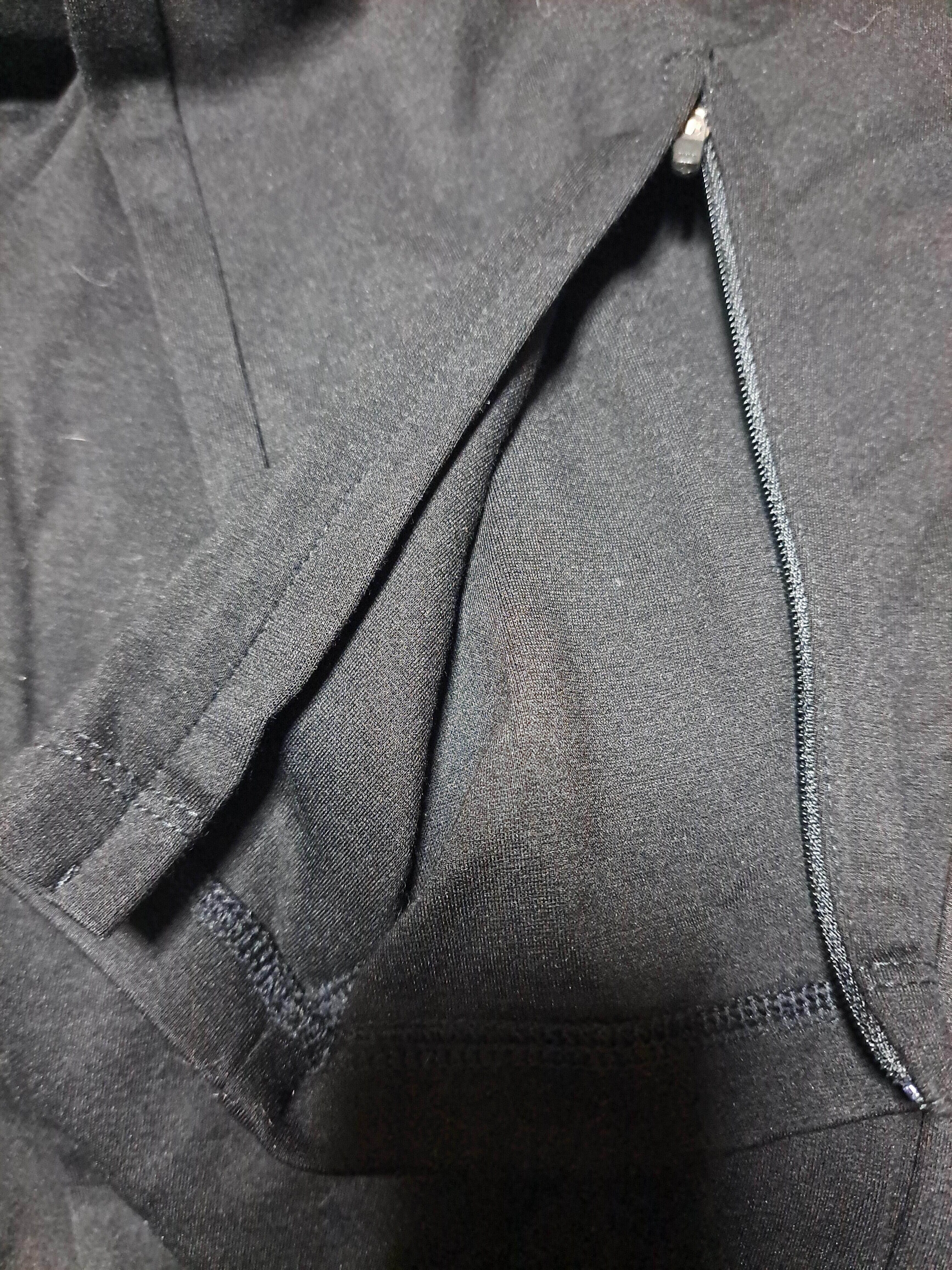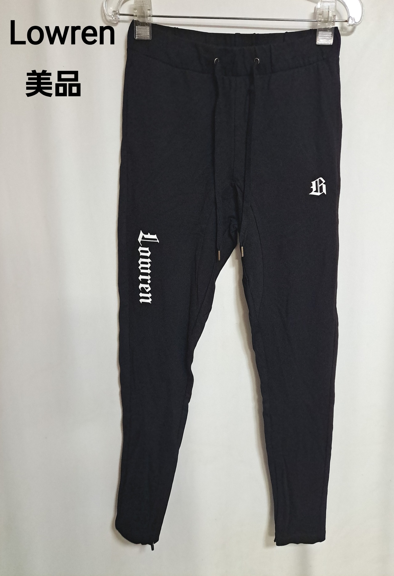 フロントにロゴプリント、裾にファスナー付き。ウェスト紐の先端の金属素材は購入当初から少し変色がありますが、錆ではありません。ポケットは合計2つ。