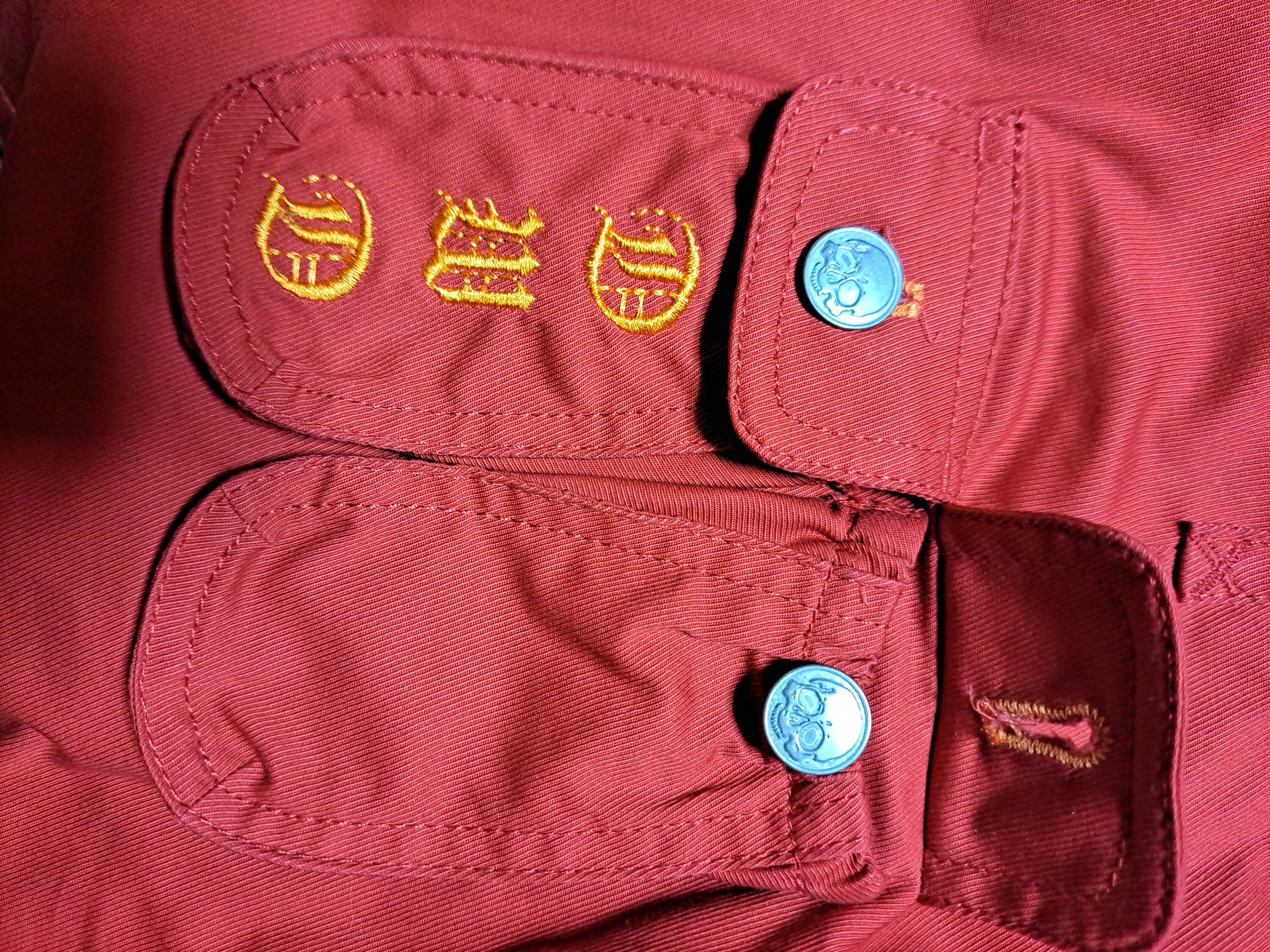 サイドに金属製のスカル柄3連ボタンが付いた、少し変わった仕様。ポケット(収納スペース)は合計5つ。