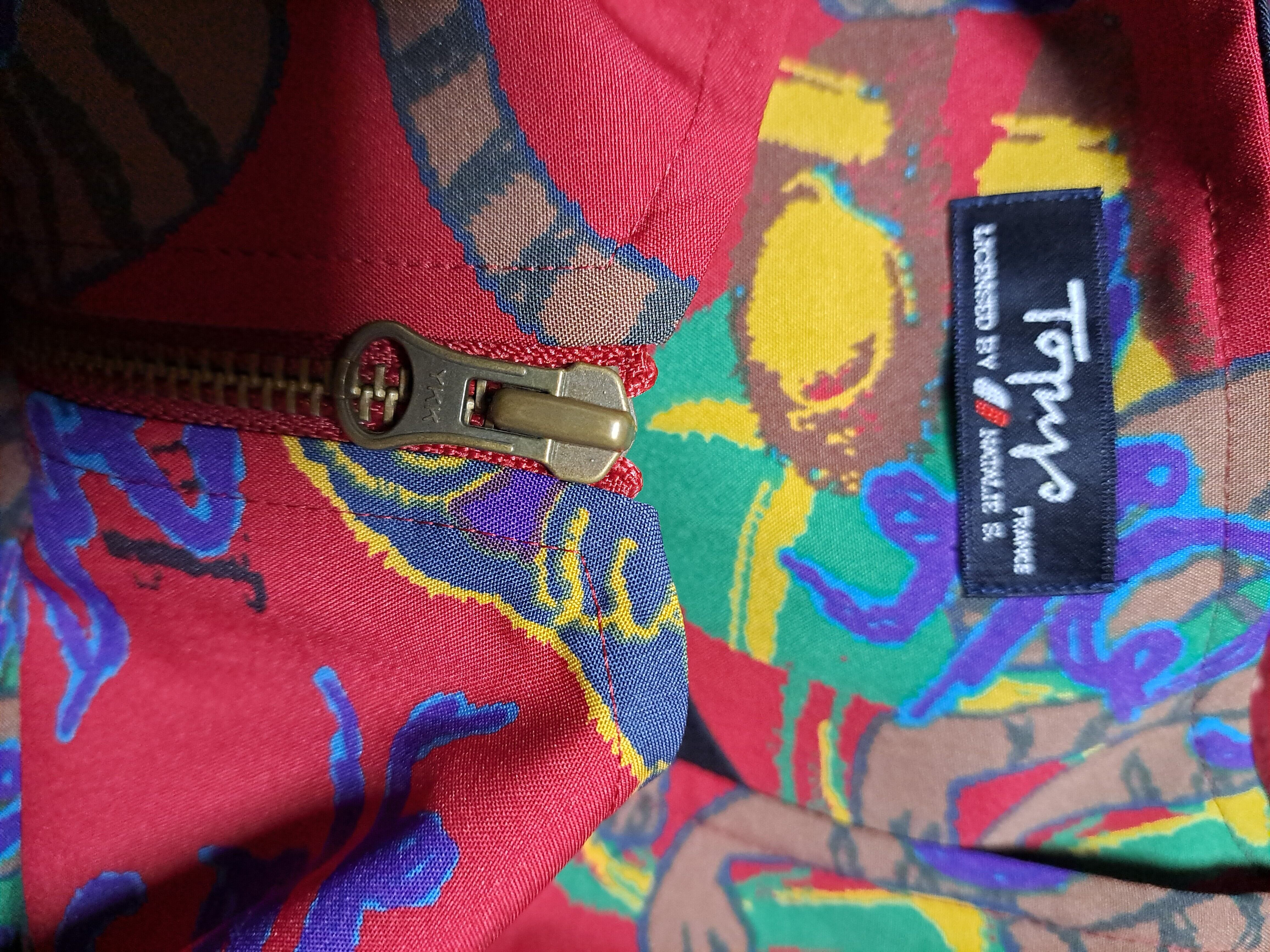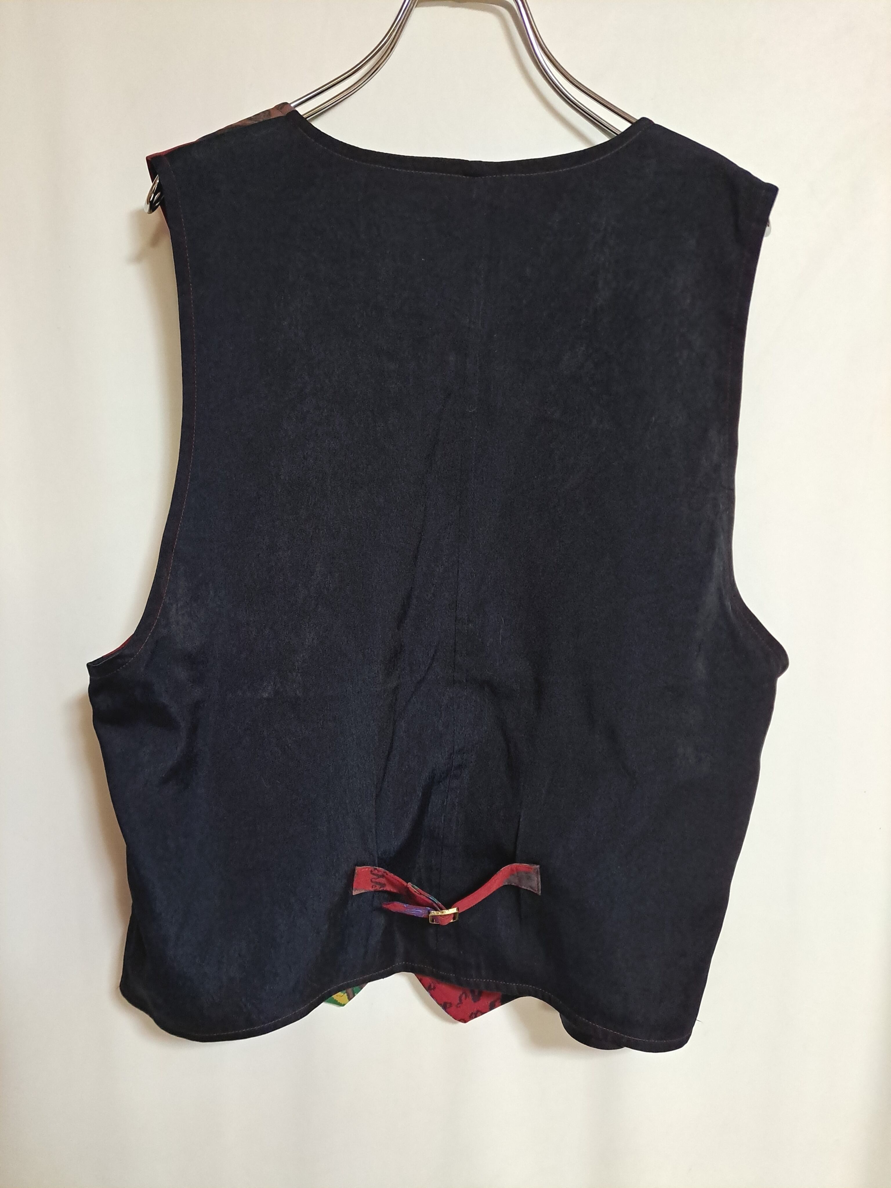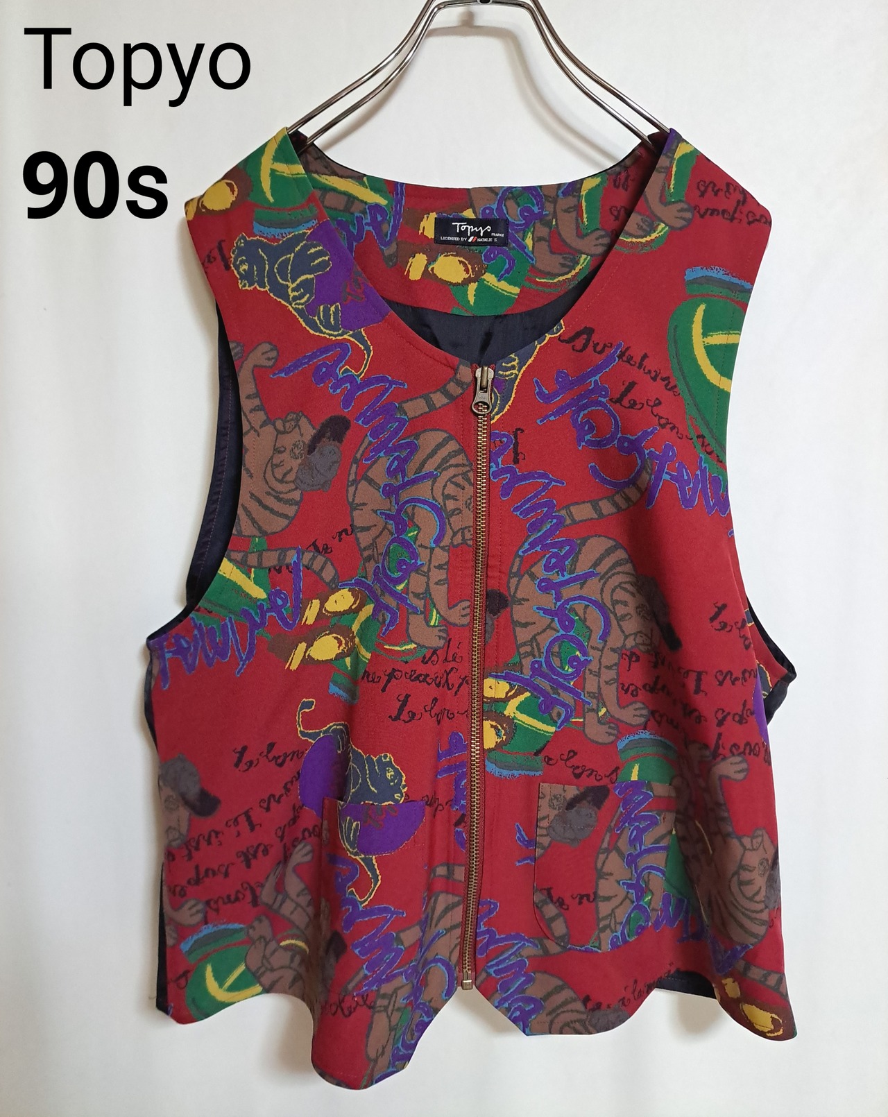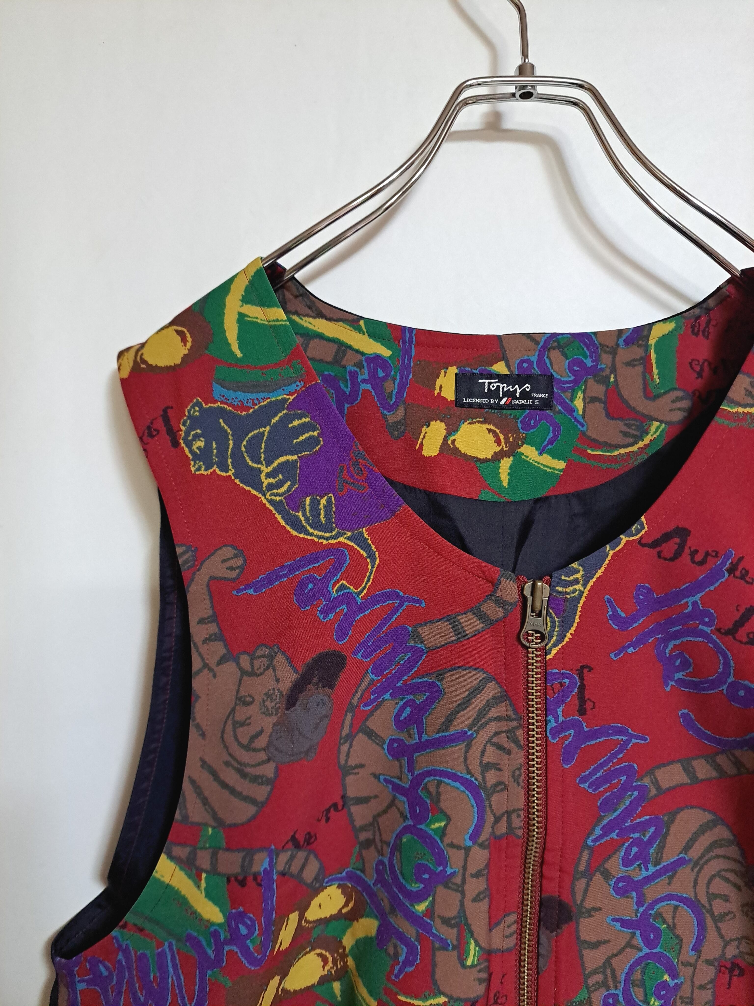 ややくすんだカラーリングに、虎や熊などが描かれたフルジップベスト。ポケットは合計2つ。バックに調節金具付き。安心の日本製。