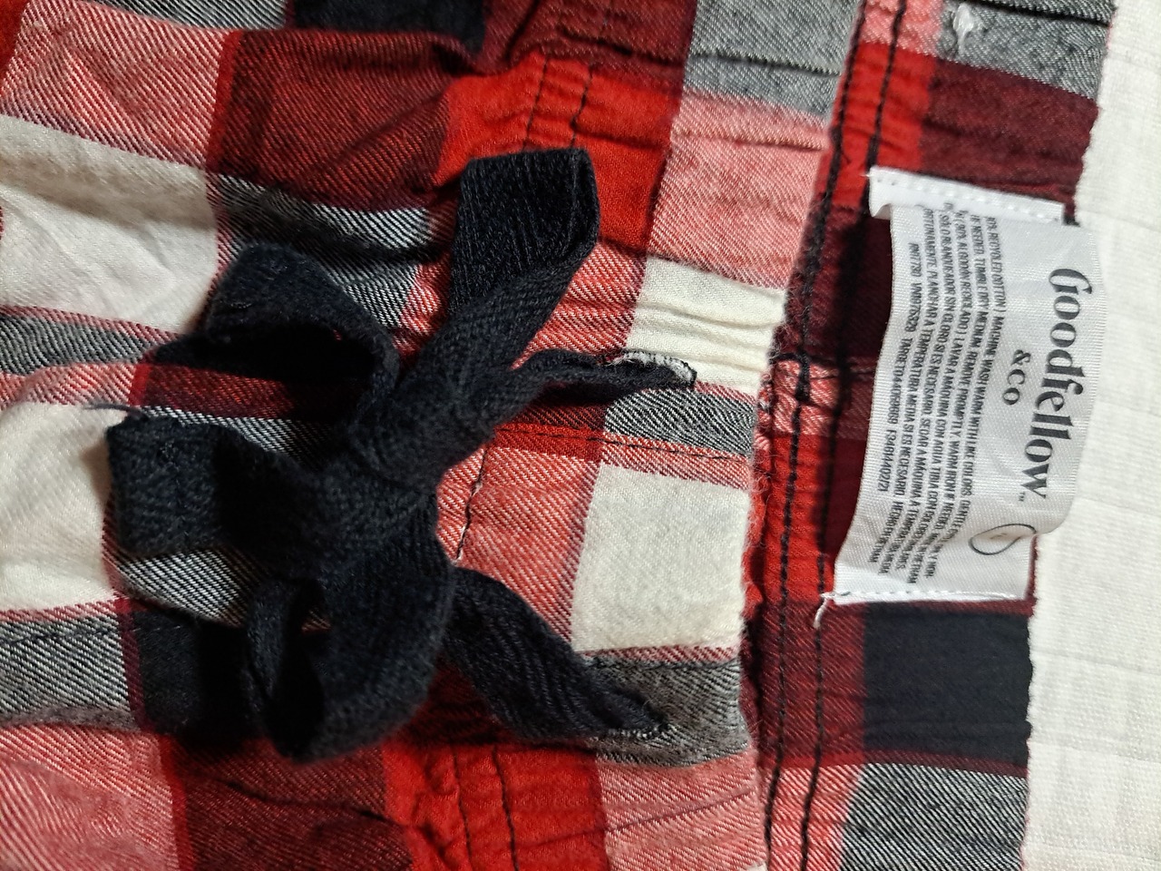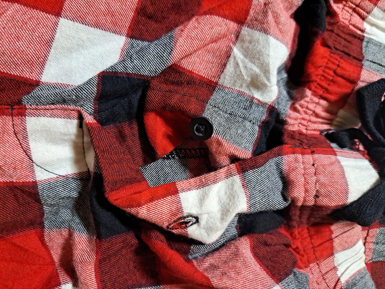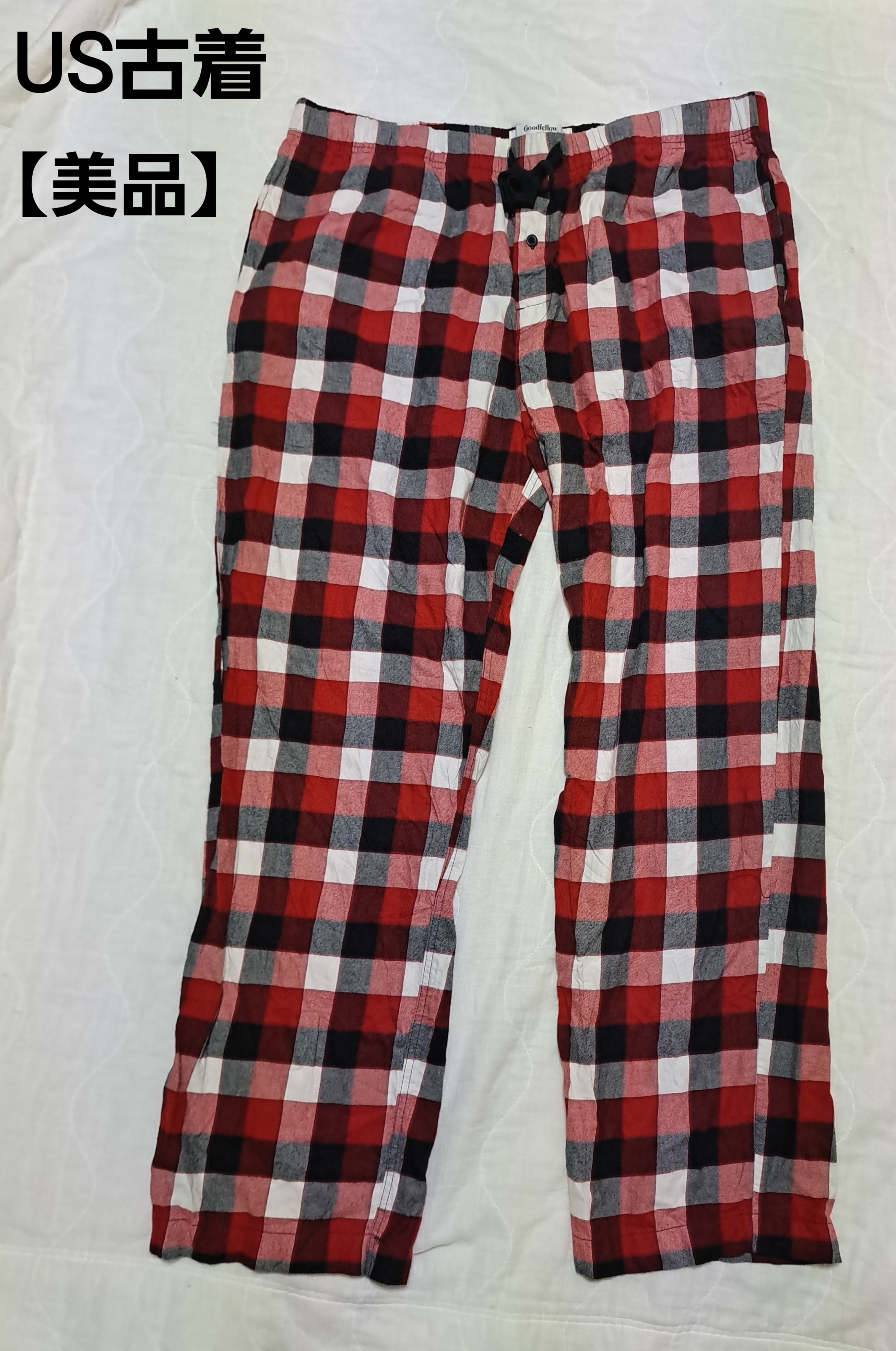 うっすら起毛素材の、ウエストゴム仕様で紐付きのパジャマパンツ。ポケットは左右に合計2つで、フロントにはボタン付きです。