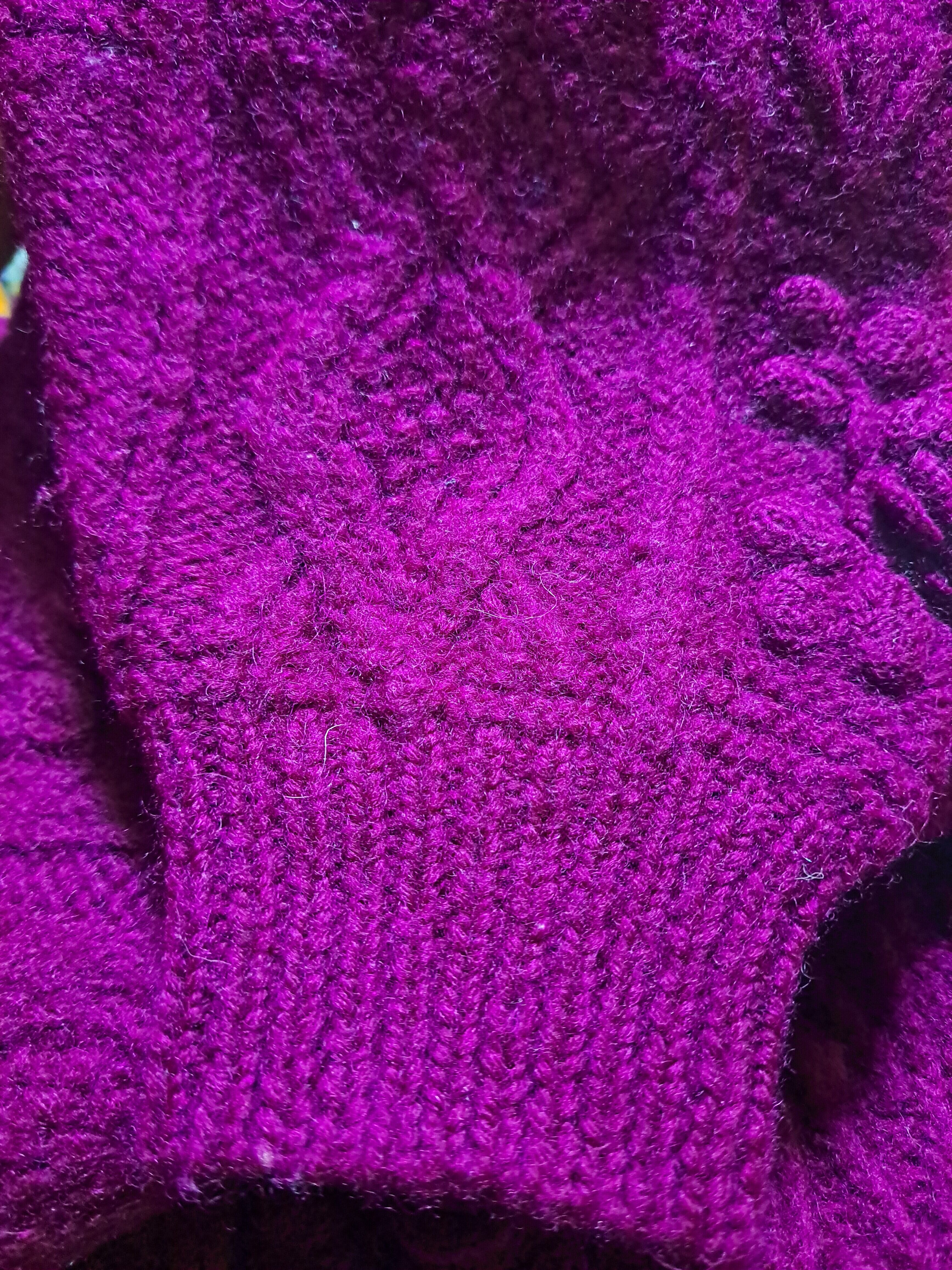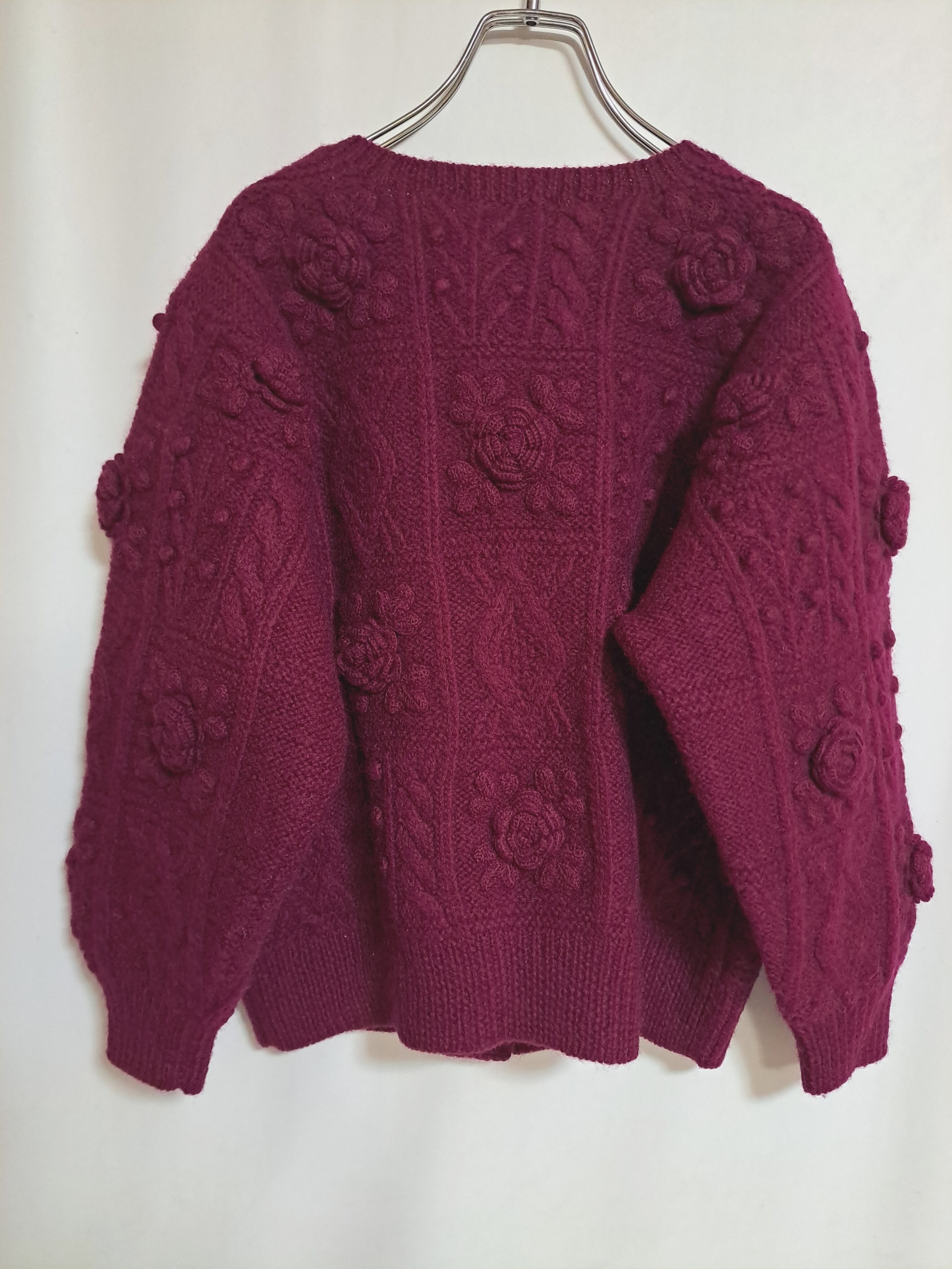 花やポンポン(ポップコーン編み)等が全体的にあしらわれた、ウールニットジャケット、カーディガン。厚手で暖かいです。替えボタン付き。紫色も綺麗です。