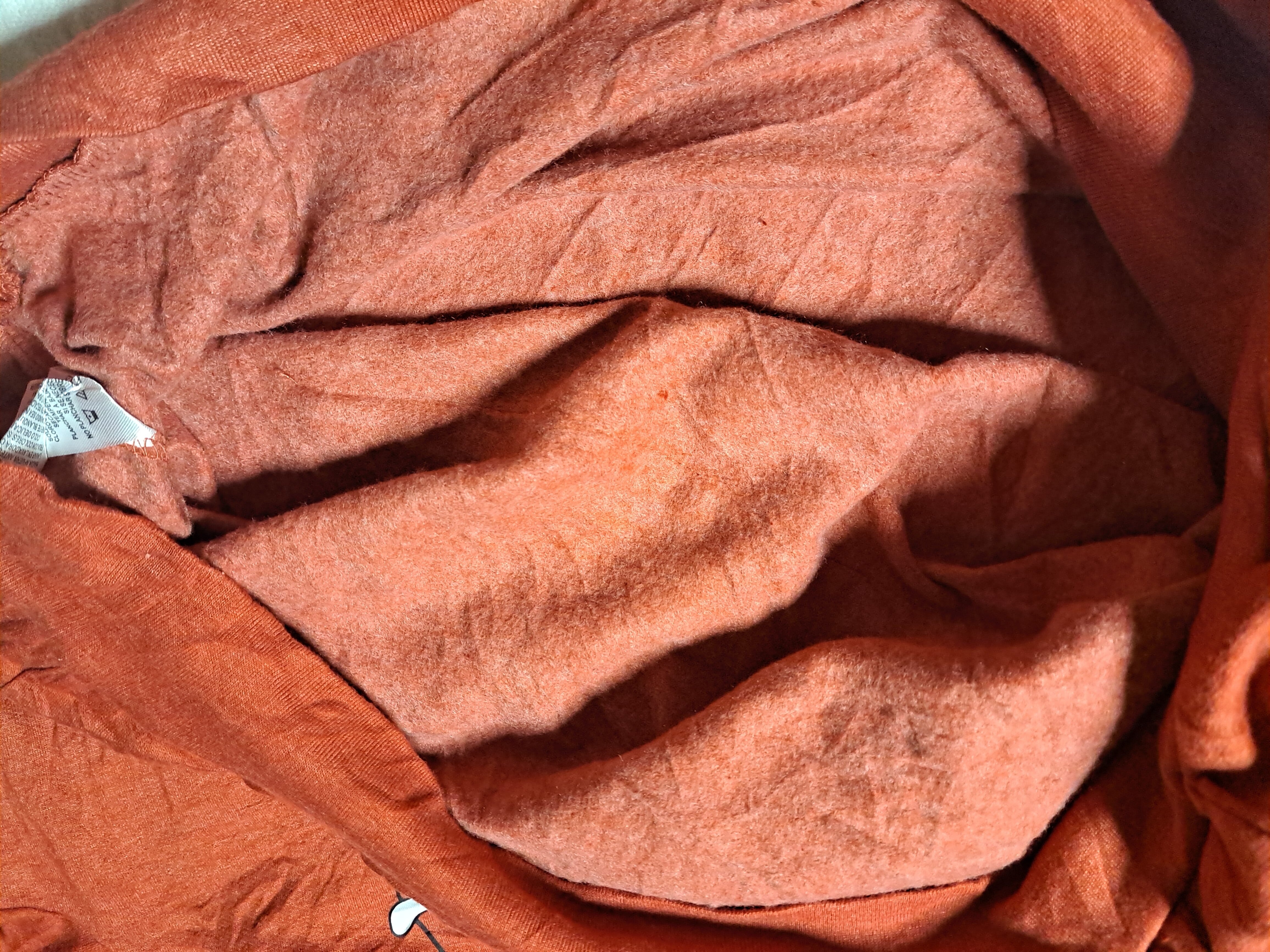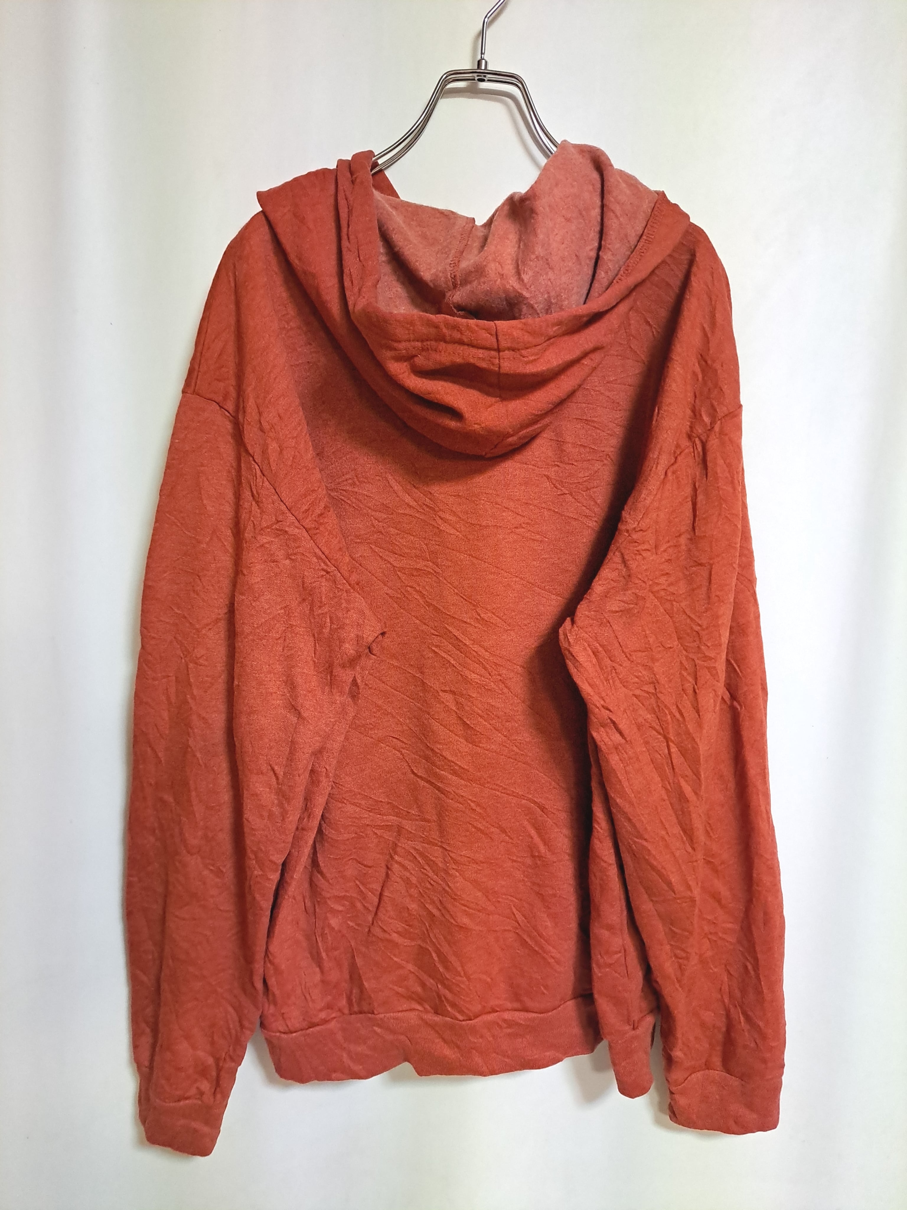 フード一体型で、紐で絞れます。ポケットは両手を入れられるカンガルーポケット。やや薄手ではありますが、裏起毛で暖かいです。生地は元から少し毛羽立ったような仕様です。