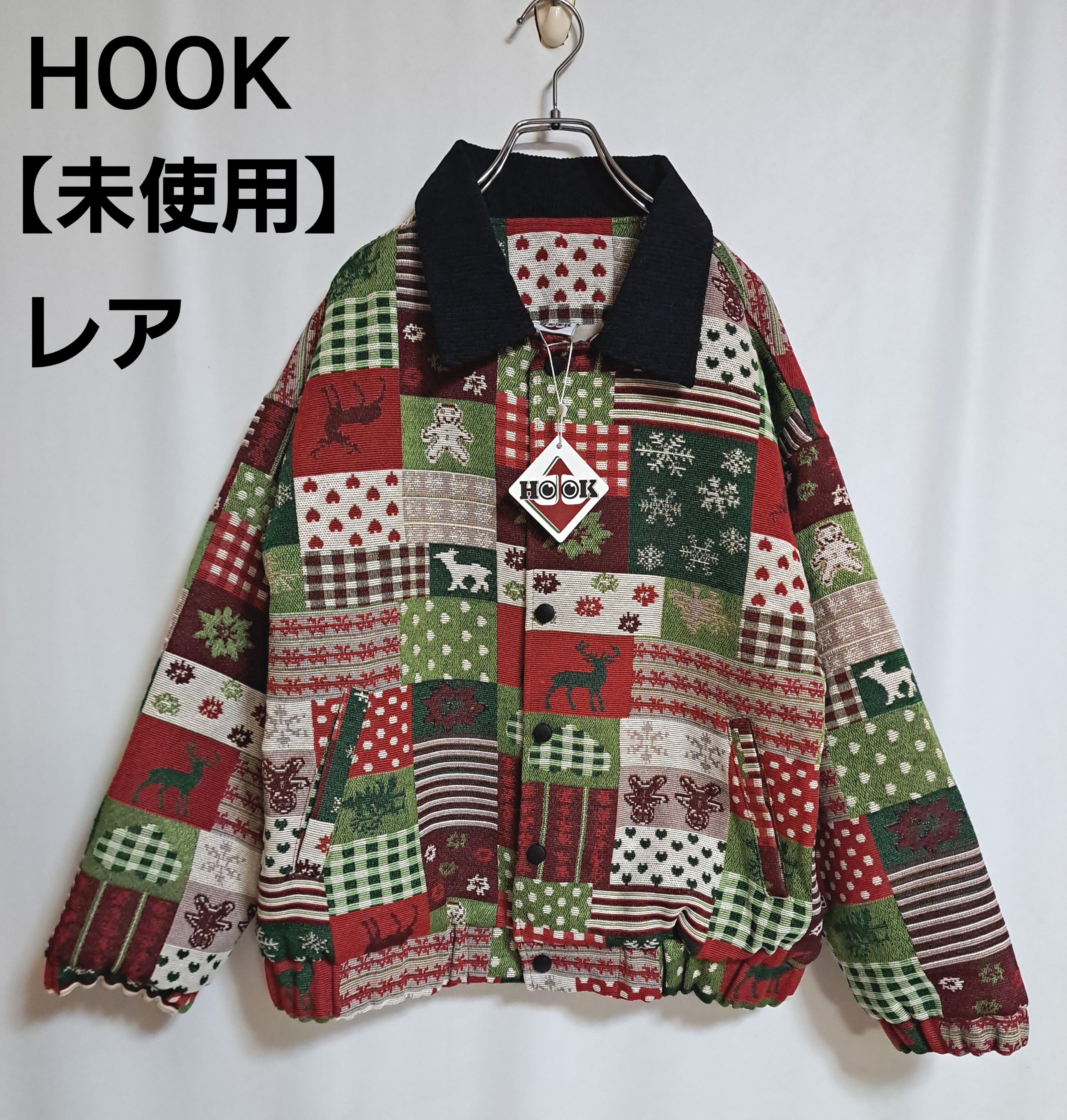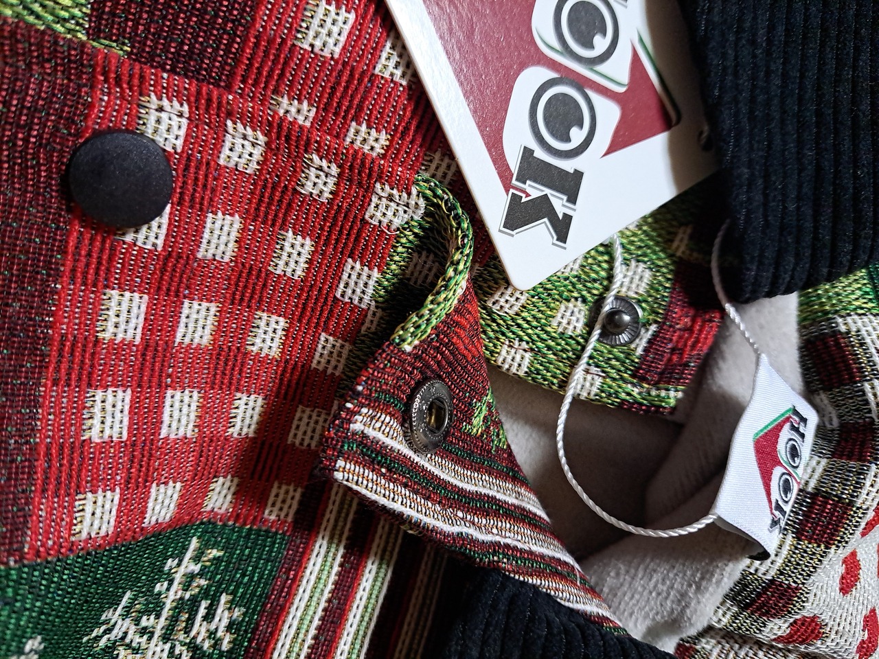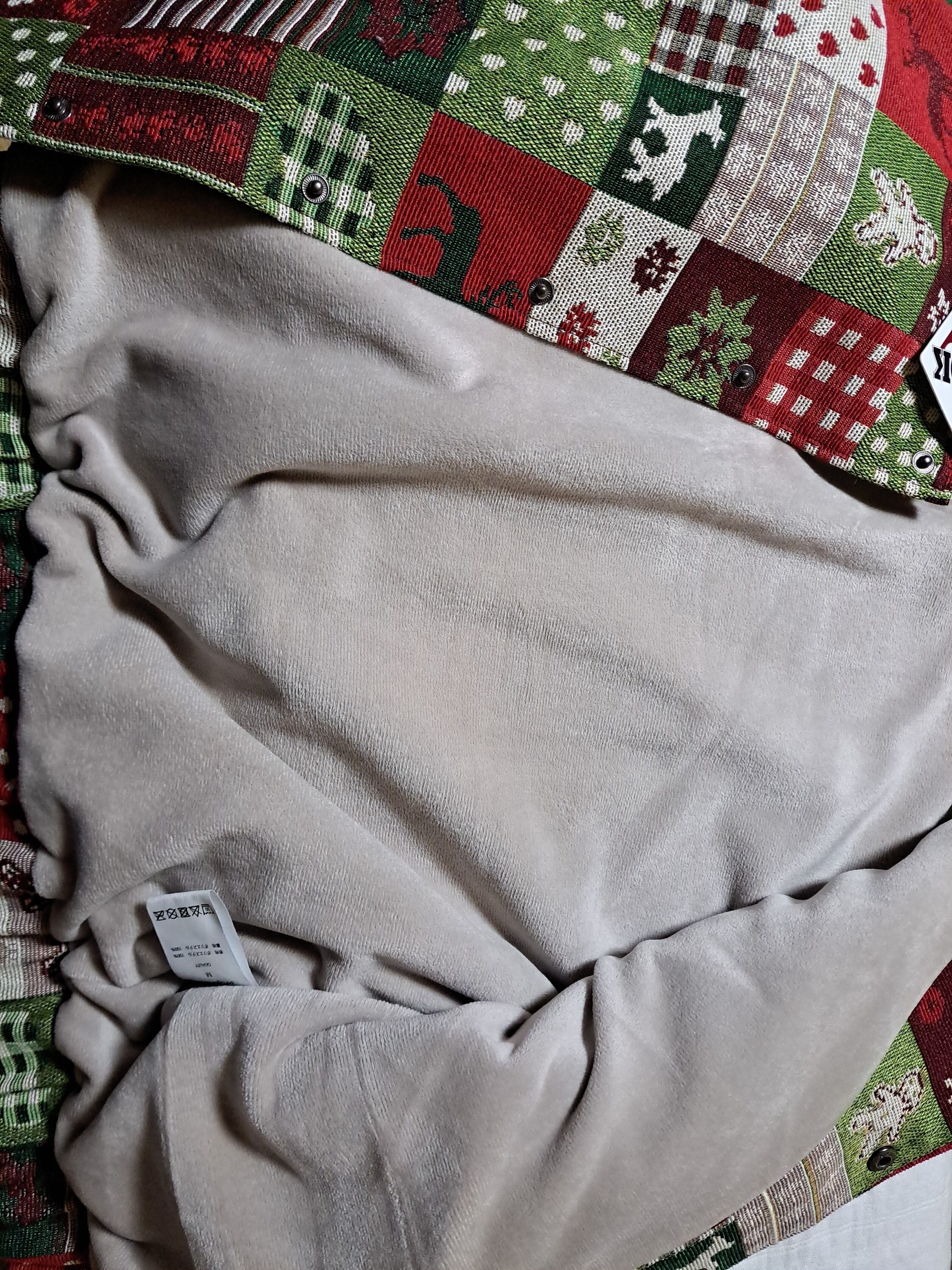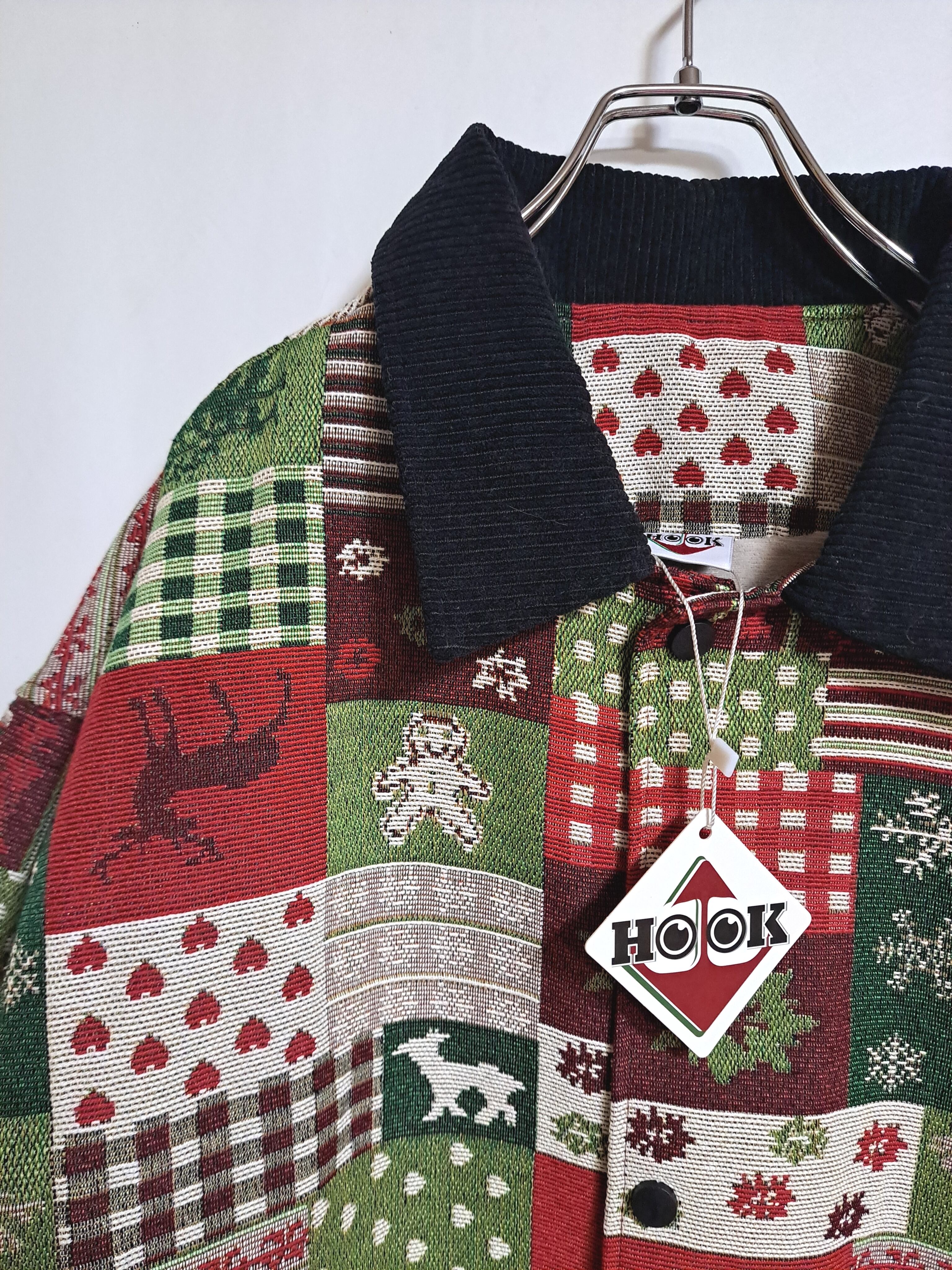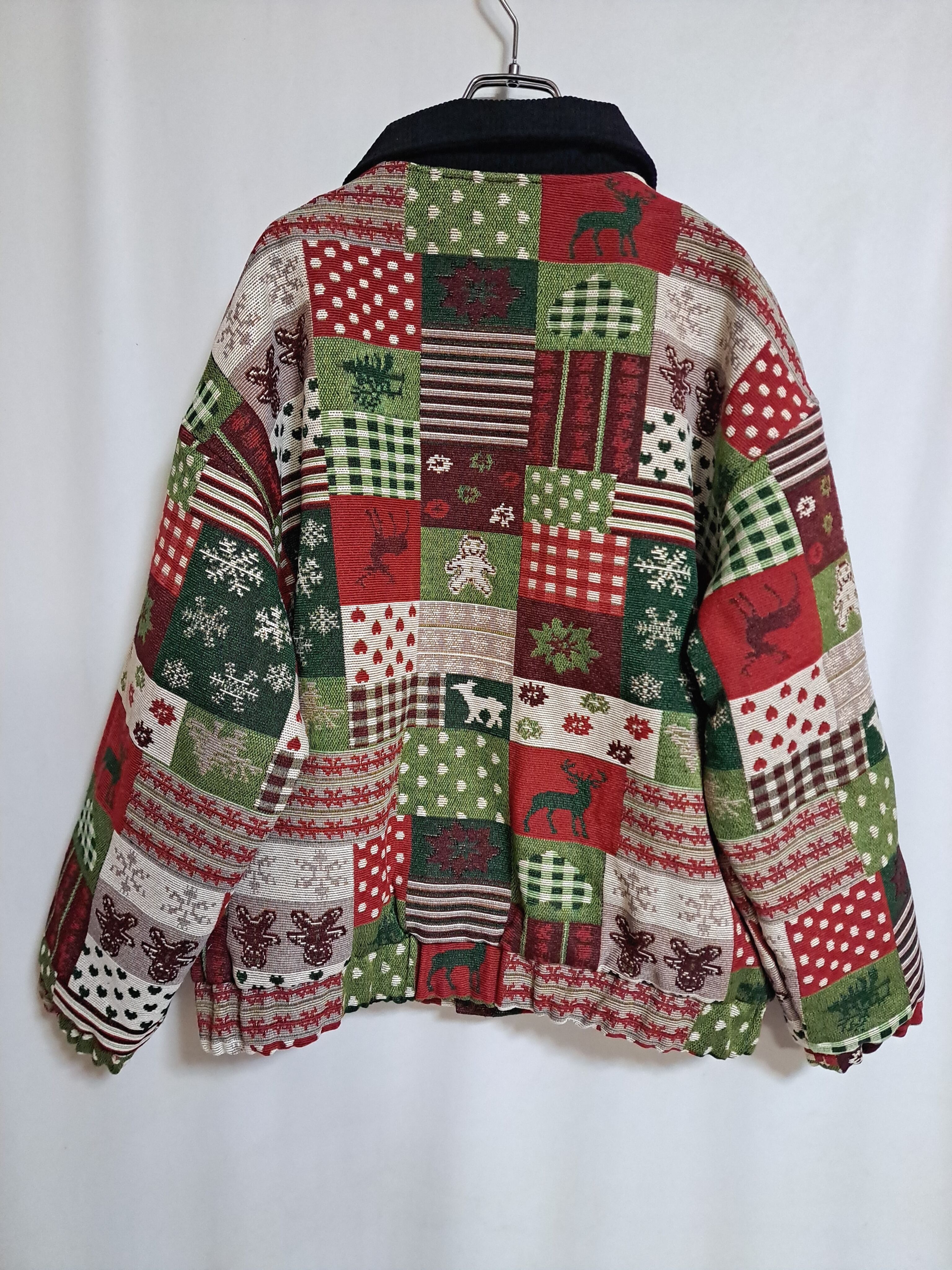しっかりめのゴブラン生地で作成された、裏起毛のジャケット。フロントは金属製スナップボタン使用。トナカイやツリー、ハートなどが赤や緑のカラーであしらわれた、クリスマスっぽいレアなデザイン。