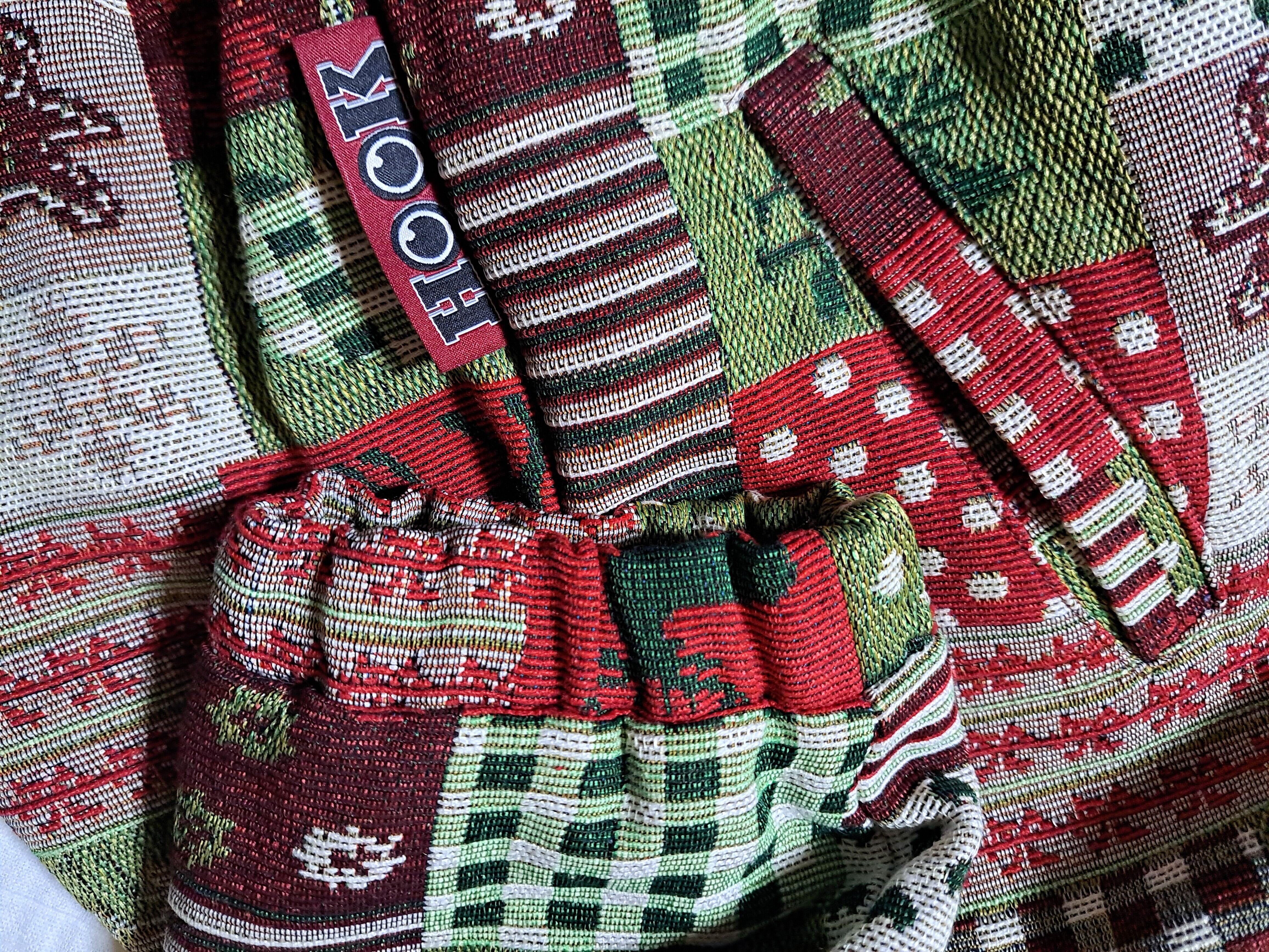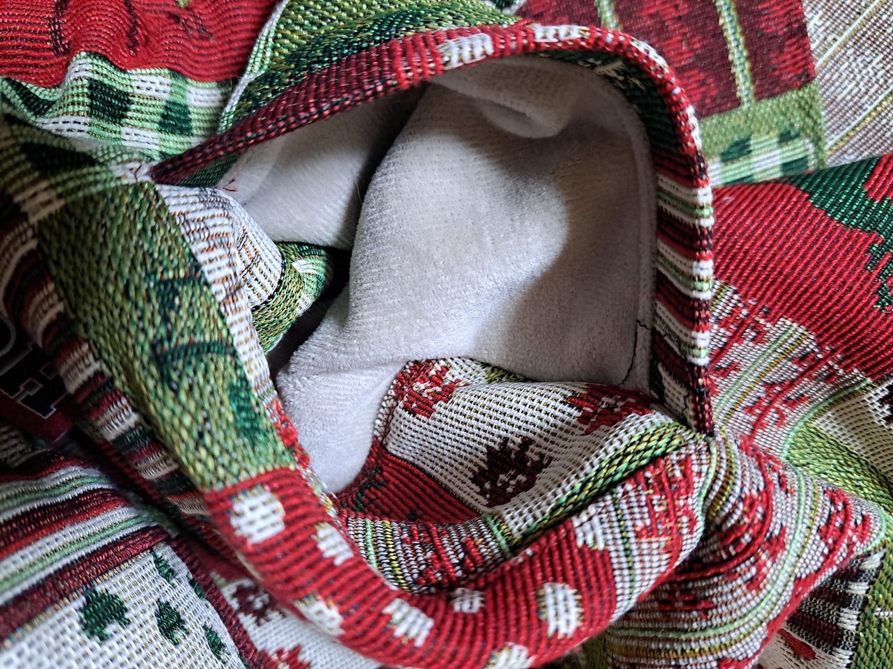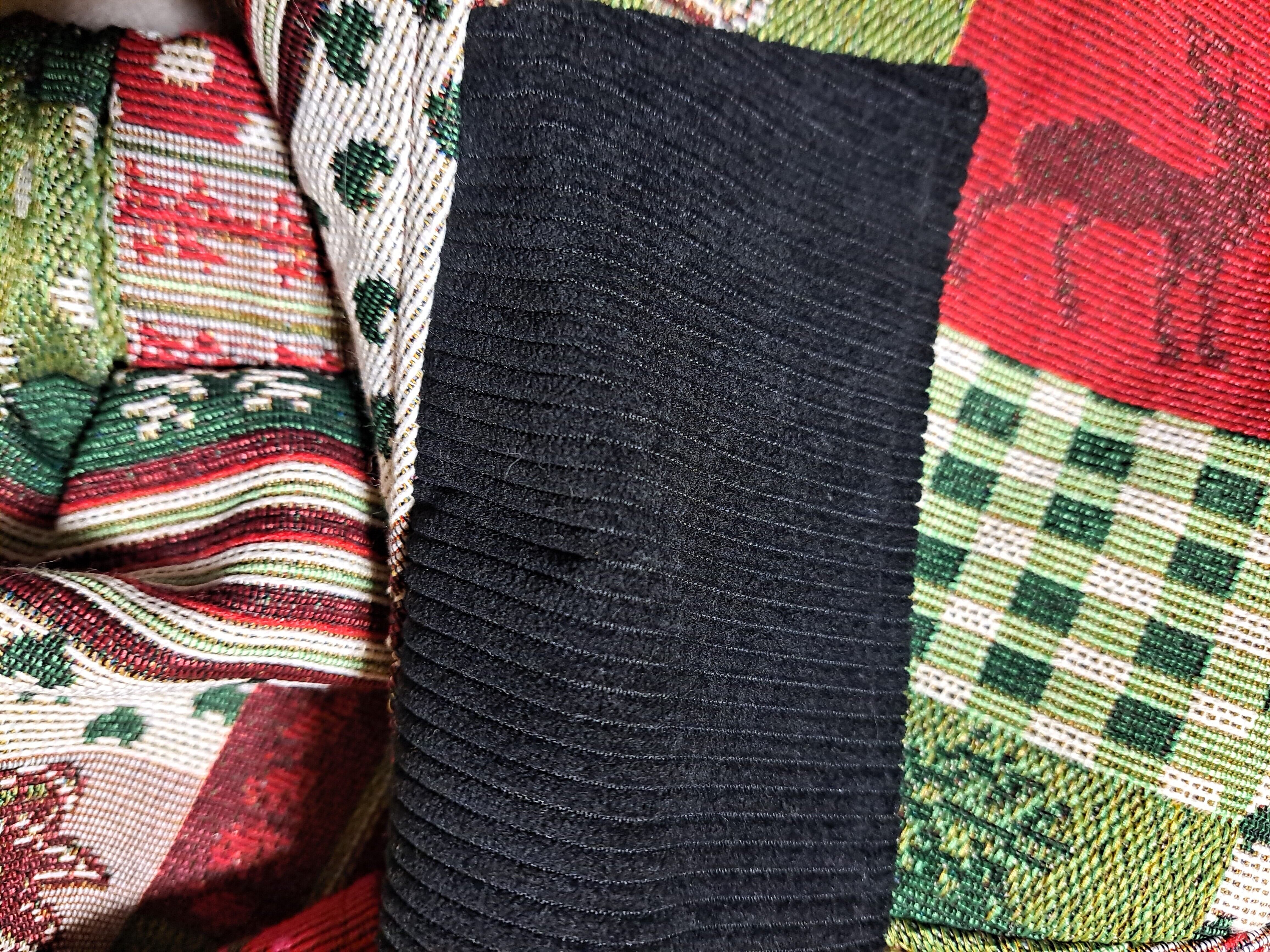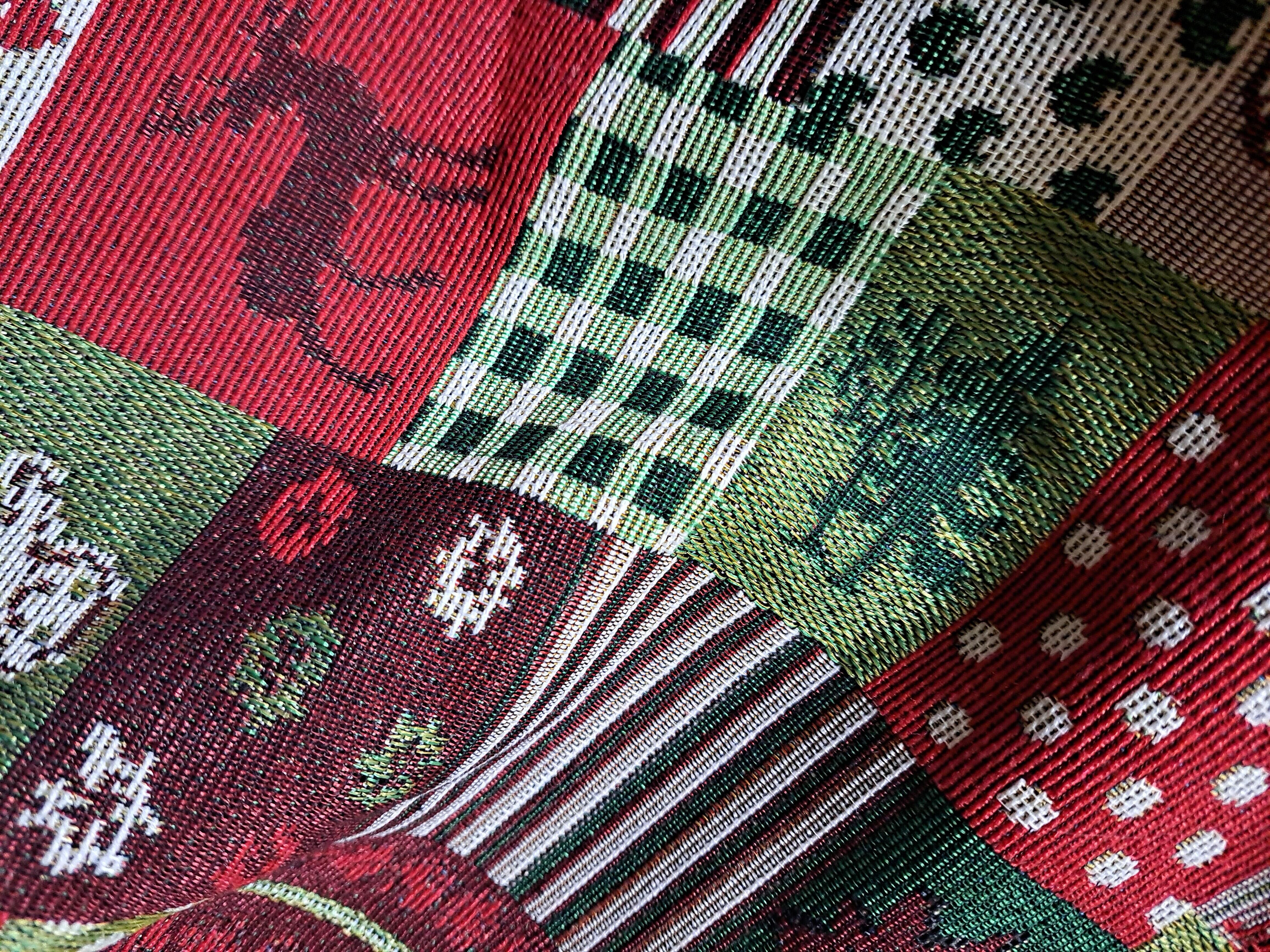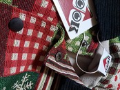 しっかりめのゴブラン生地で作成された、裏起毛のジャケット。フロントは金属製スナップボタン使用。トナカイやツリー、ハートなどが赤や緑のカラーであしらわれた、クリスマスっぽいレアなデザイン。