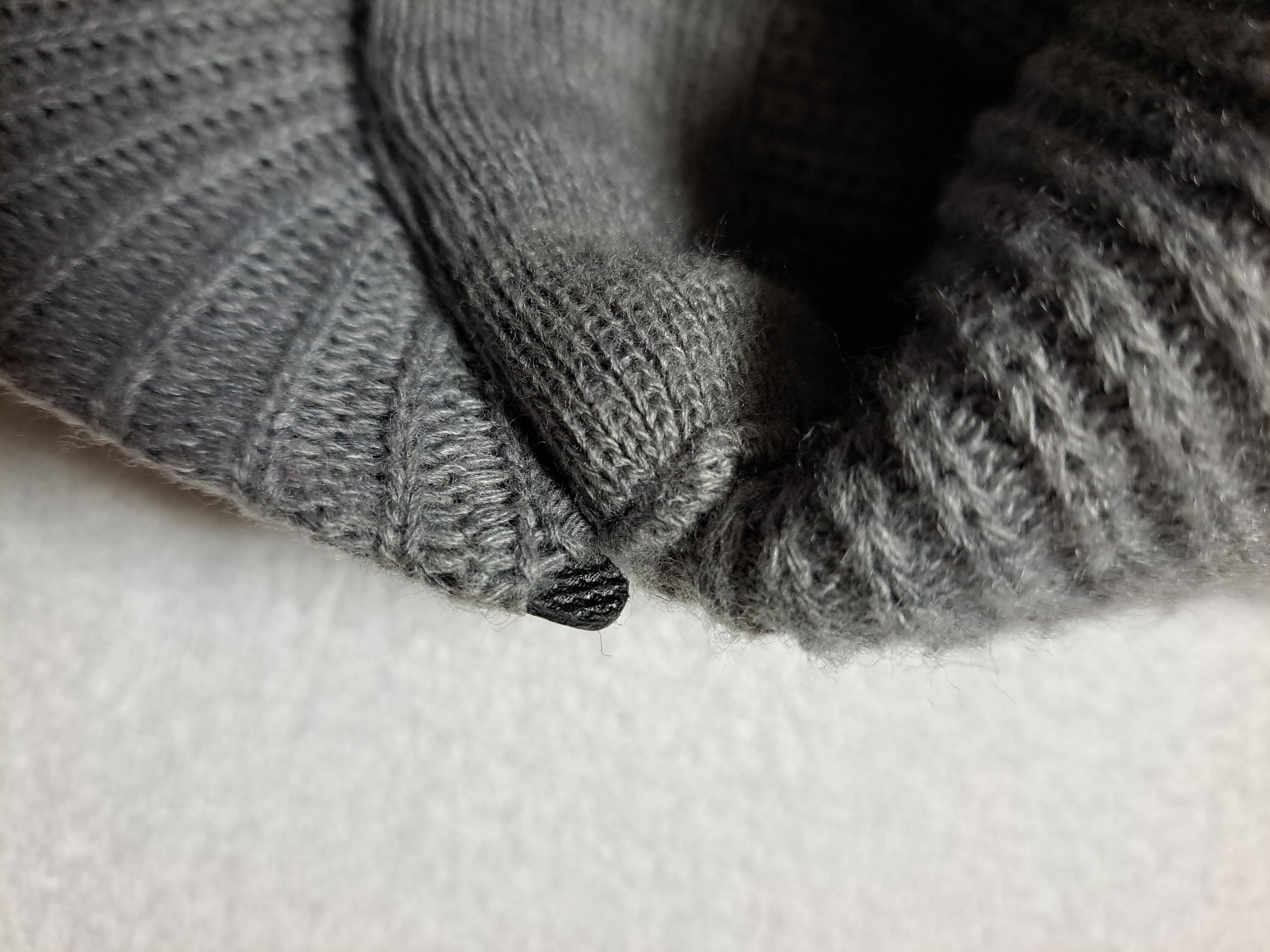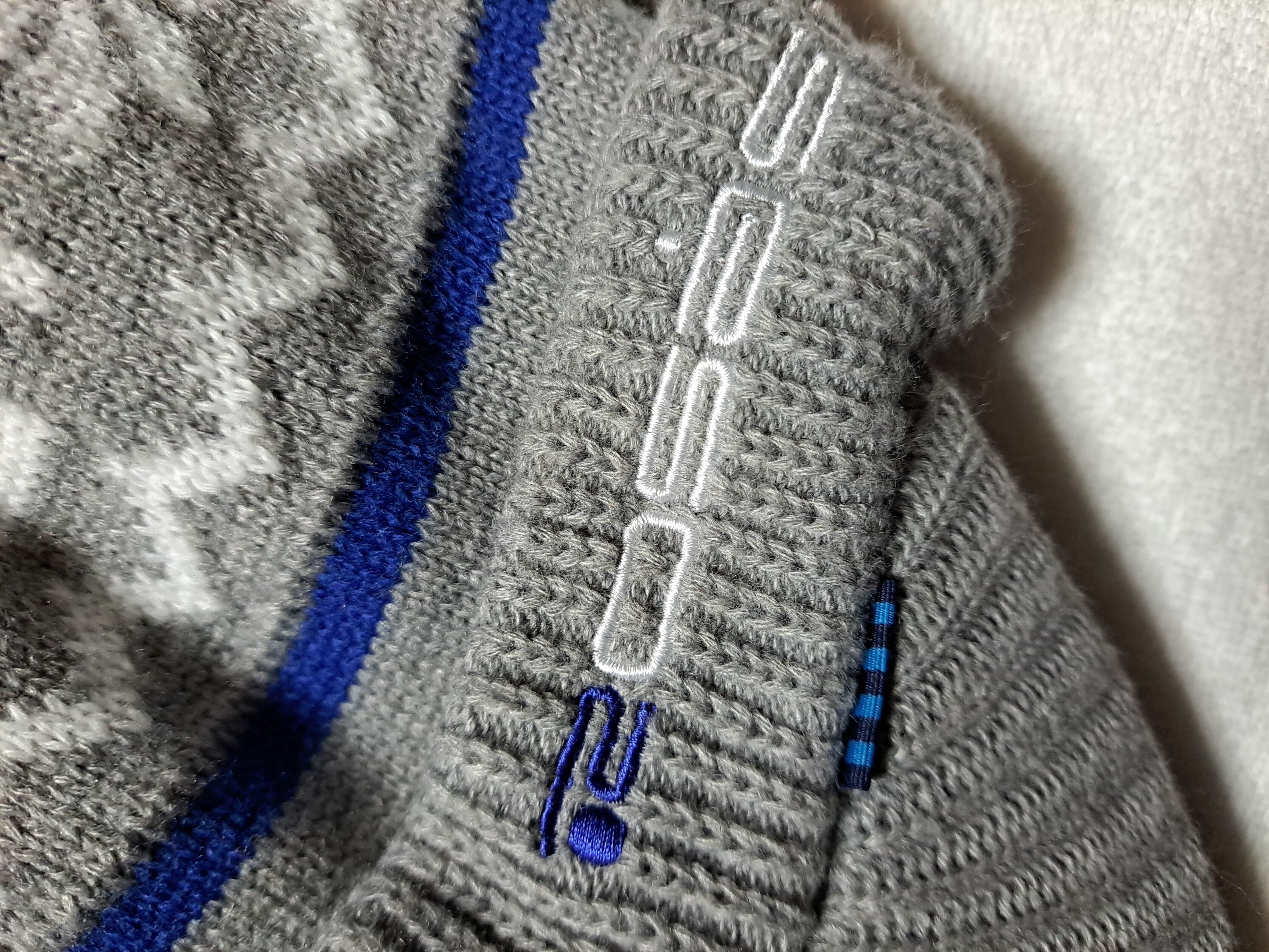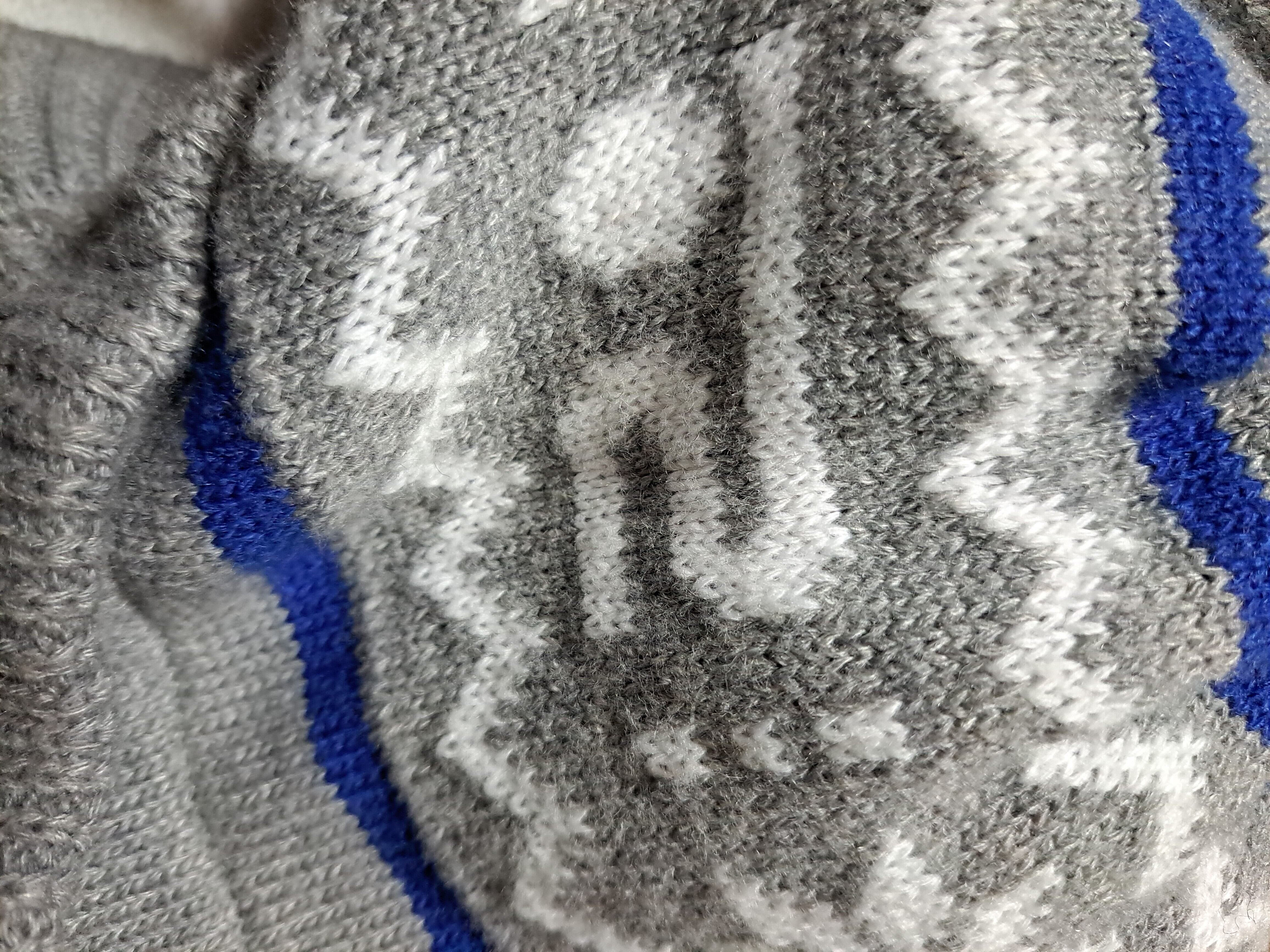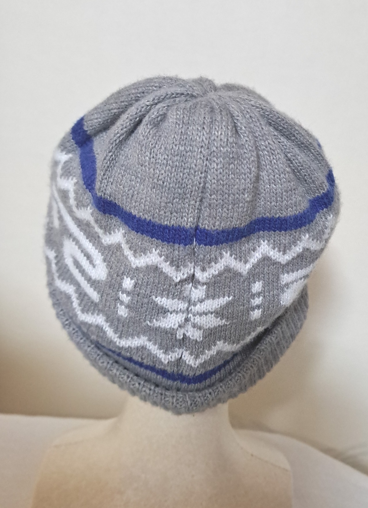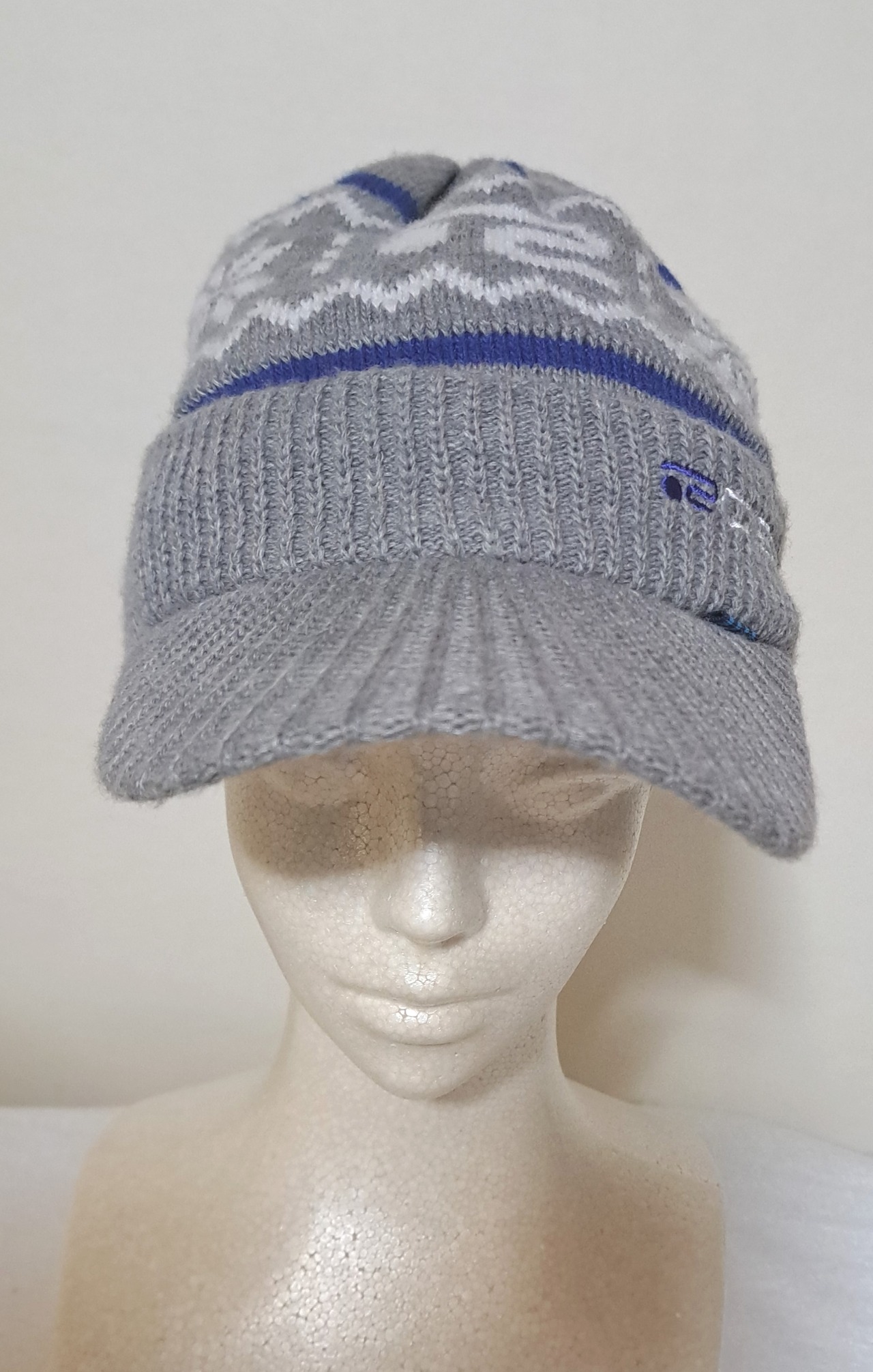 淡いグレーにノルディック模様のデザインされた、厚みのある生地。若干の使用感、つばの両端に少し型のはみ出しがあります(4枚目の写真参照)