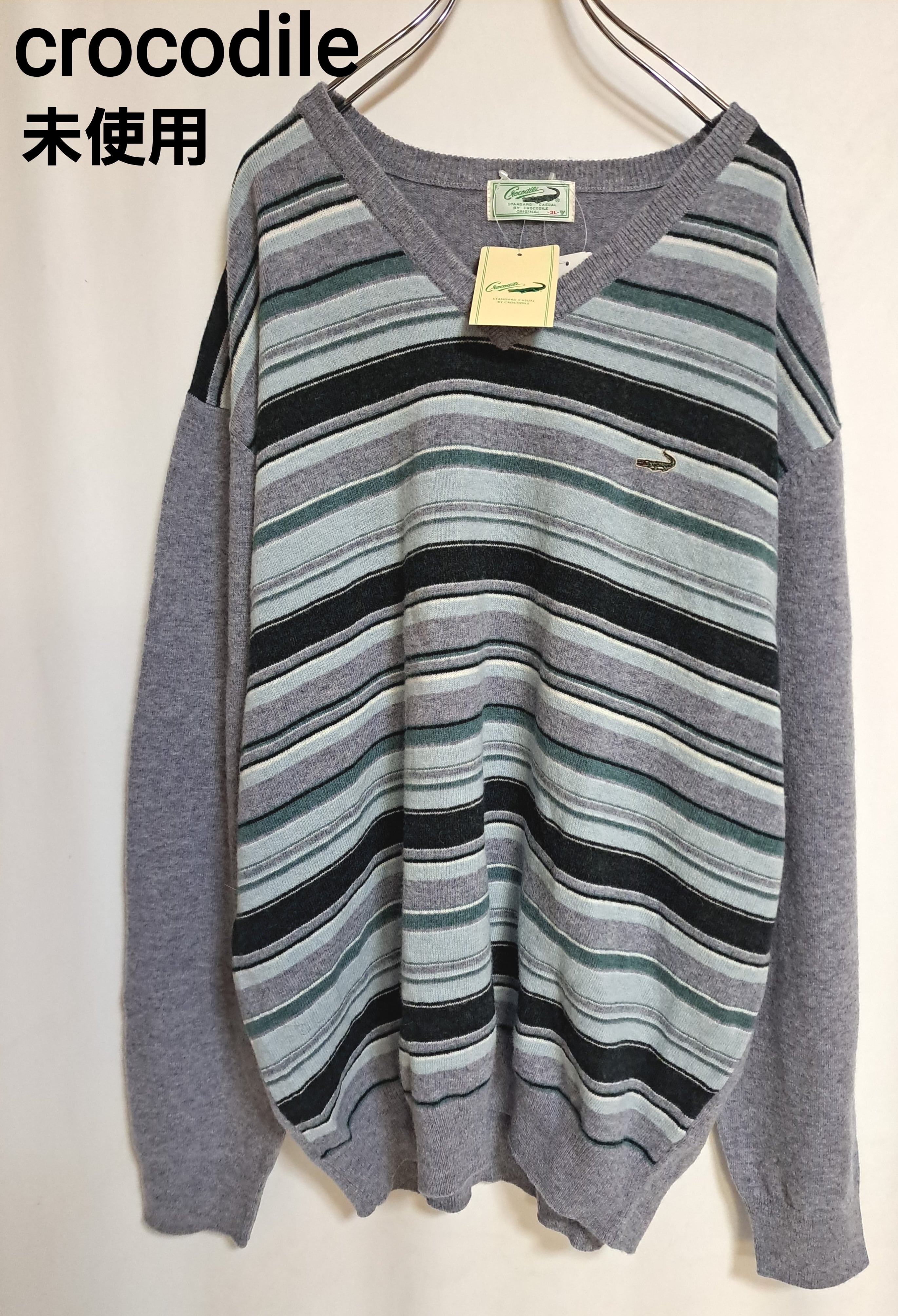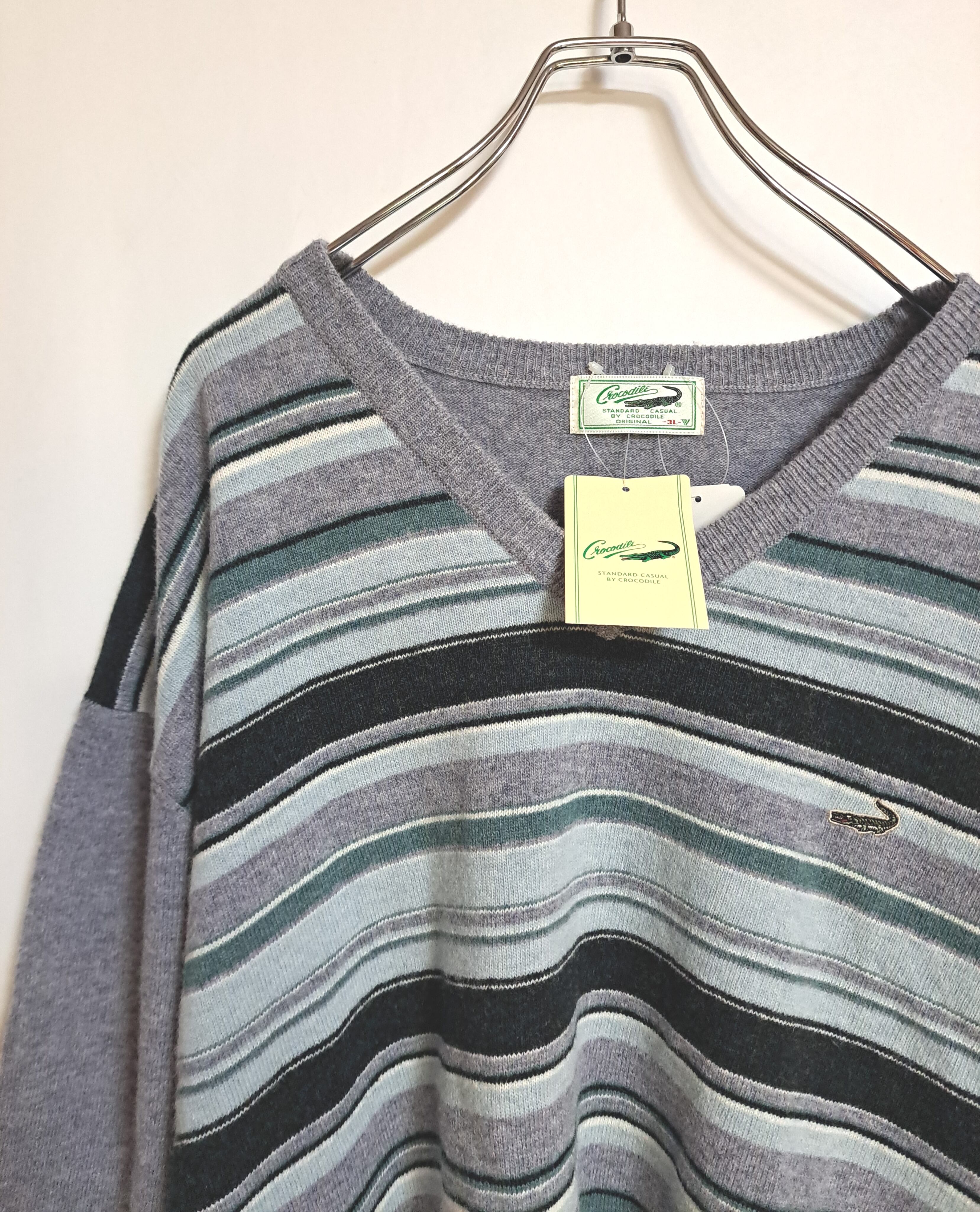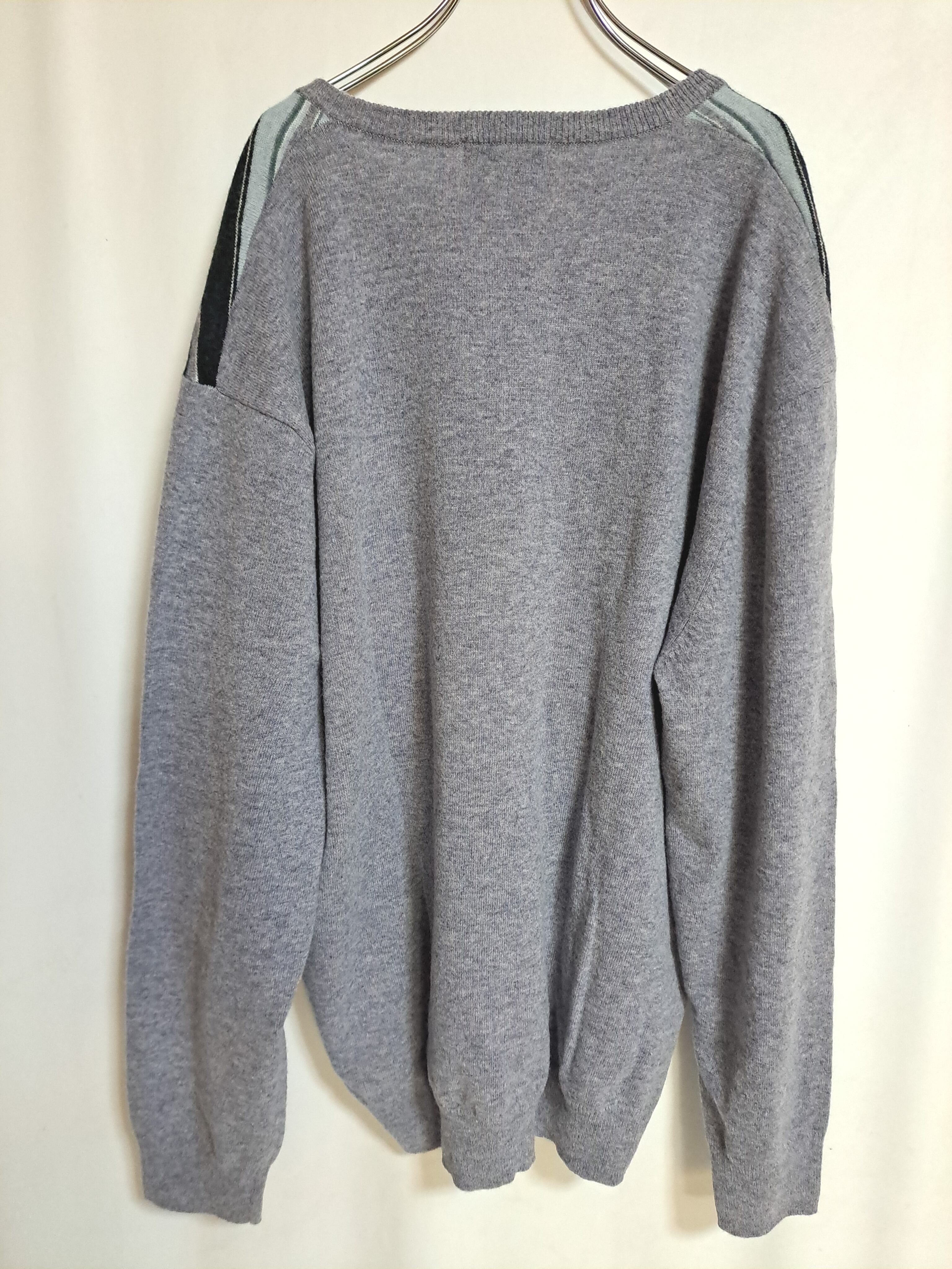 淡いグレーのカラーに、水色や白などのボーダーの入ったVネックニット。左胸にロゴ刺繍入り。サイズの割りには若干総丈が短めです。ウール混ですので、薄手でも温かいです。