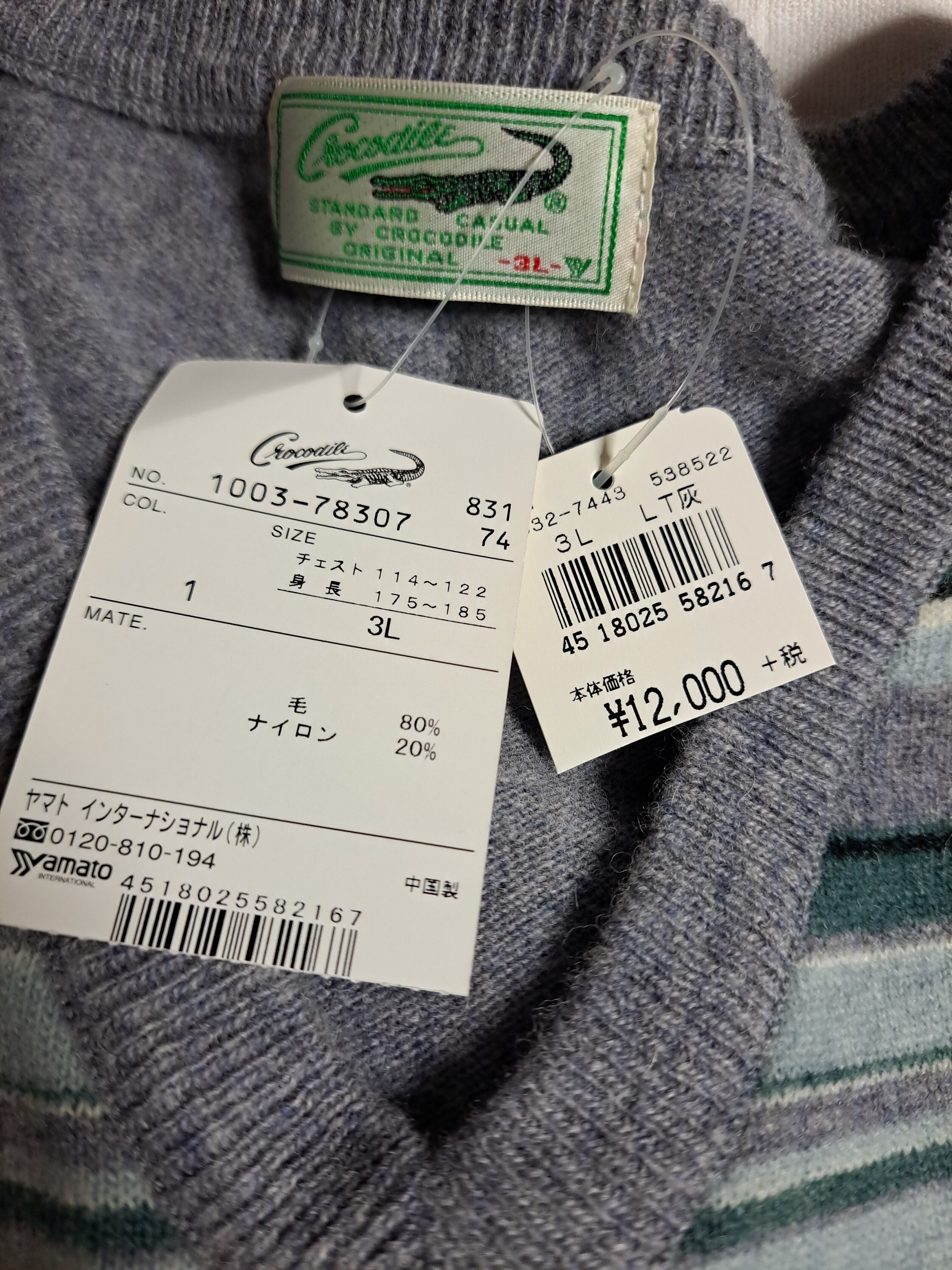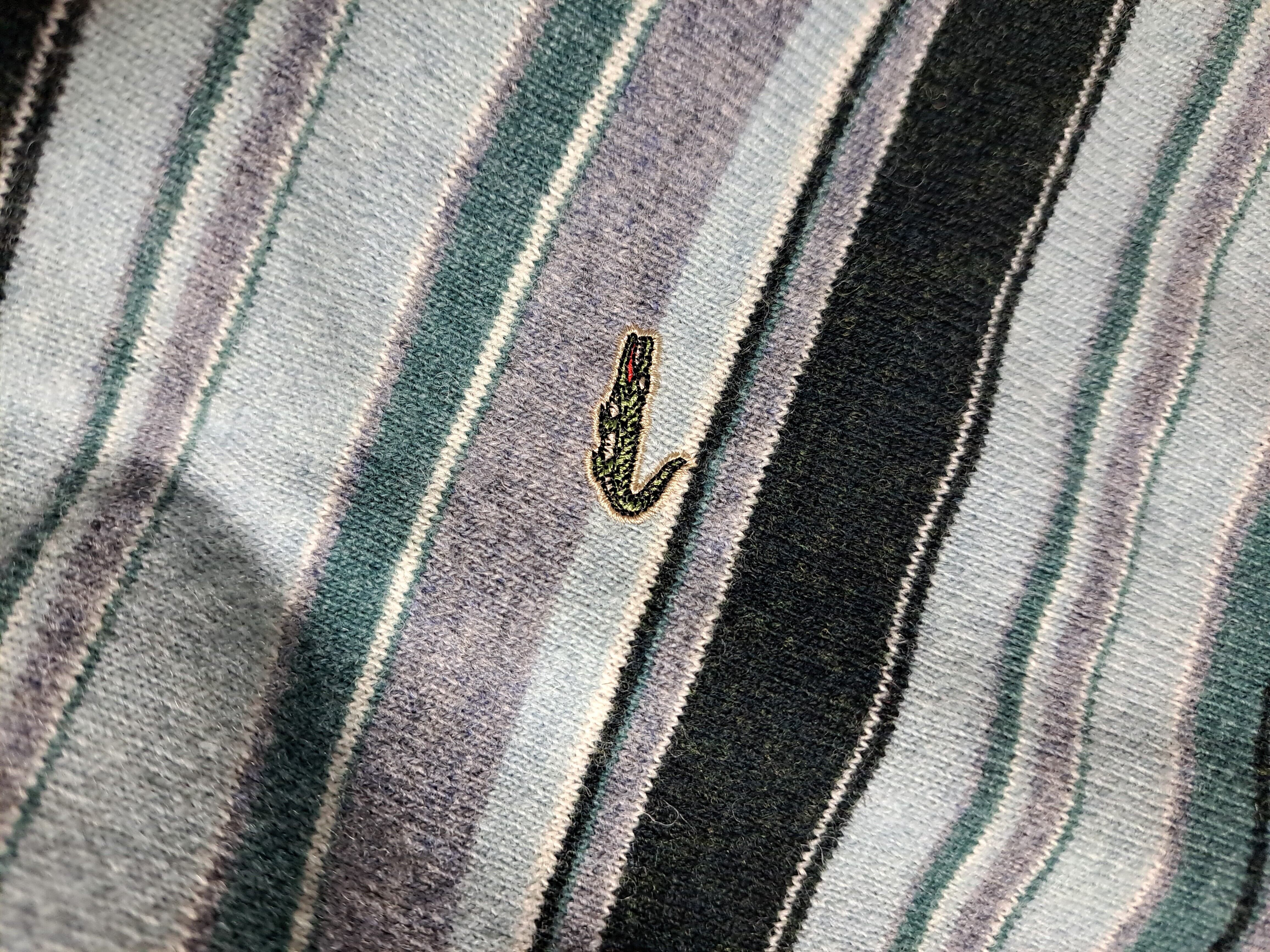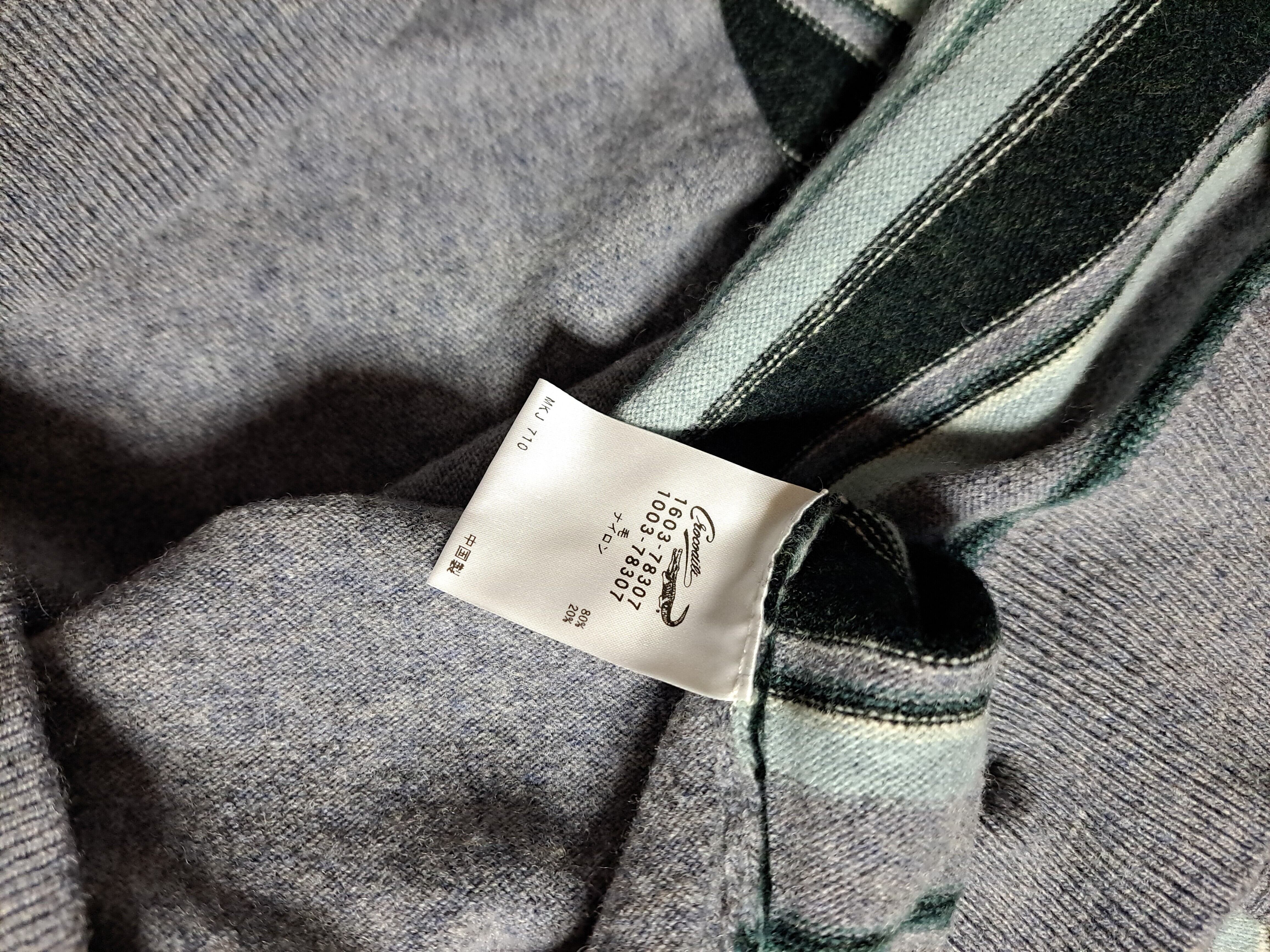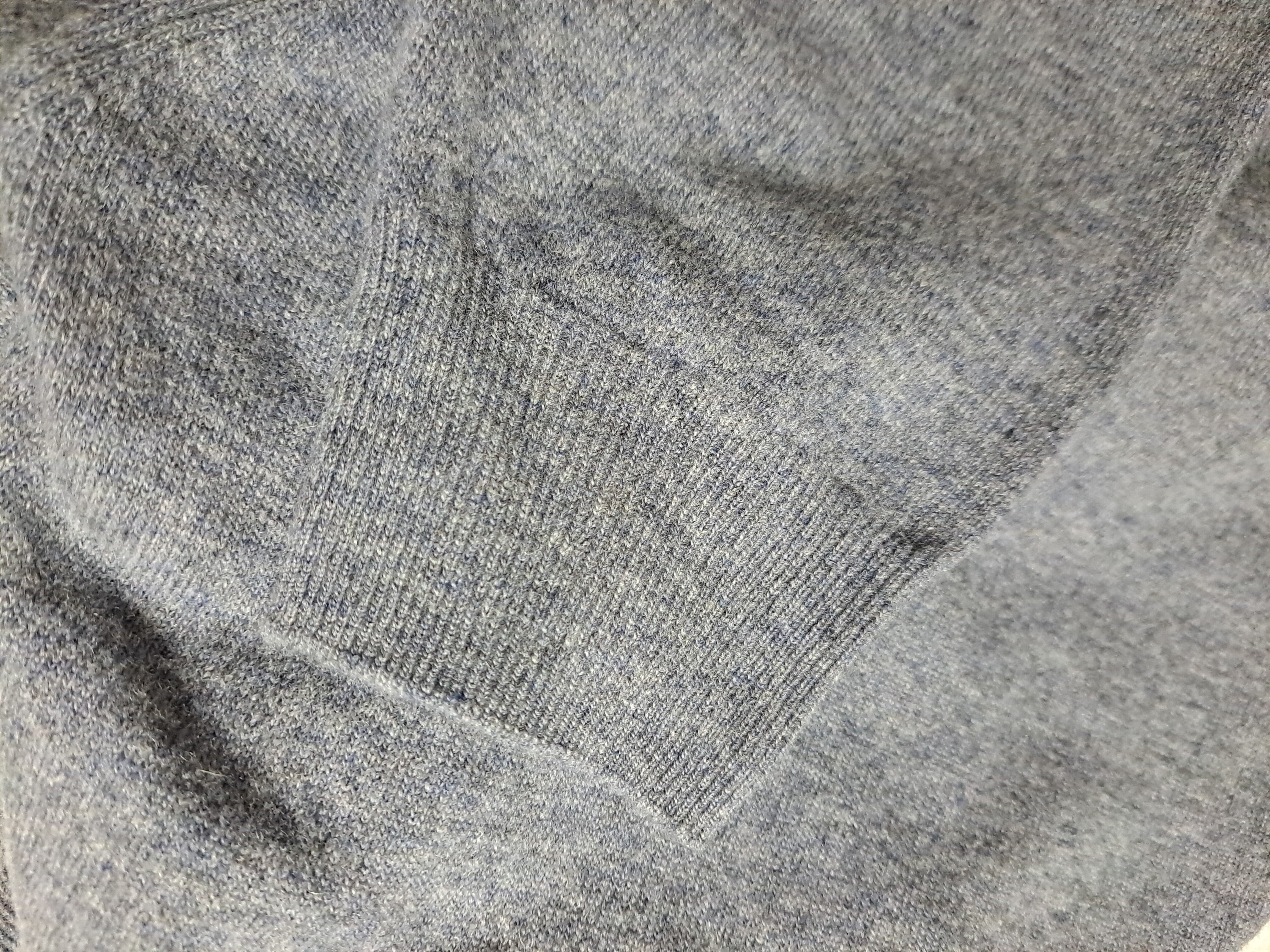 淡いグレーのカラーに、水色や白などのボーダーの入ったVネックニット。左胸にロゴ刺繍入り。サイズの割りには若干総丈が短めです。ウール混ですので、薄手でも温かいです。