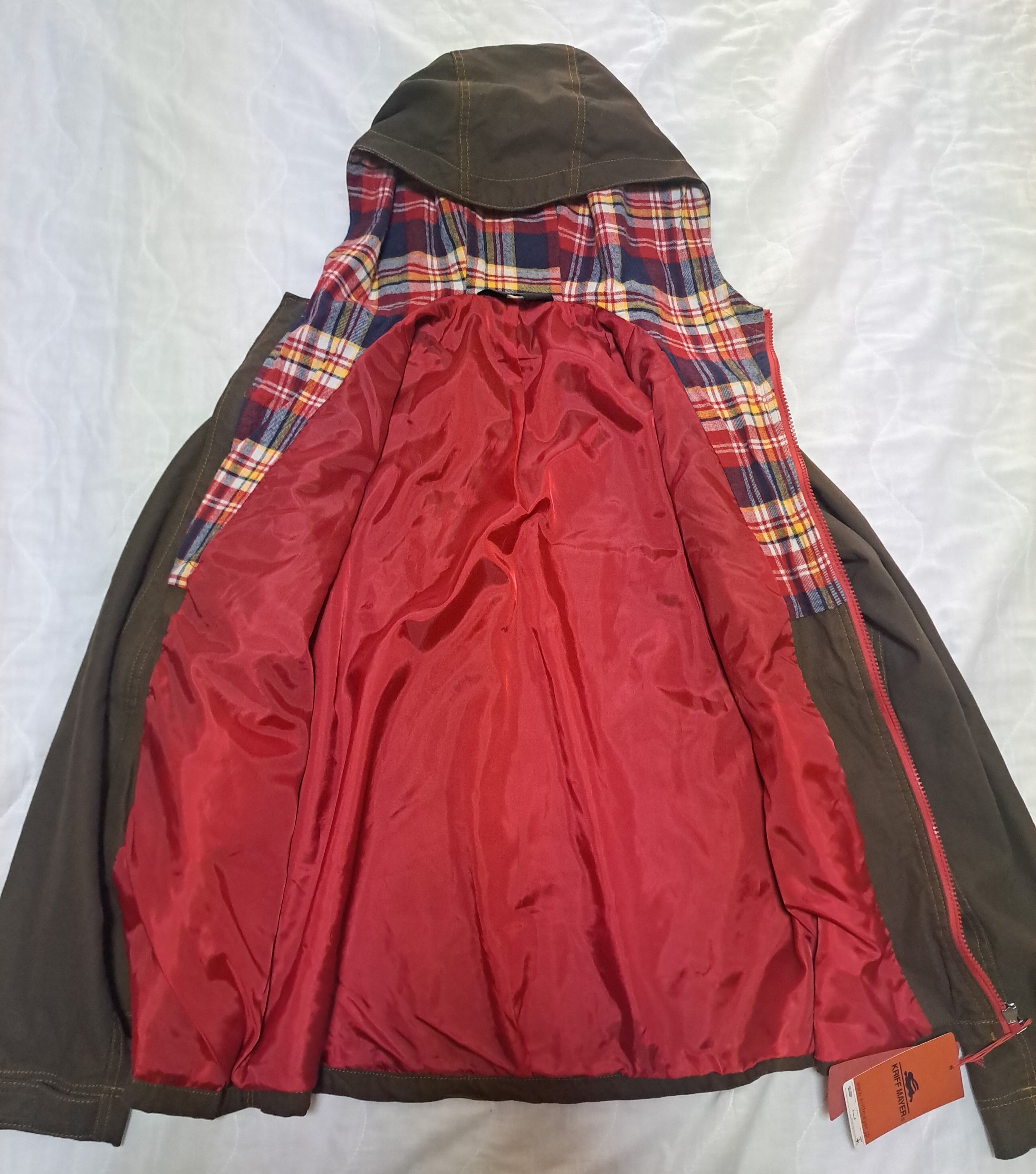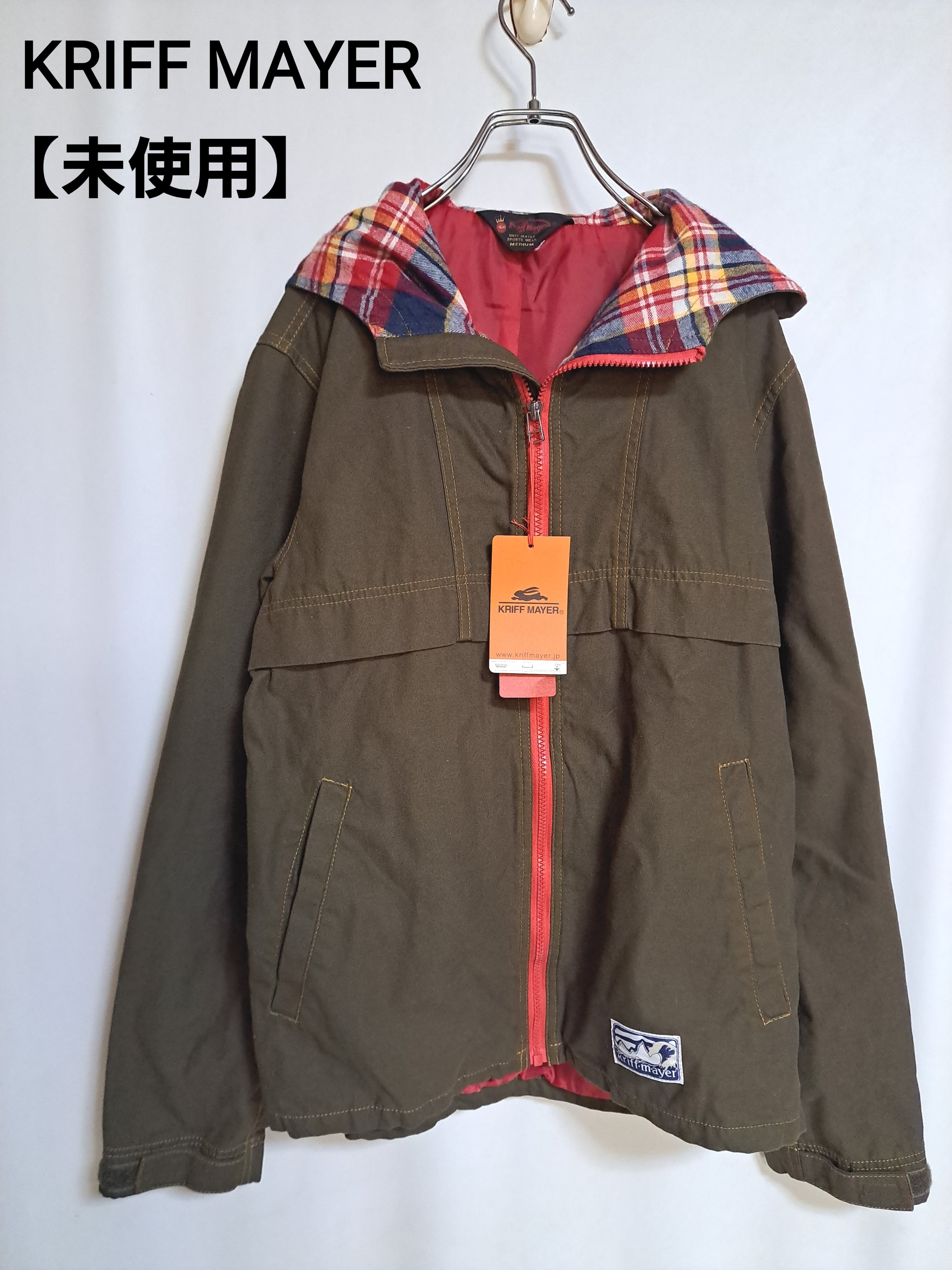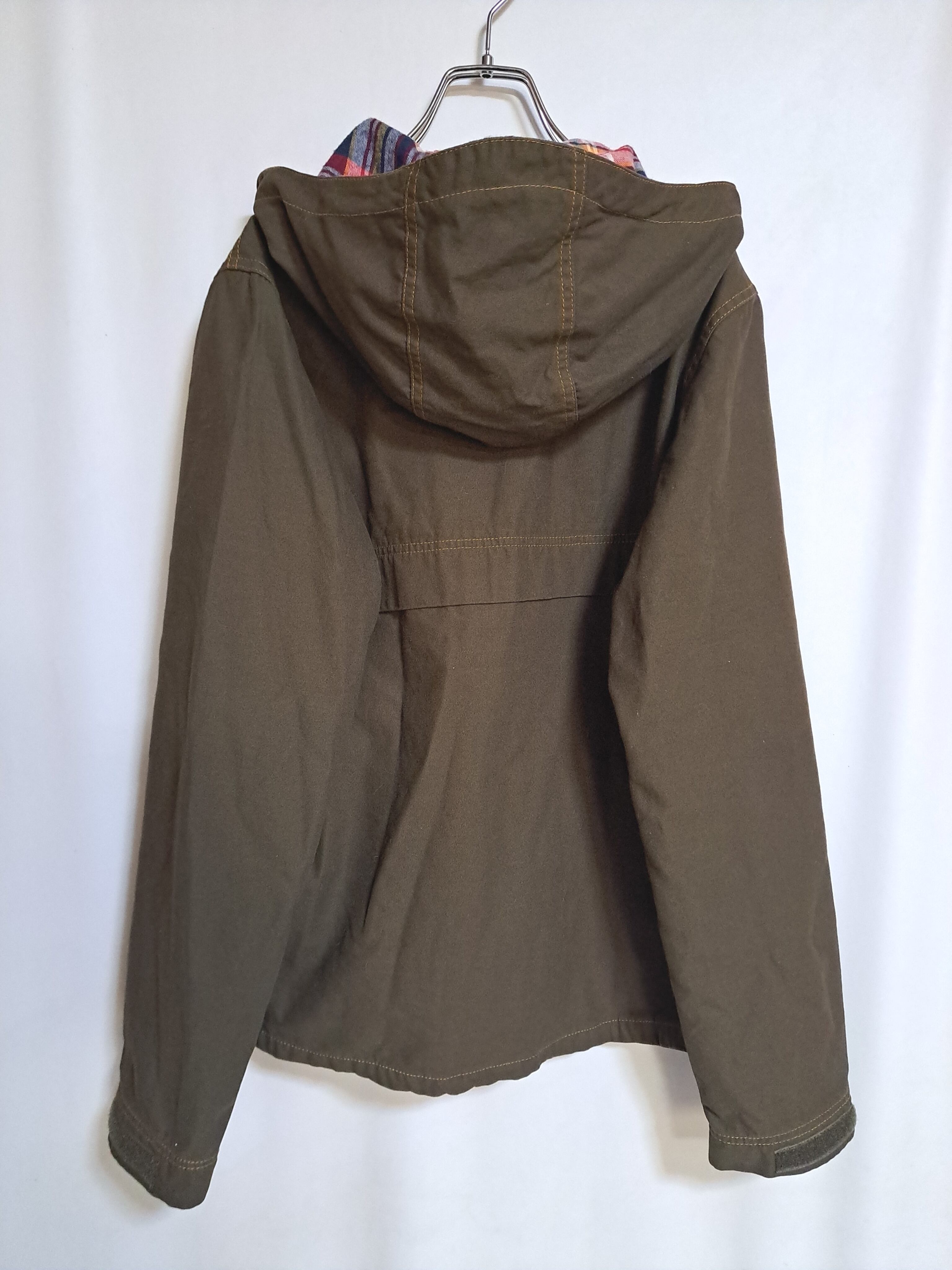 フード一体型のマウンテンパーカー。フード裏などがうっすら起毛のあるチェック柄になっています。袖口はマジックテープで調節可能。ポケットは合計2つ。中綿はありませんが、しっかりした固めの生地です。