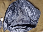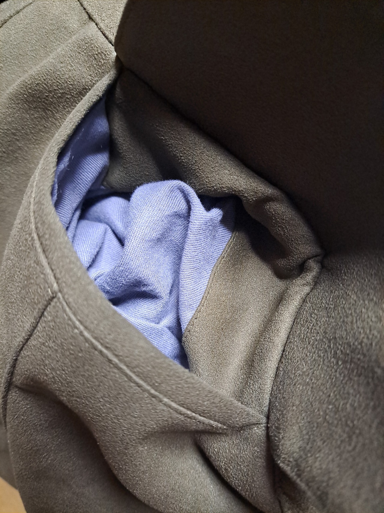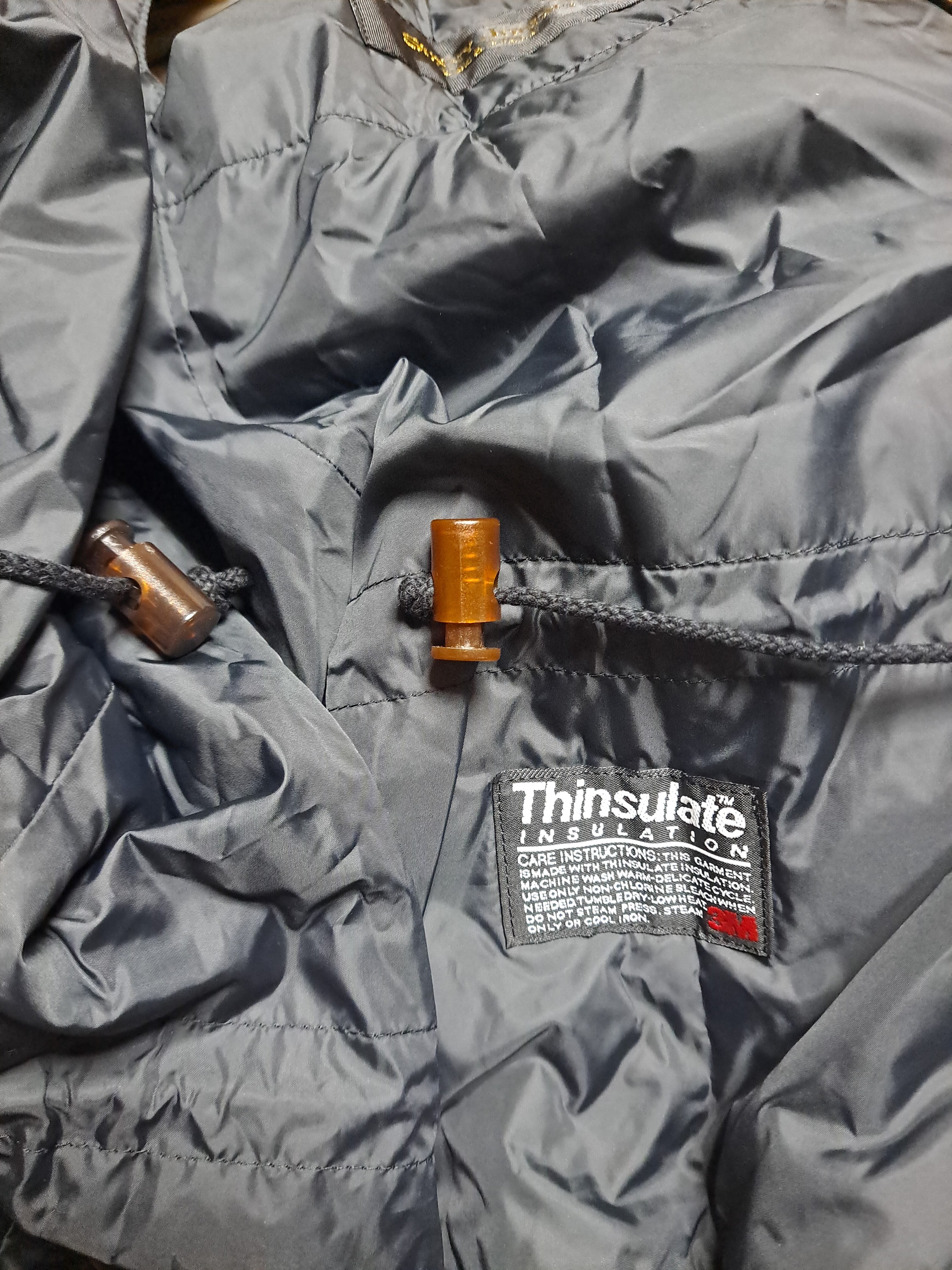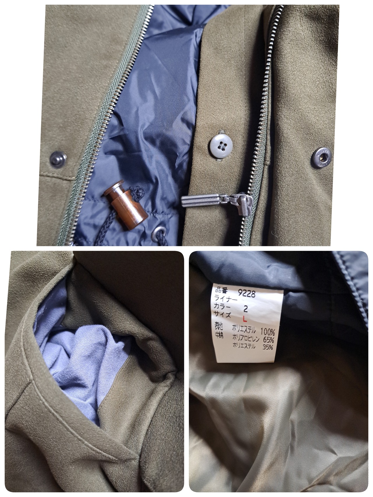 本体の生地はスウェード風のもったりした感触です。ライナーの裾付近はドローコードで絞れます。フードはマジックテープで薄いフードを丸めて収納可能(5枚目の写真参照)。