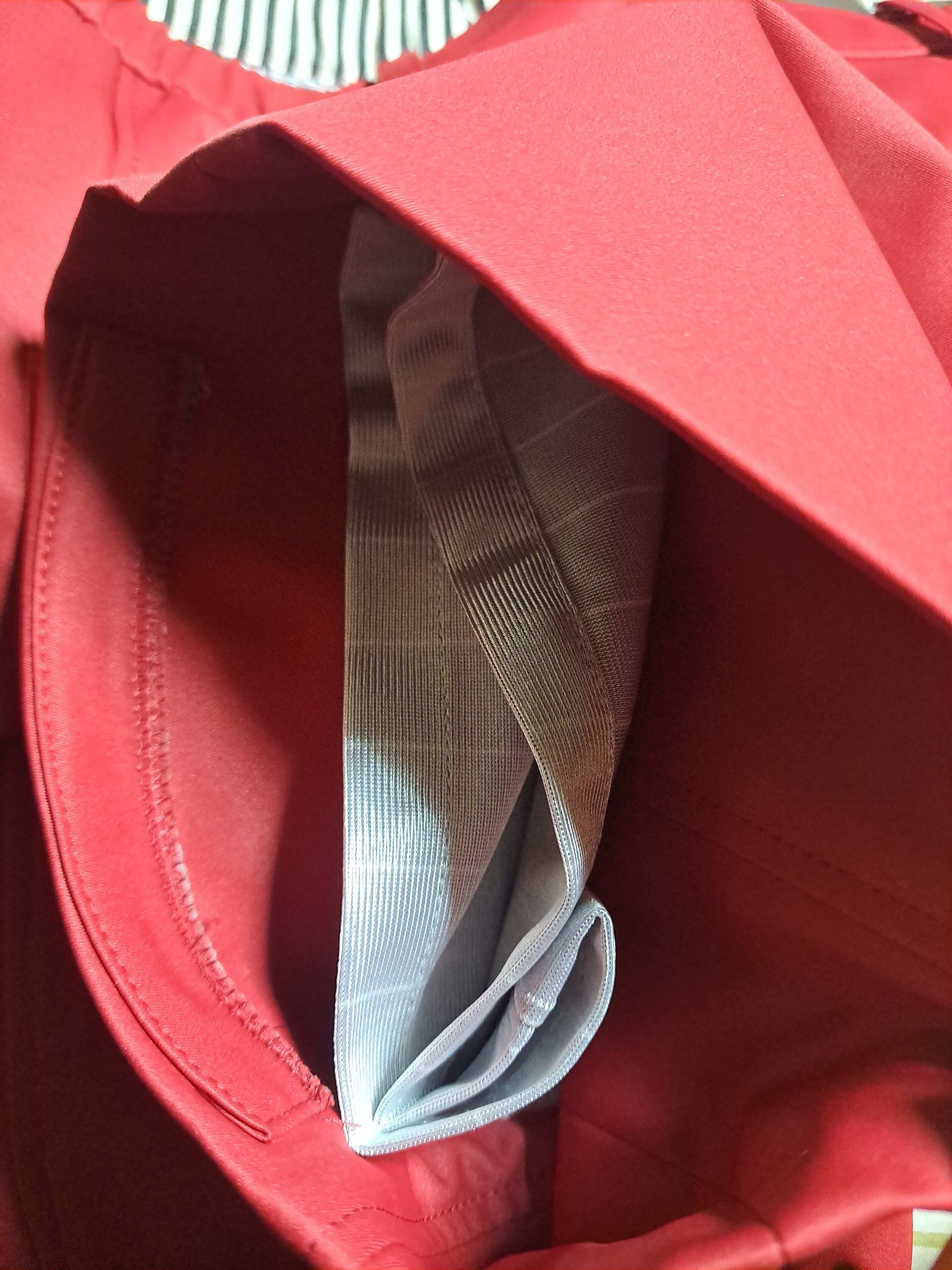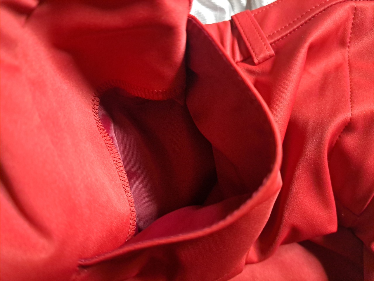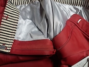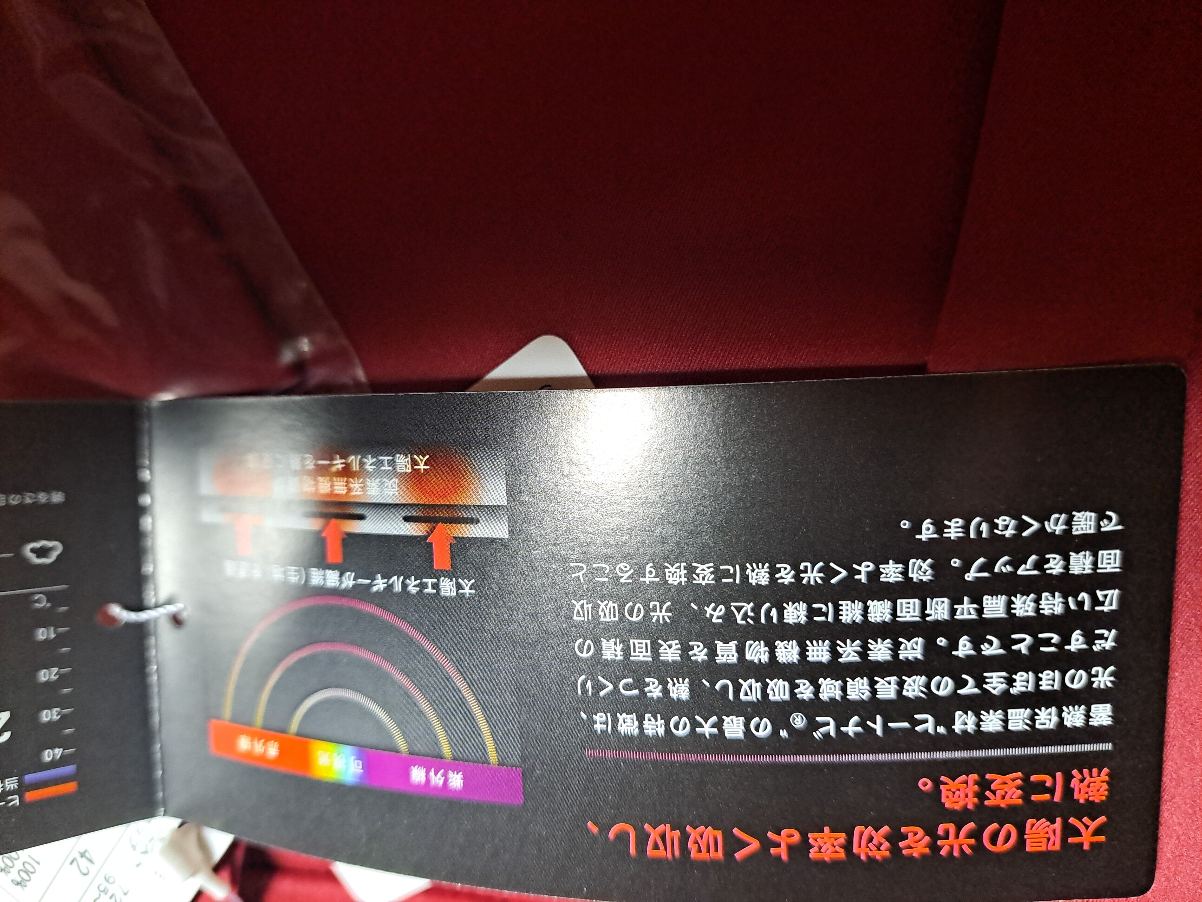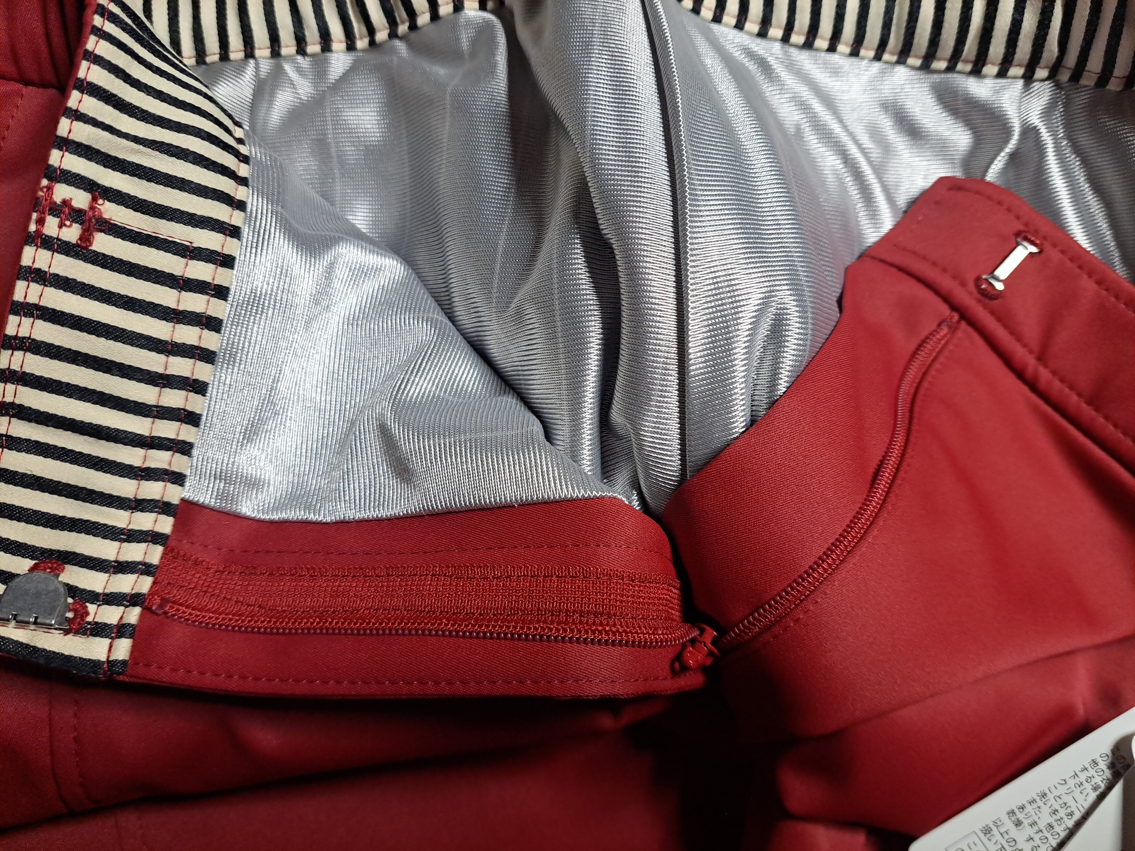 裏地が蓄熱素材、スニード仕様で温かいパンツ。くすみカラーの赤い落ち着いた色で、フロントはホック式です。