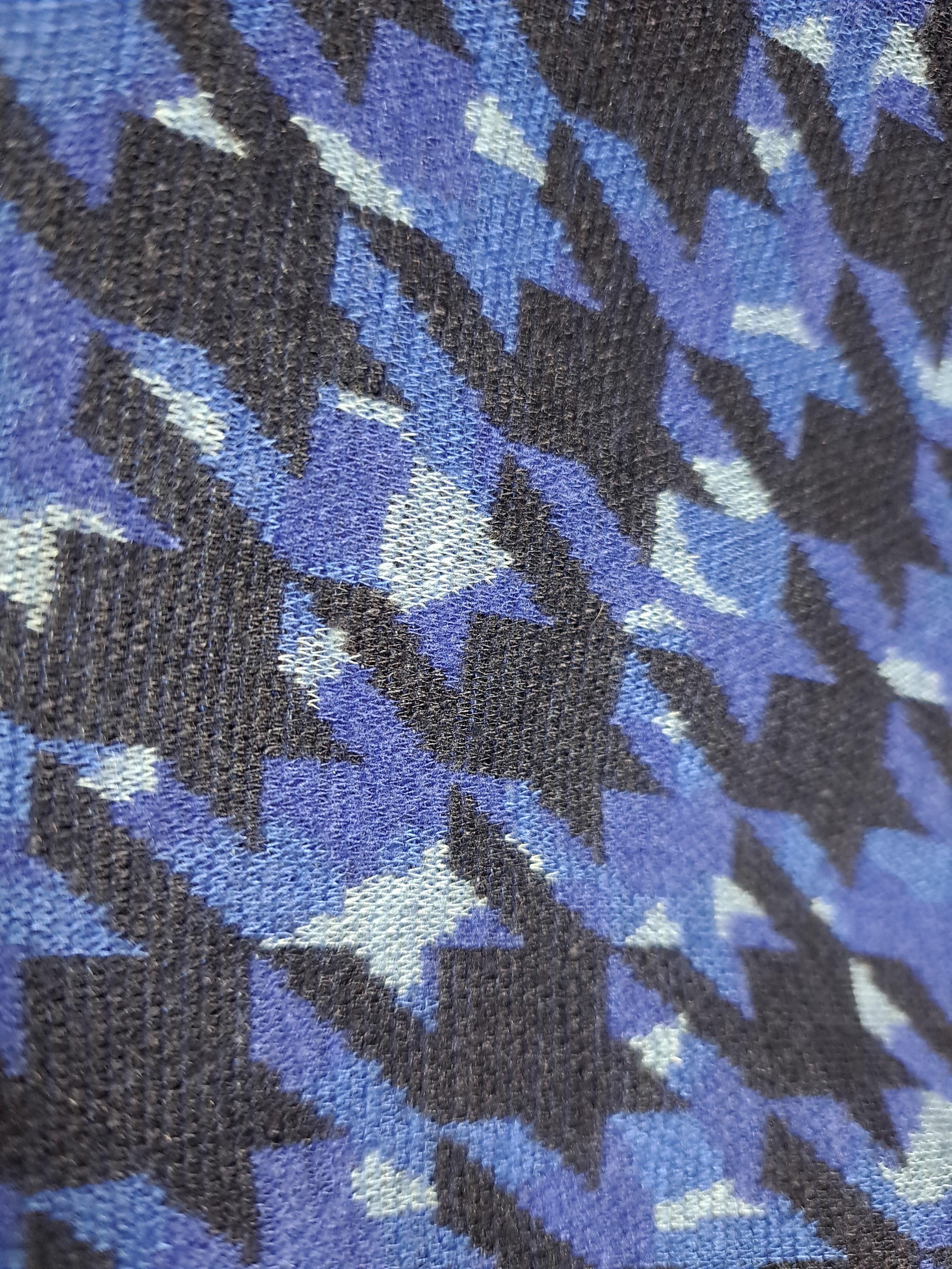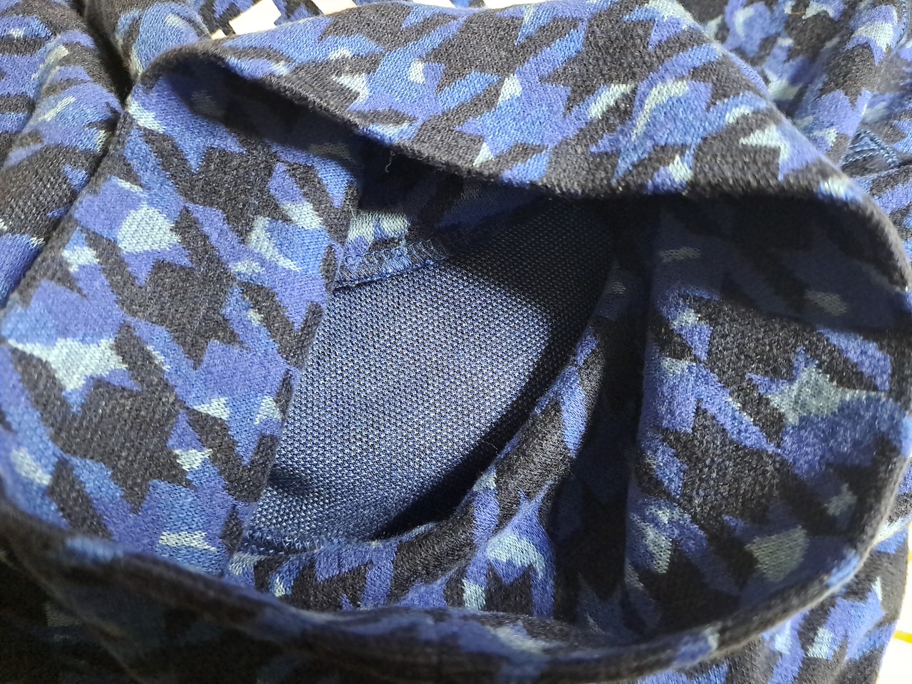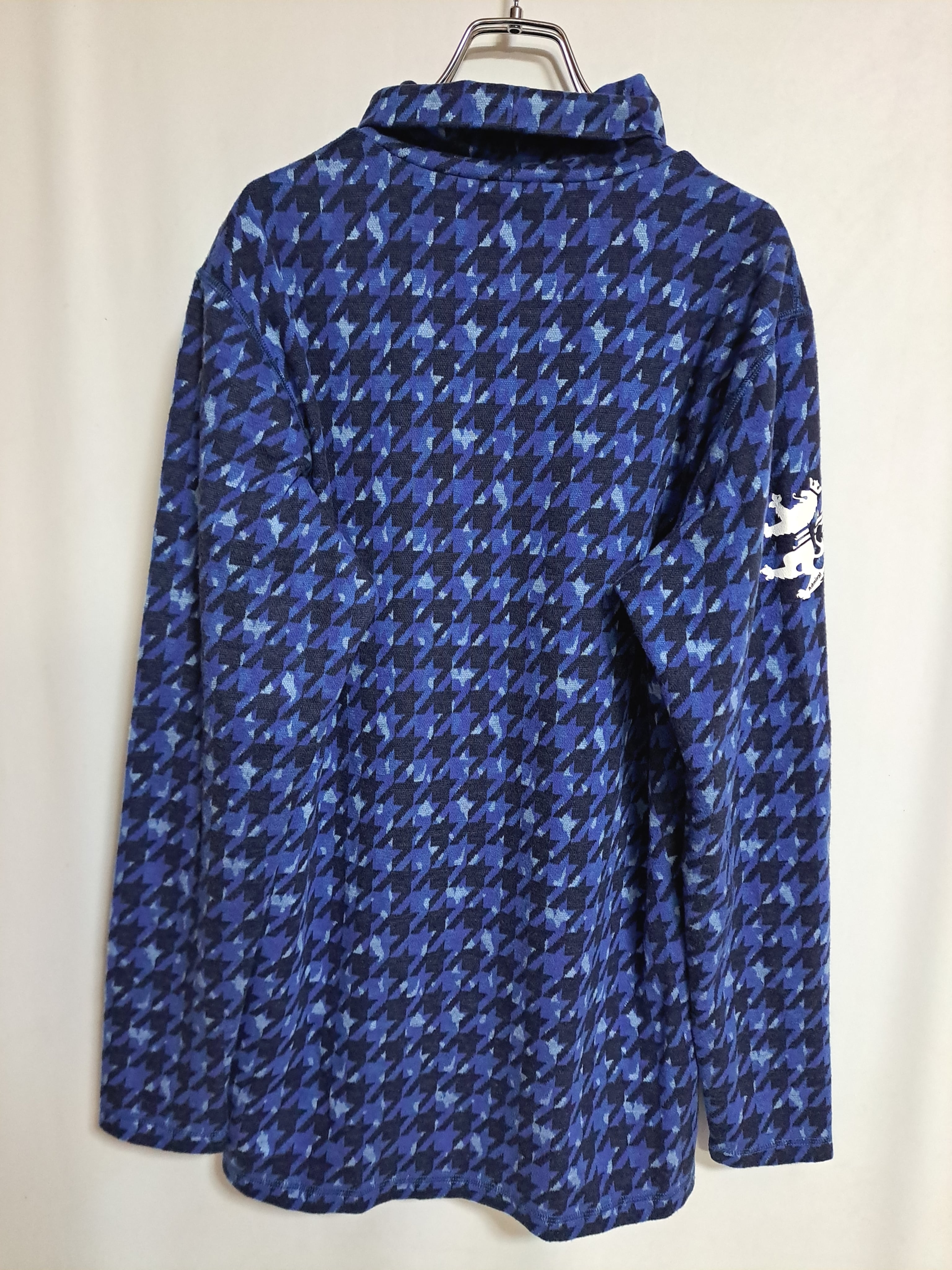 ブルー、ネイビー基調の千鳥格子柄。フロントと右アームにロゴプリント入り。生地は特性上毛羽立ちができやすいですが、プリントは割れなく綺麗です。日本製。