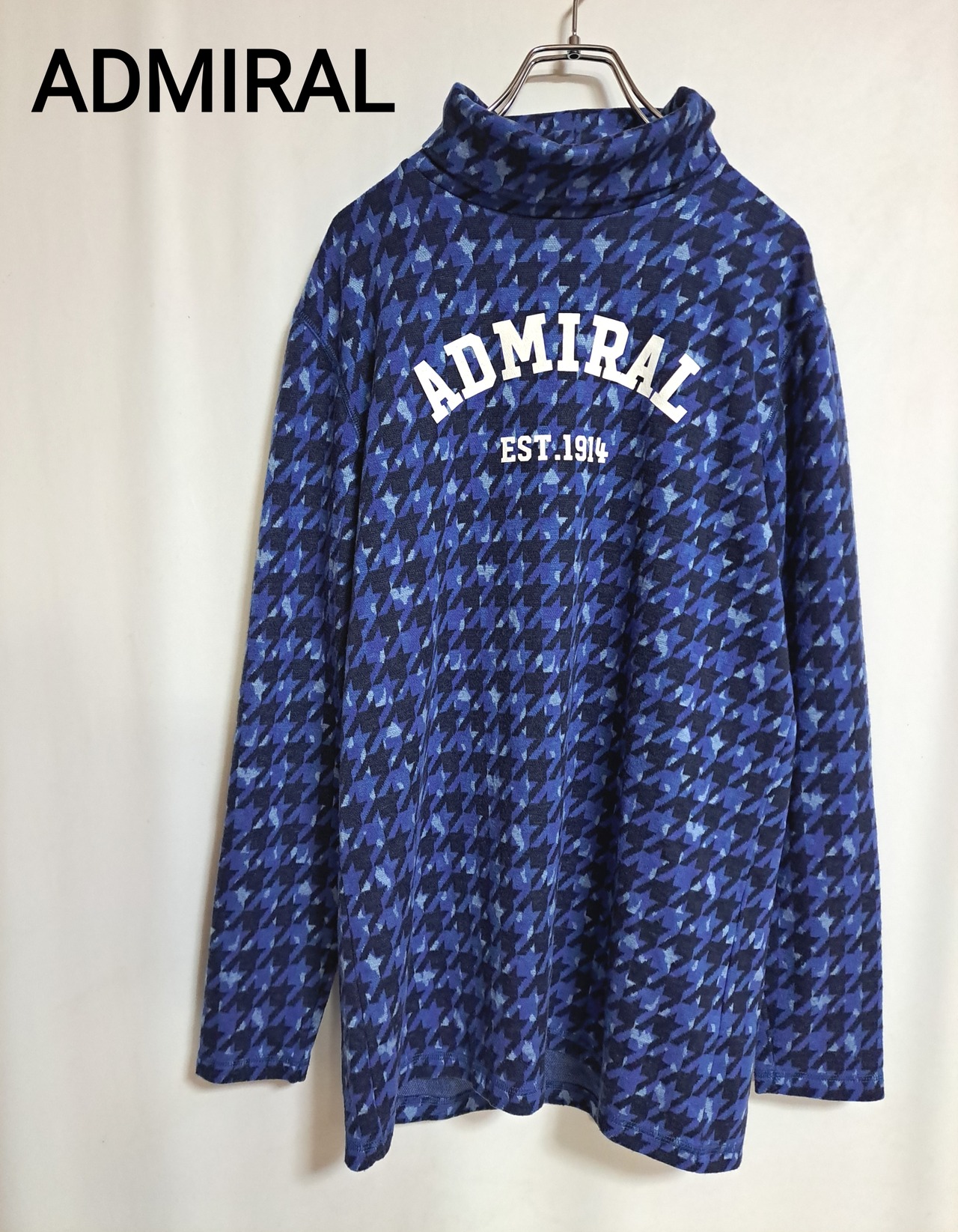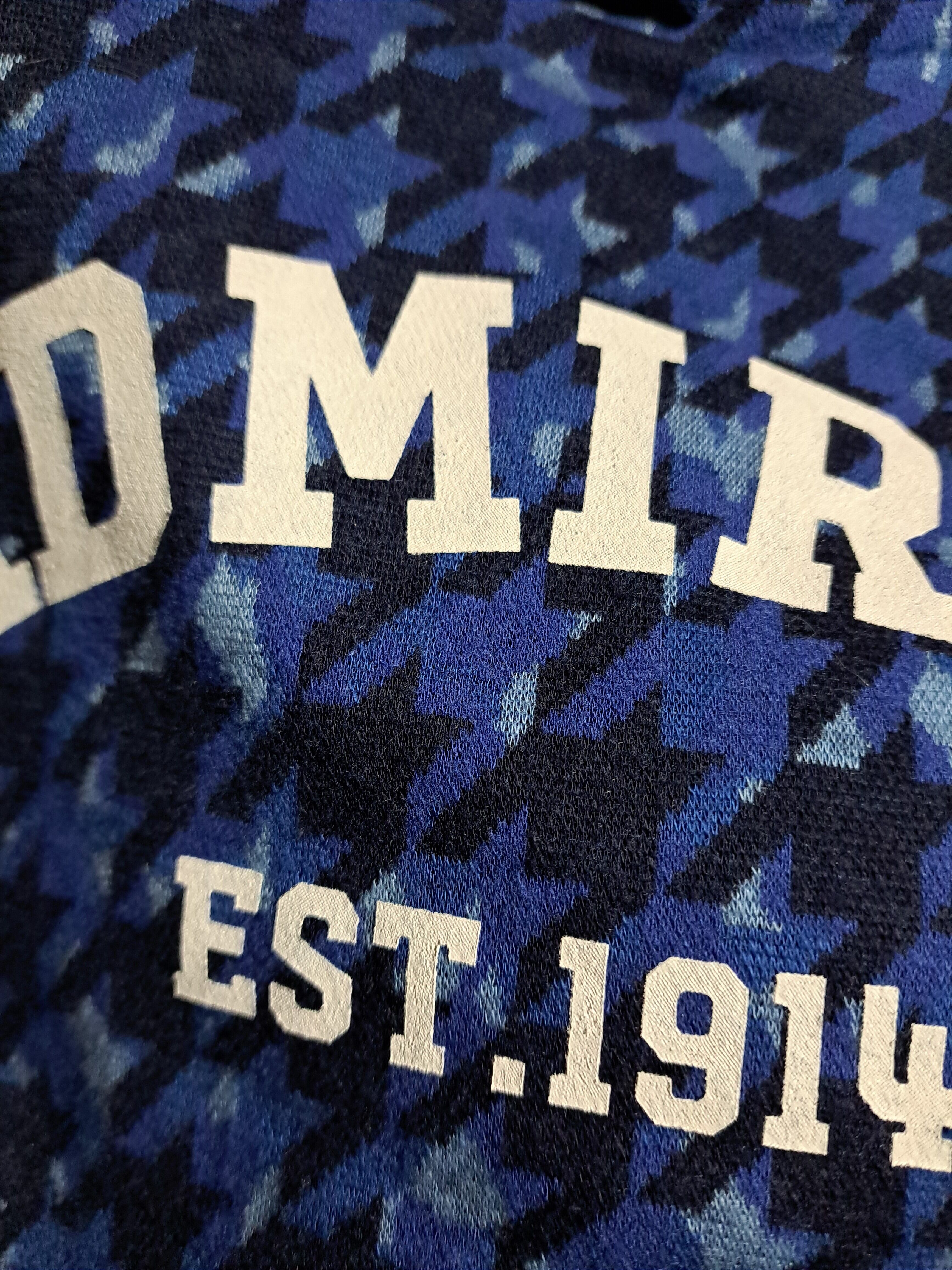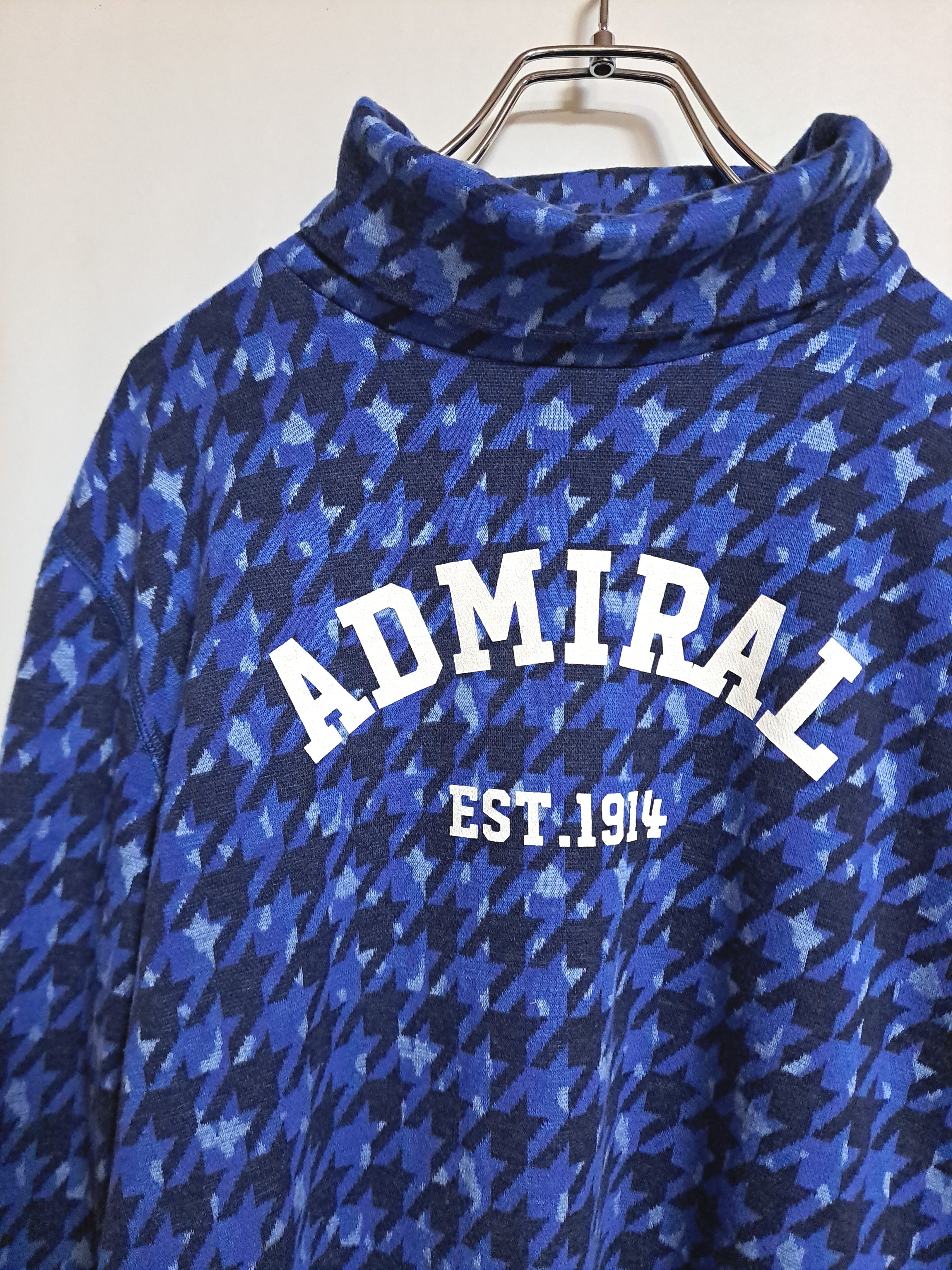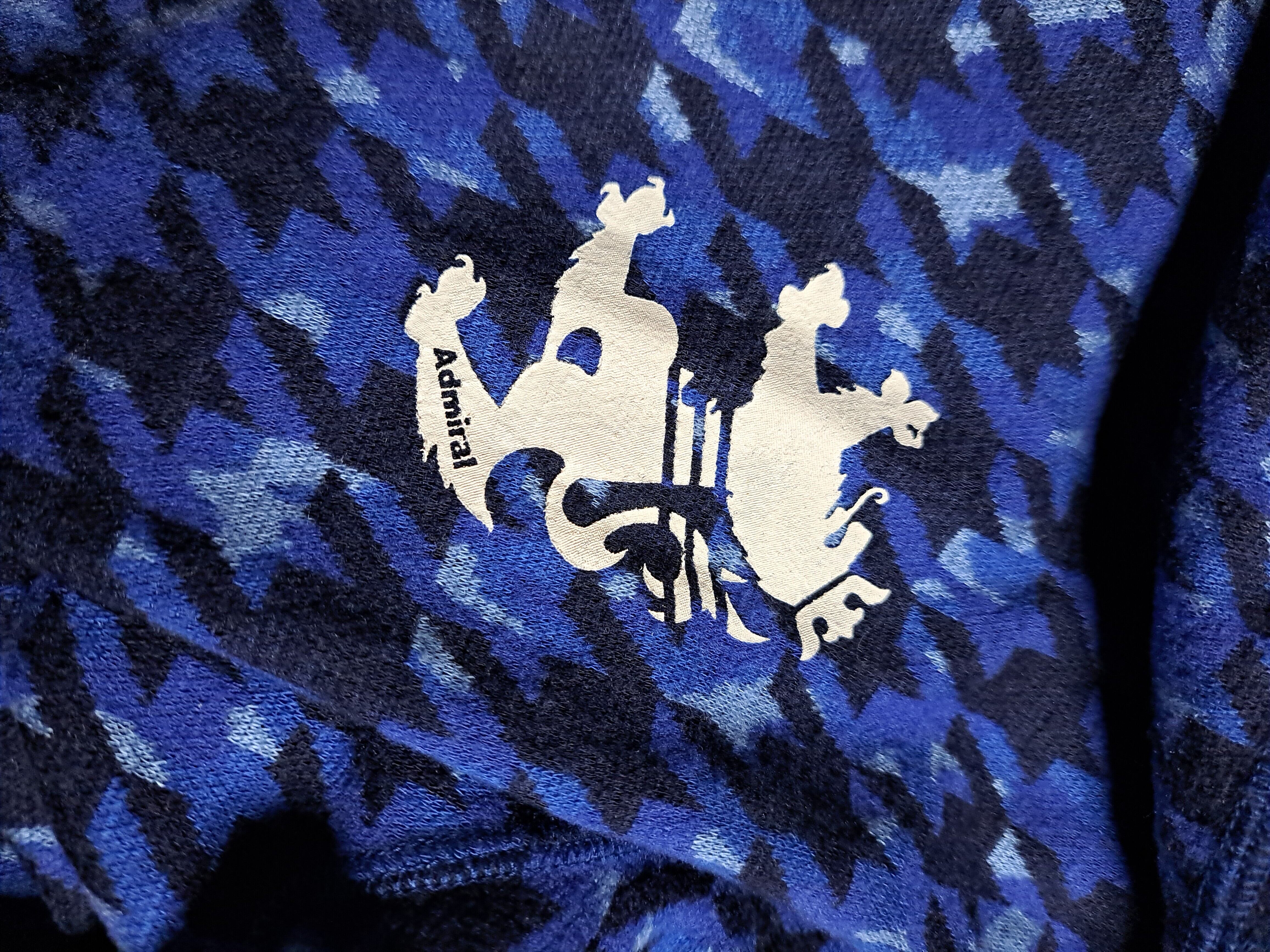 ブルー、ネイビー基調の千鳥格子柄。フロントと右アームにロゴプリント入り。生地は特性上毛羽立ちができやすいですが、プリントは割れなく綺麗です。日本製。