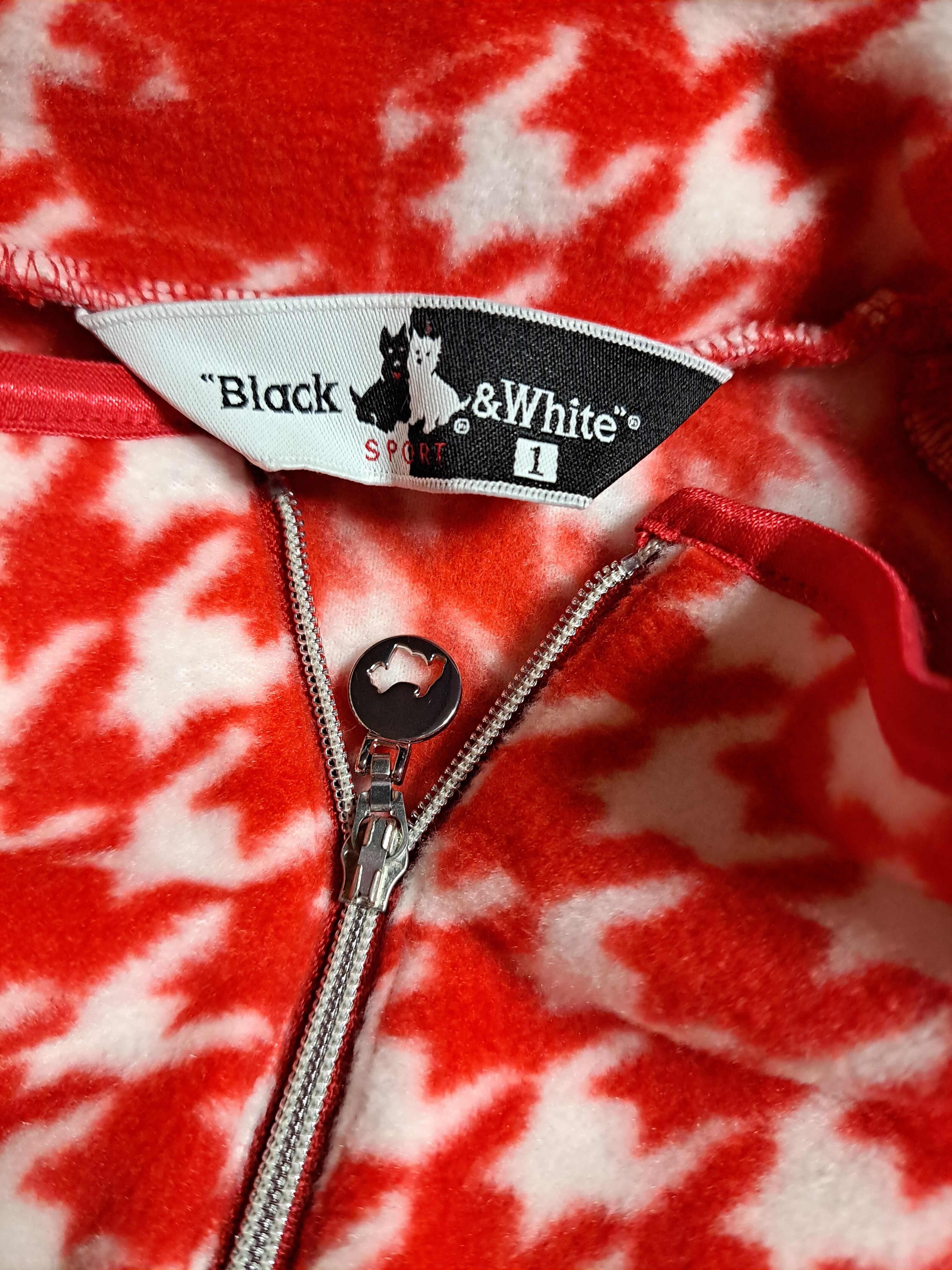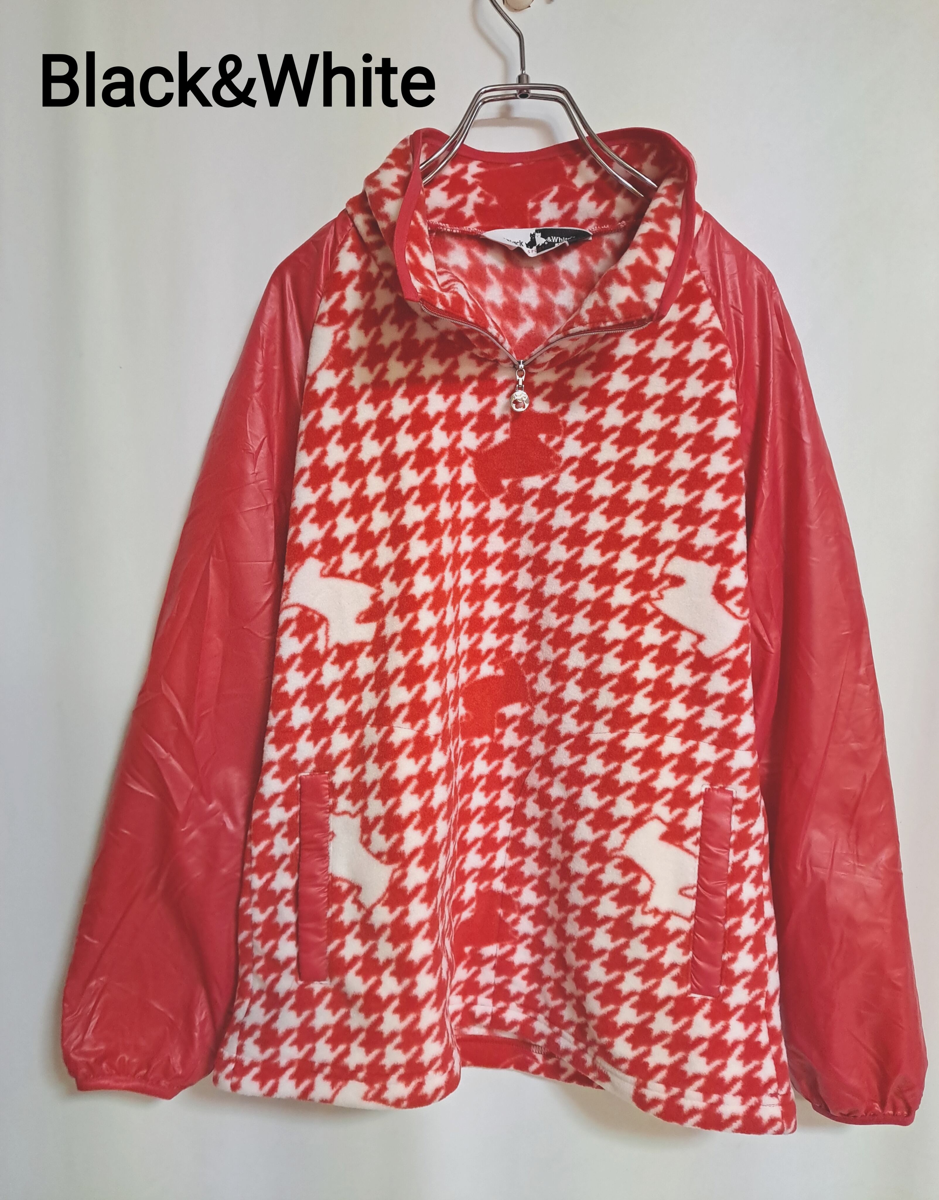 紅白のハウンドトゥース柄と、フロントの犬のチャーム風持ち手が可愛い、ラグランスリーブのハーフジッププルオーバー。