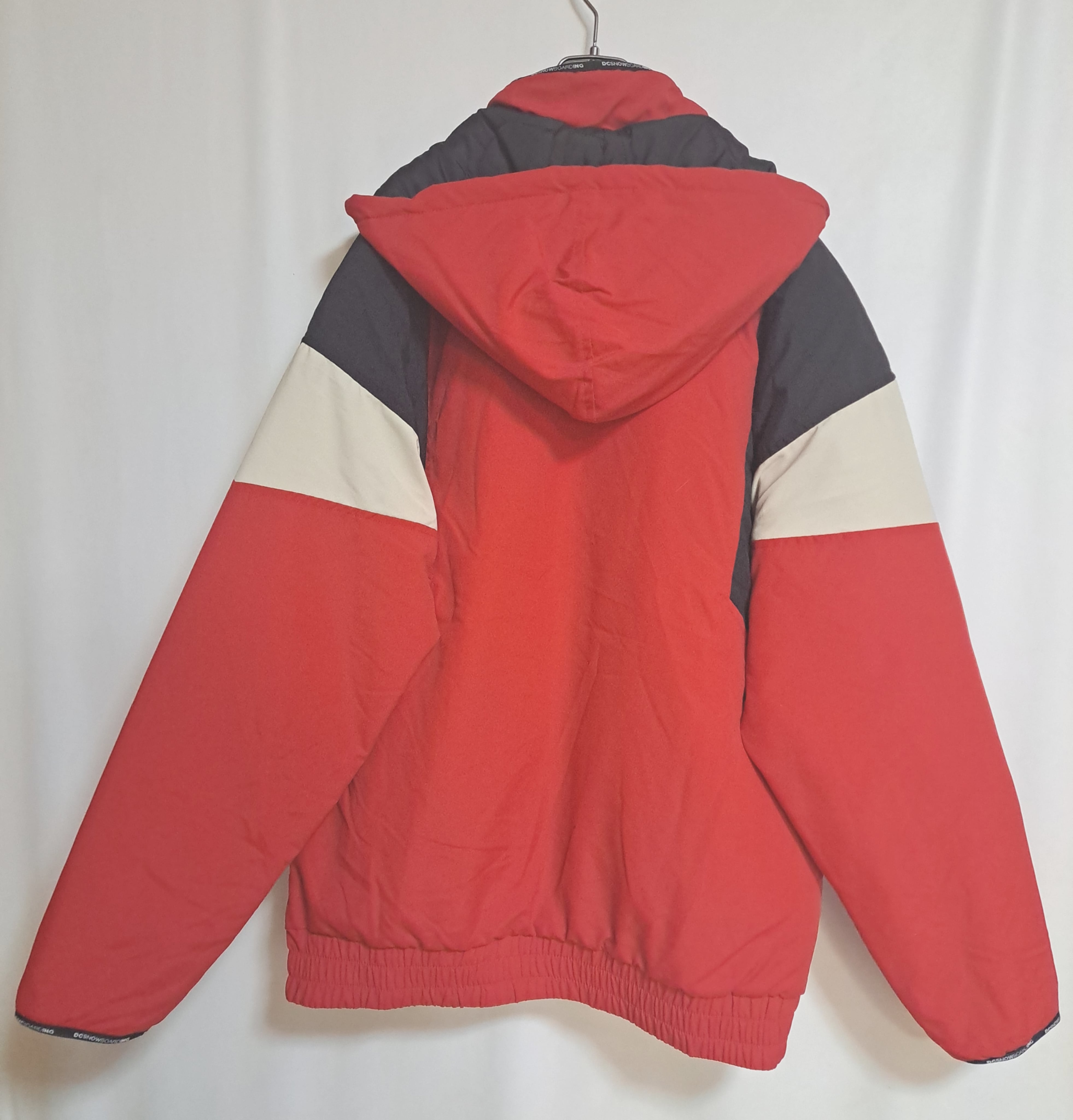 フード一体型のハーフジップ、アノラックパーカー。中綿入りで暖かいです。片側にファスナーが付いたタイプ。