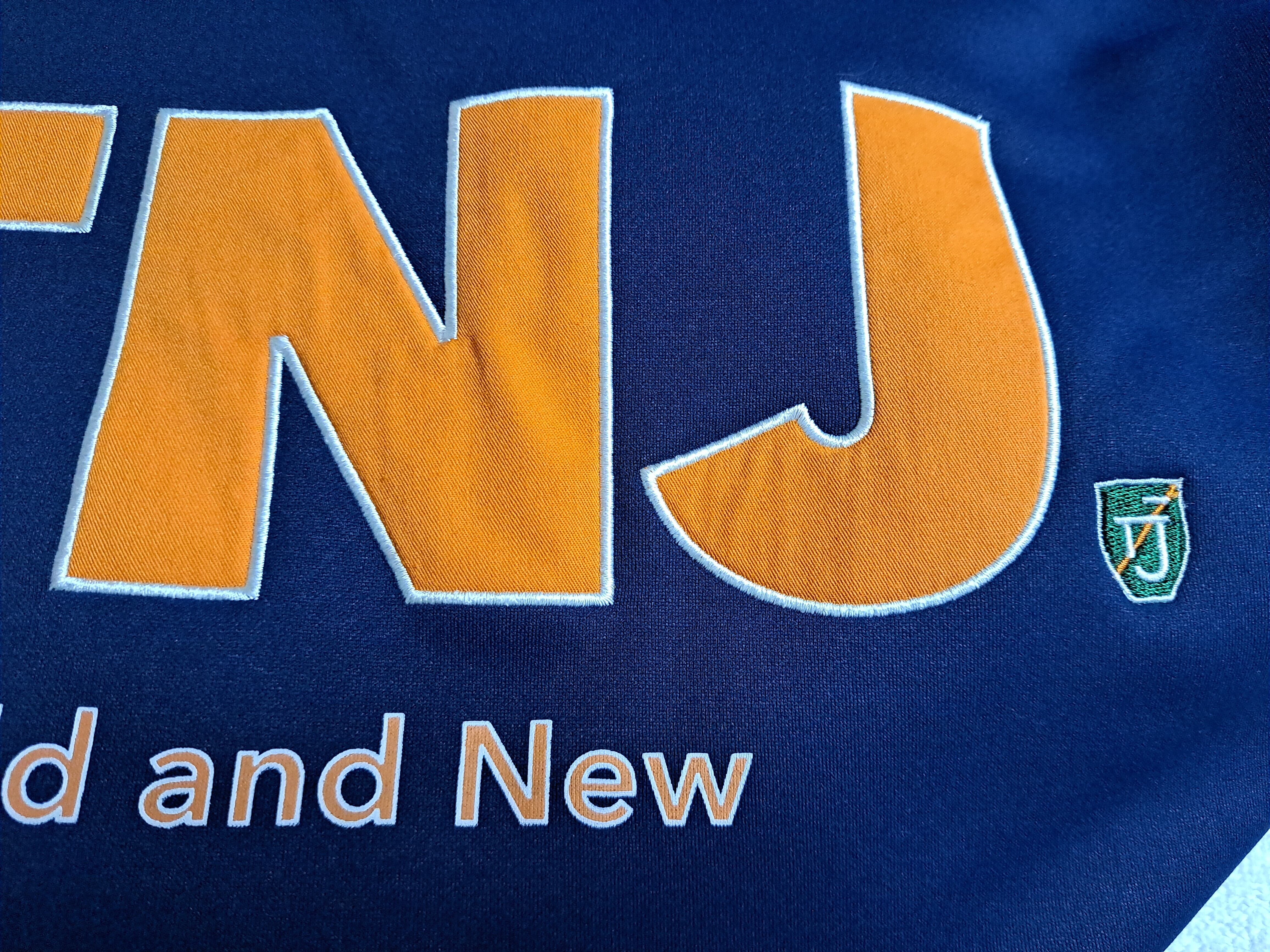 裏起毛で暖かいトレーナー。やや光沢のある紺色ボディに映えるオレンジ色のロゴと、さりげない刺繍やプリントも魅力的☆