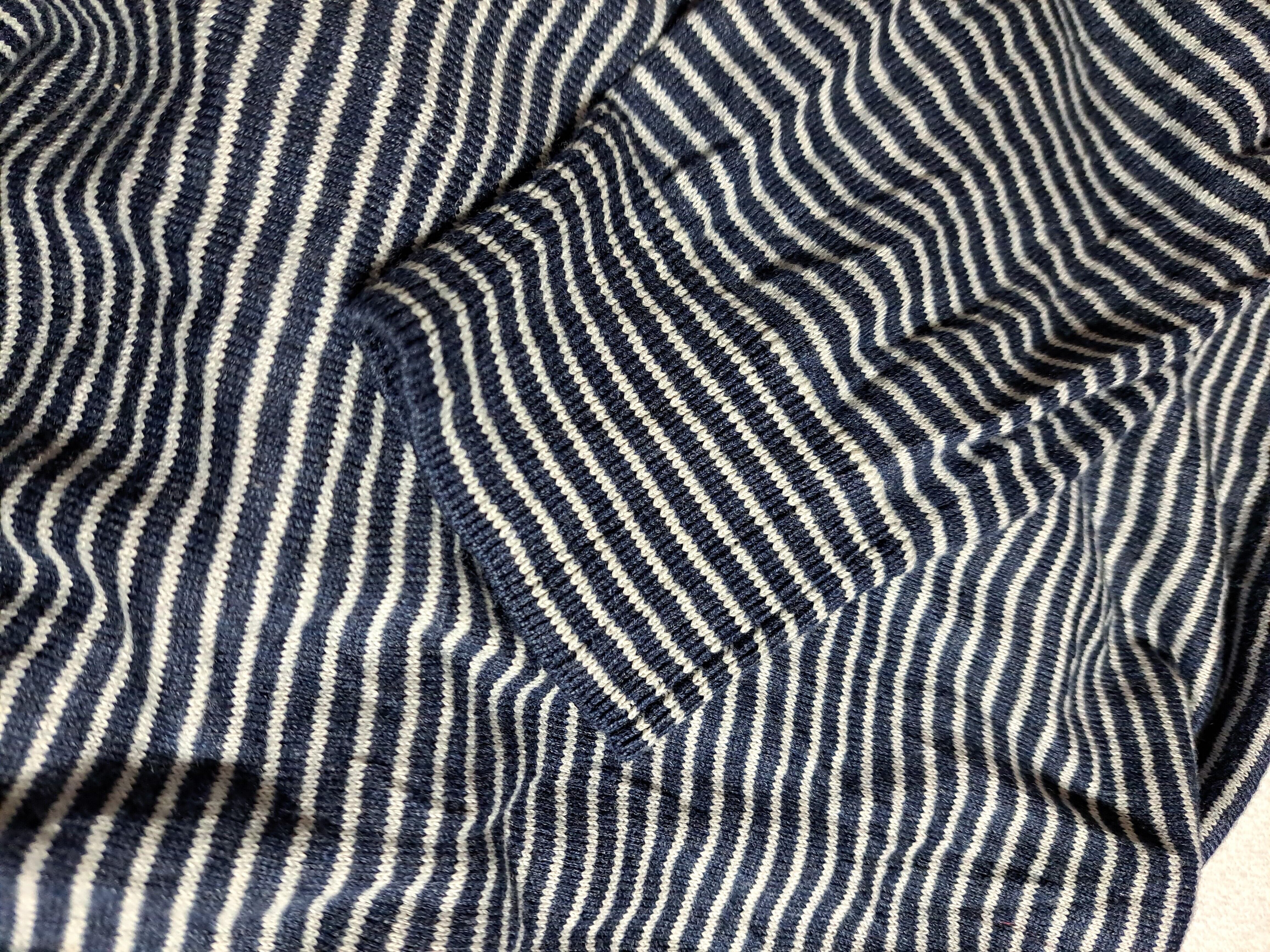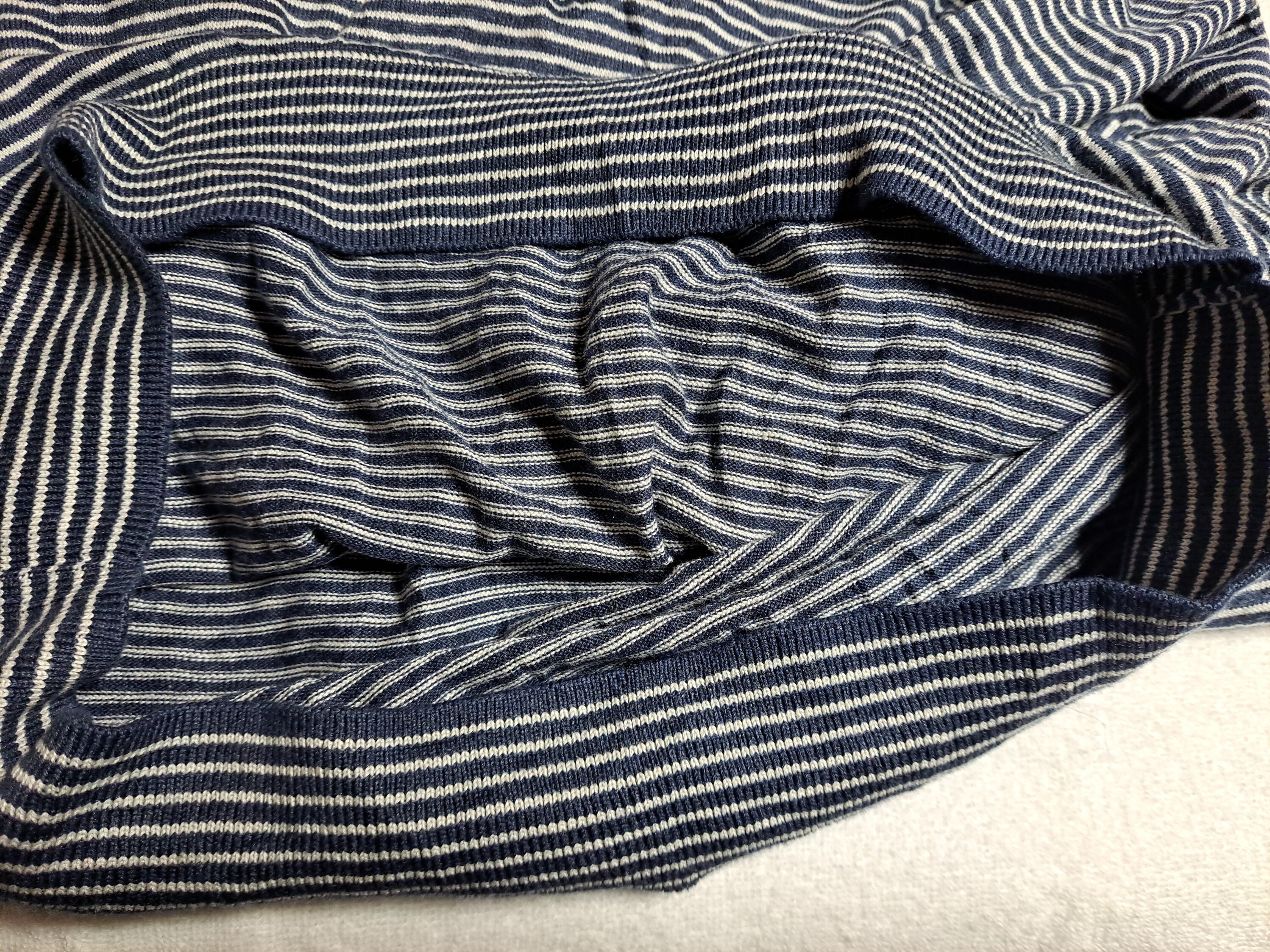 コットンとモダール地でできた、柔らかな感触の薄手ニット。左胸に緑色でロゴ刺繍入り。ユニセックスで着用でき、且つ合わせやすい紺と白の細ボーダー柄。