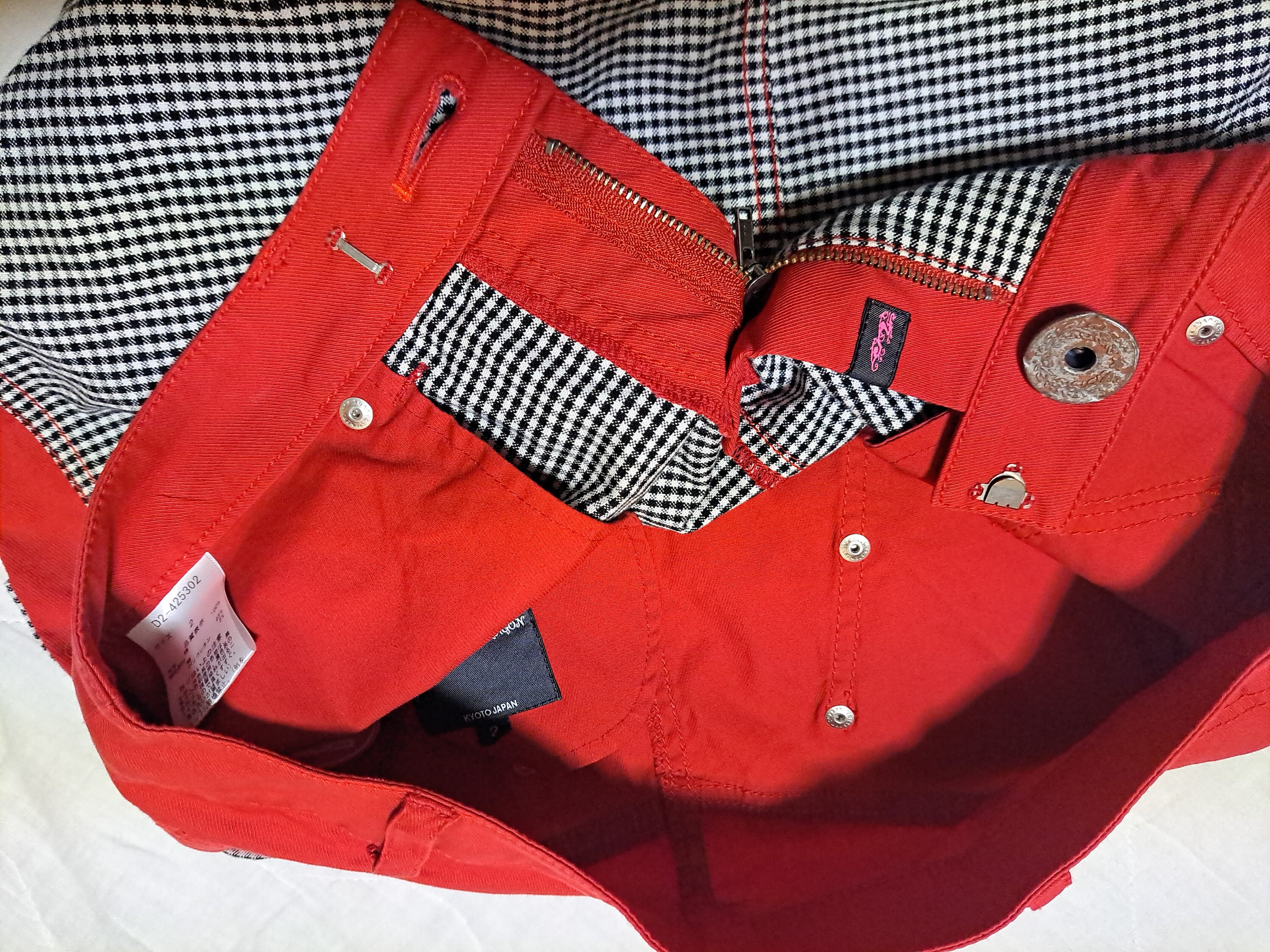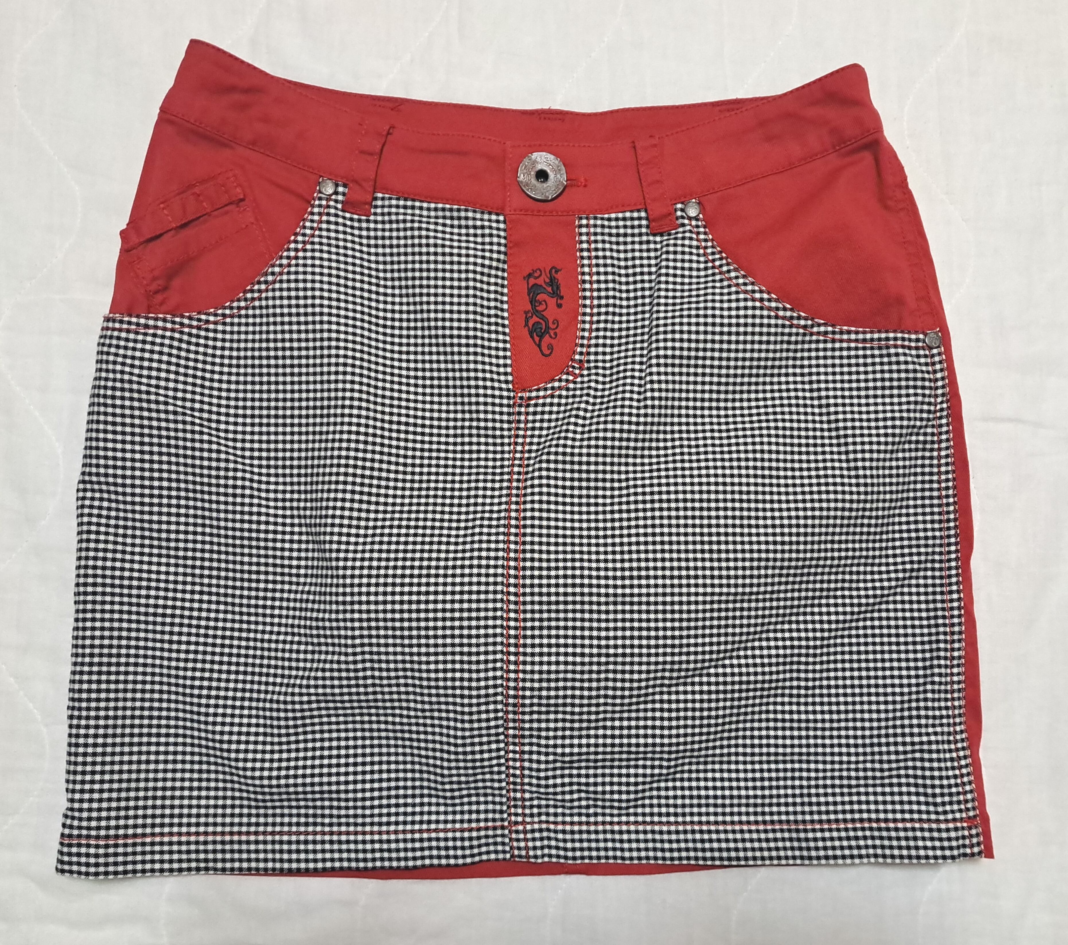 インナーパンツ別のスカート。赤地に黒白チェックのポケットとフロント。バックポケットとフロントの1部にロゴ刺繍入り。