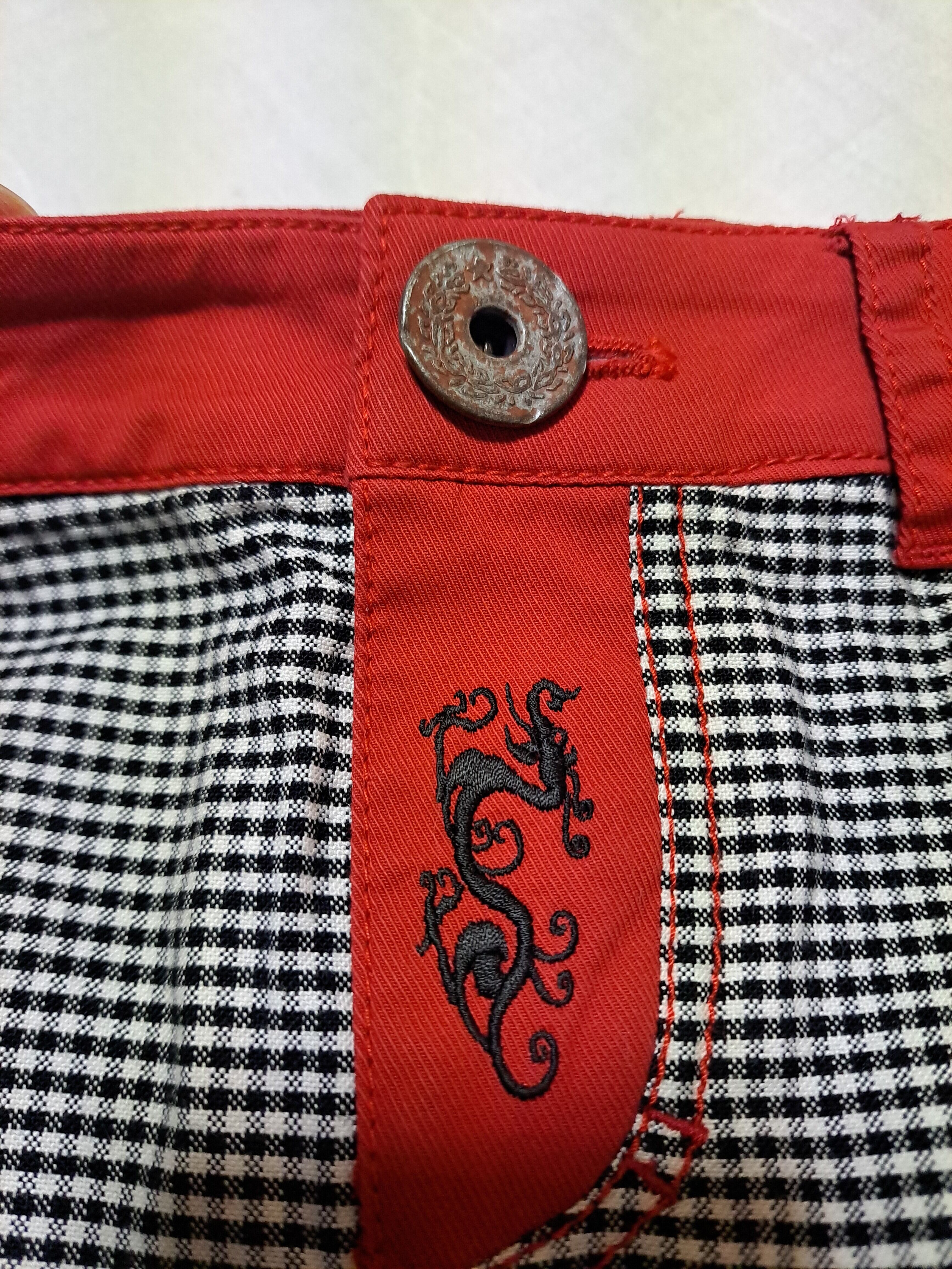 ボタンや他の金属部分(スカル柄)は元からビンテージ加工がしてあります。本体のウエストは伸びません。