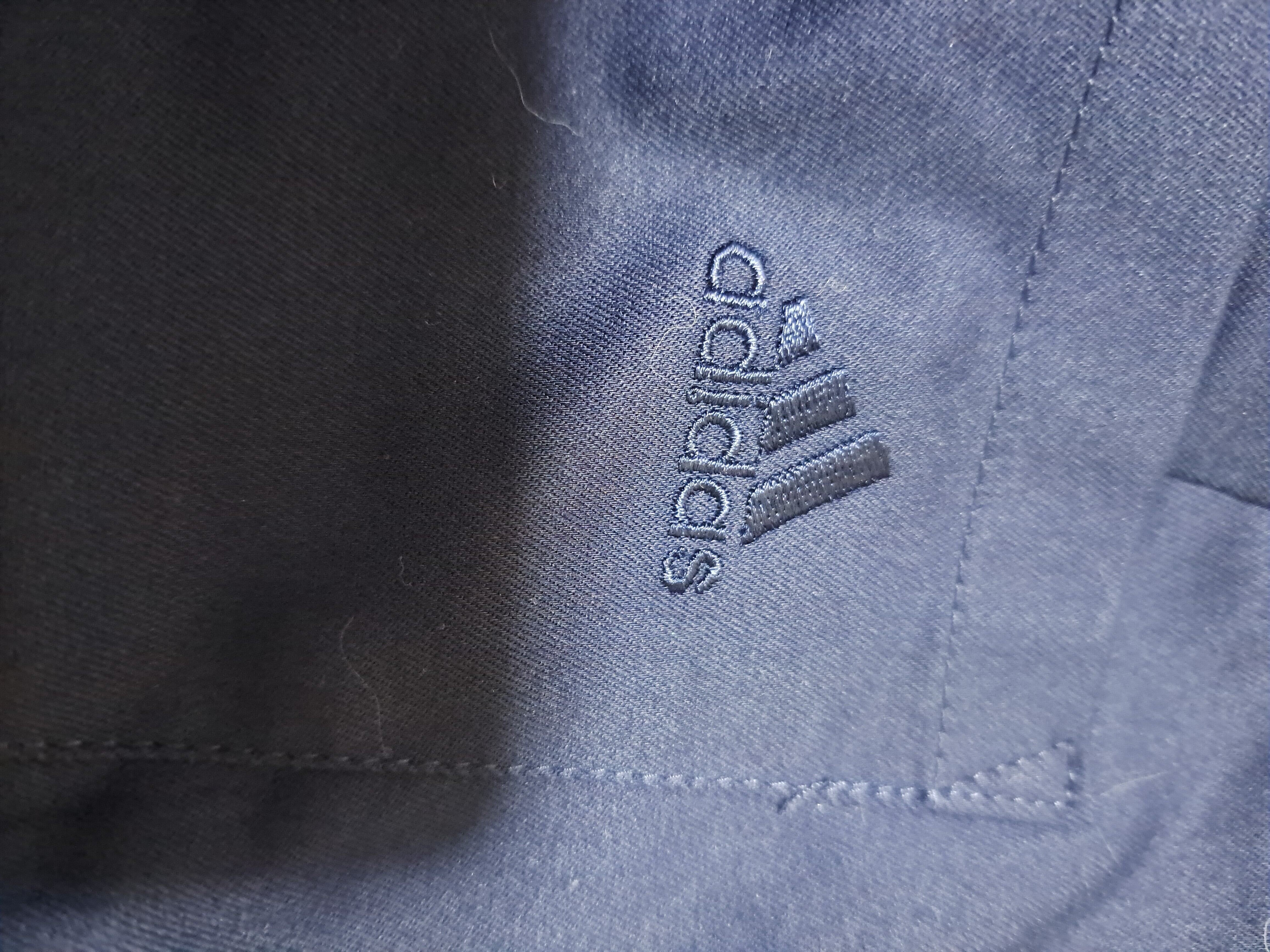 紺色の生地に紺色のスリーラインとロゴ刺繍、ボタンも紺色と総じてシンプルなデザインのスカート。