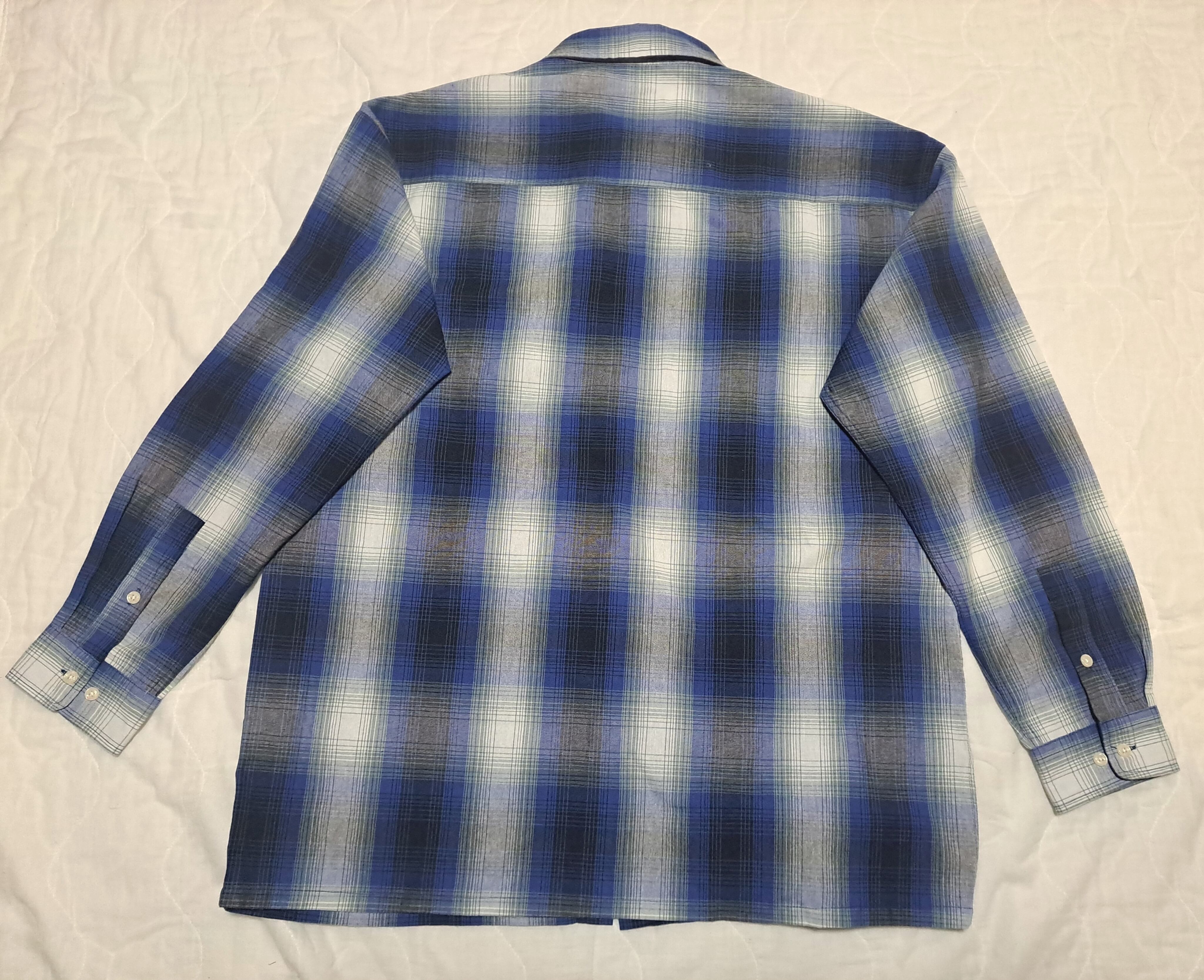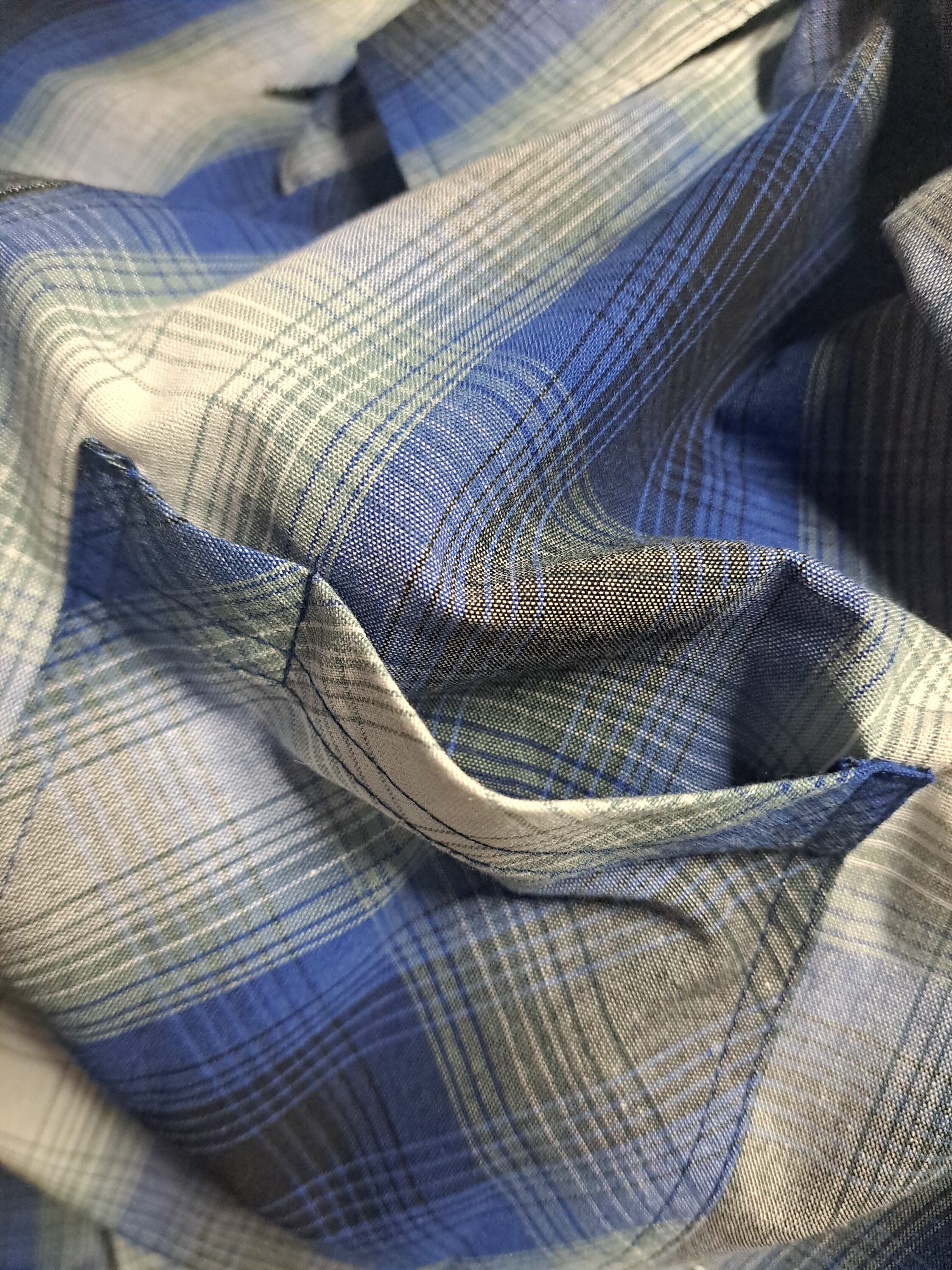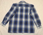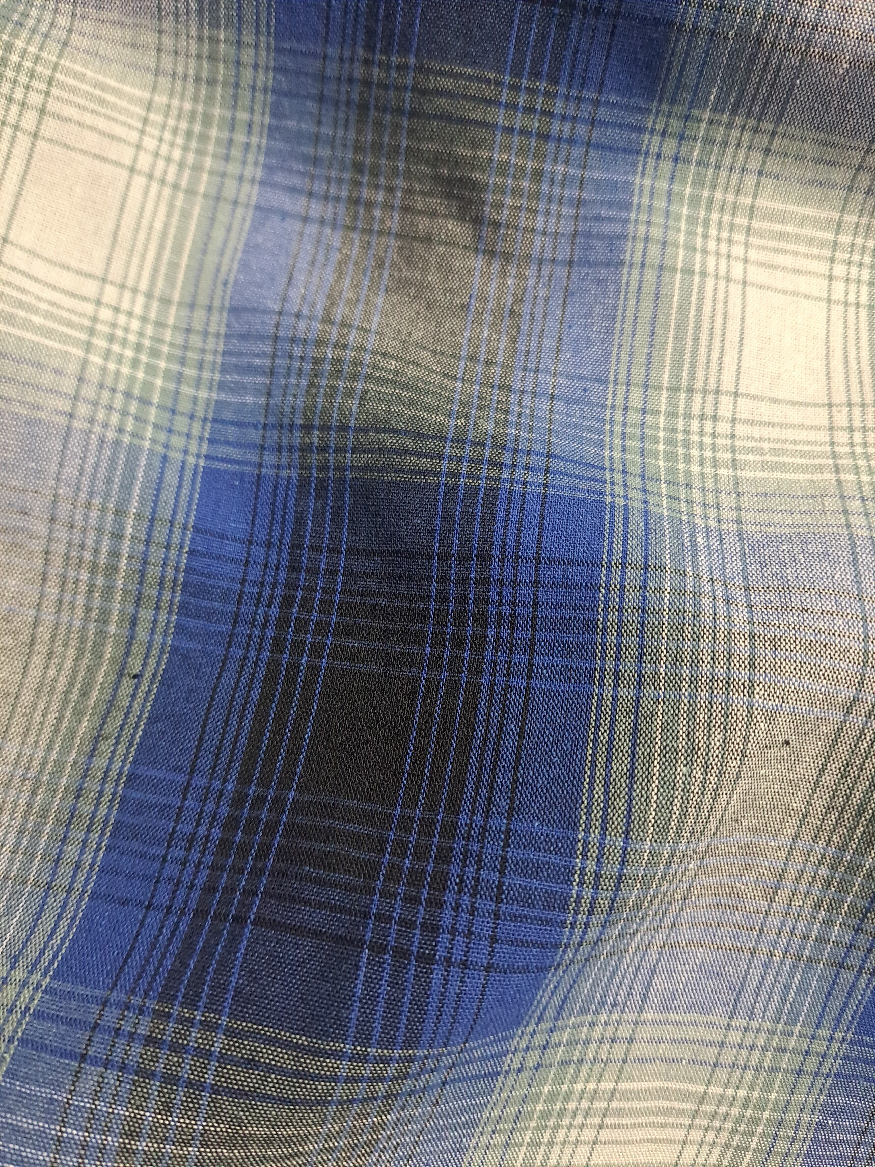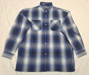 ブルーと白のオンブレチェックシャツ。2つあるポケットの左側は、ペンを挿せるようになっています。よくあるネルシャツではなく、若干張りのある生地。