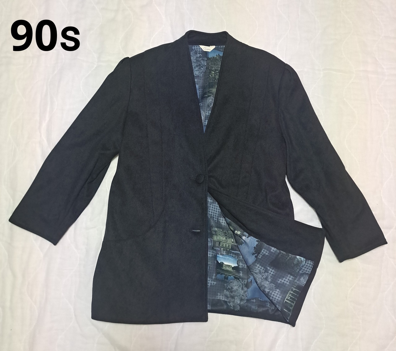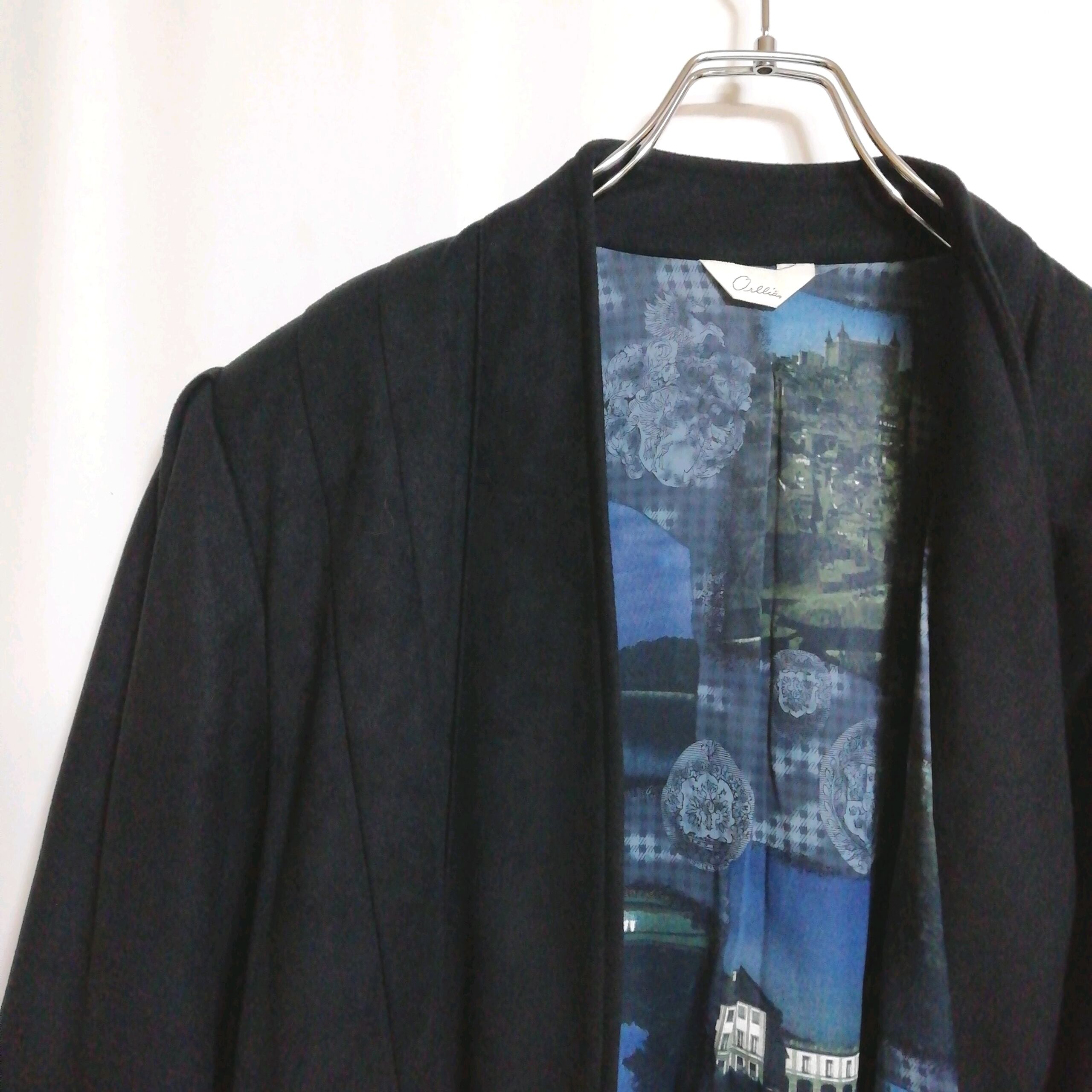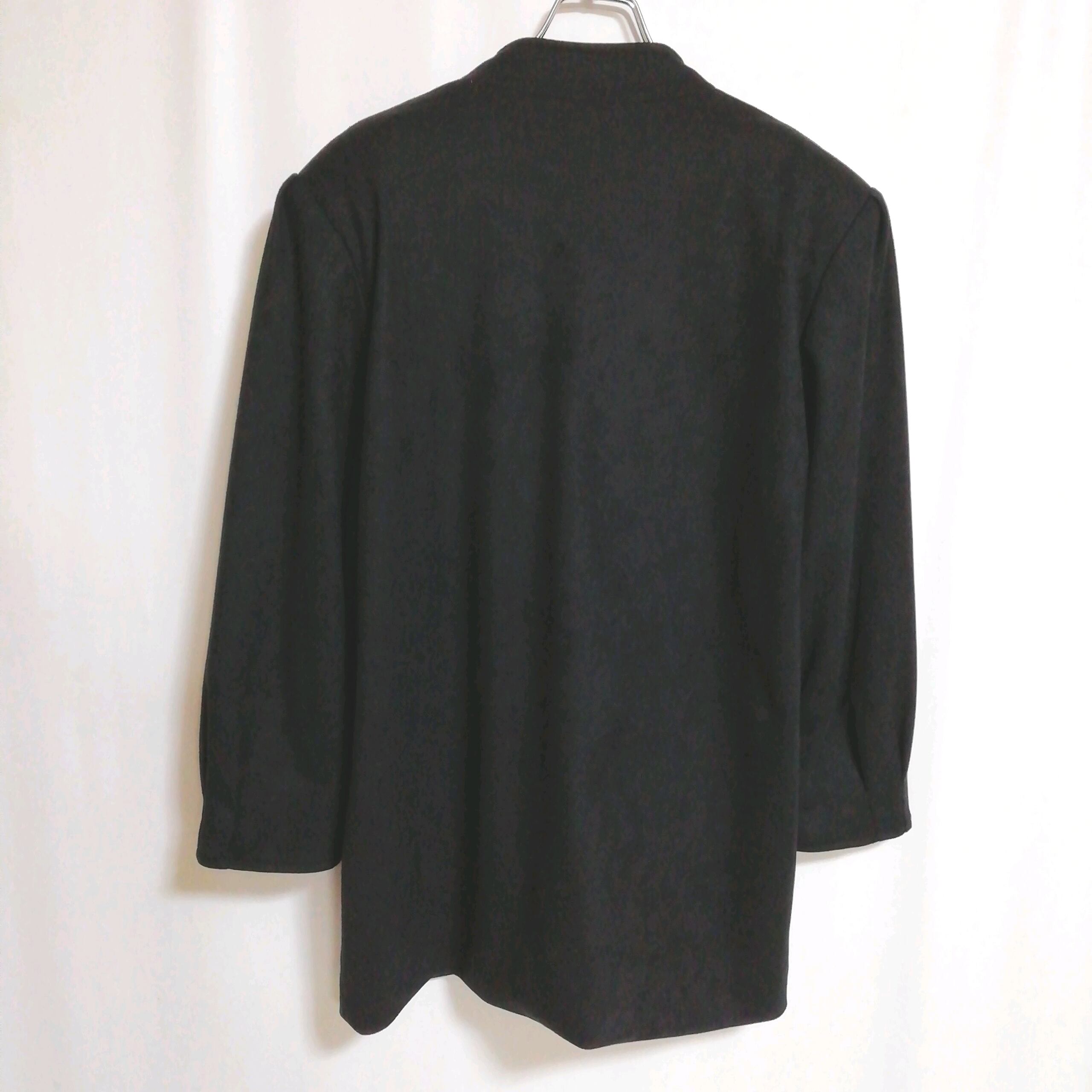 表面はスウェード風の生地のハーフコート。肩パット内蔵型(取り外し不可)。ポケットは計2つ、安心の日本製です。厚すぎないのでサッと羽織れます。