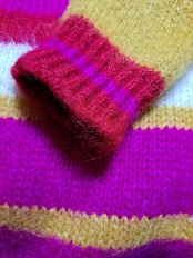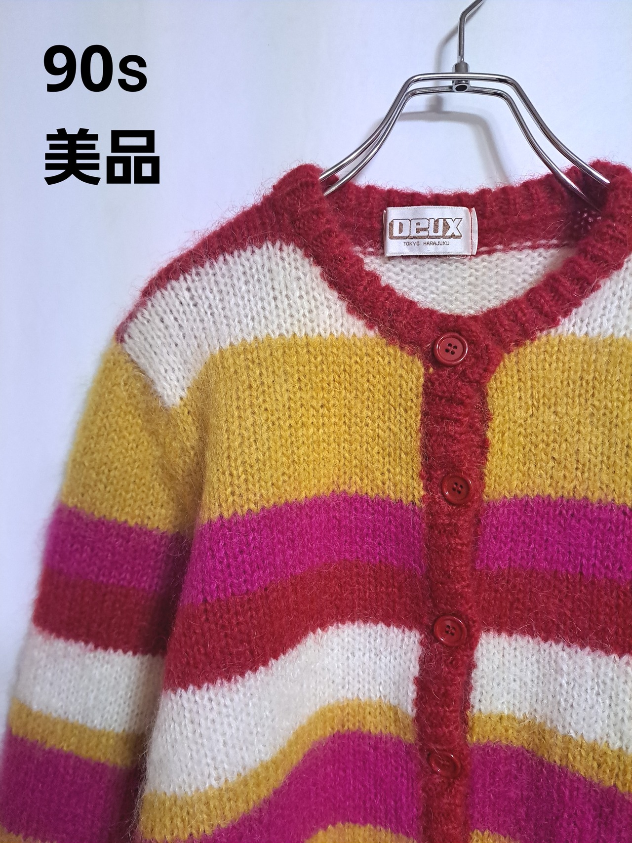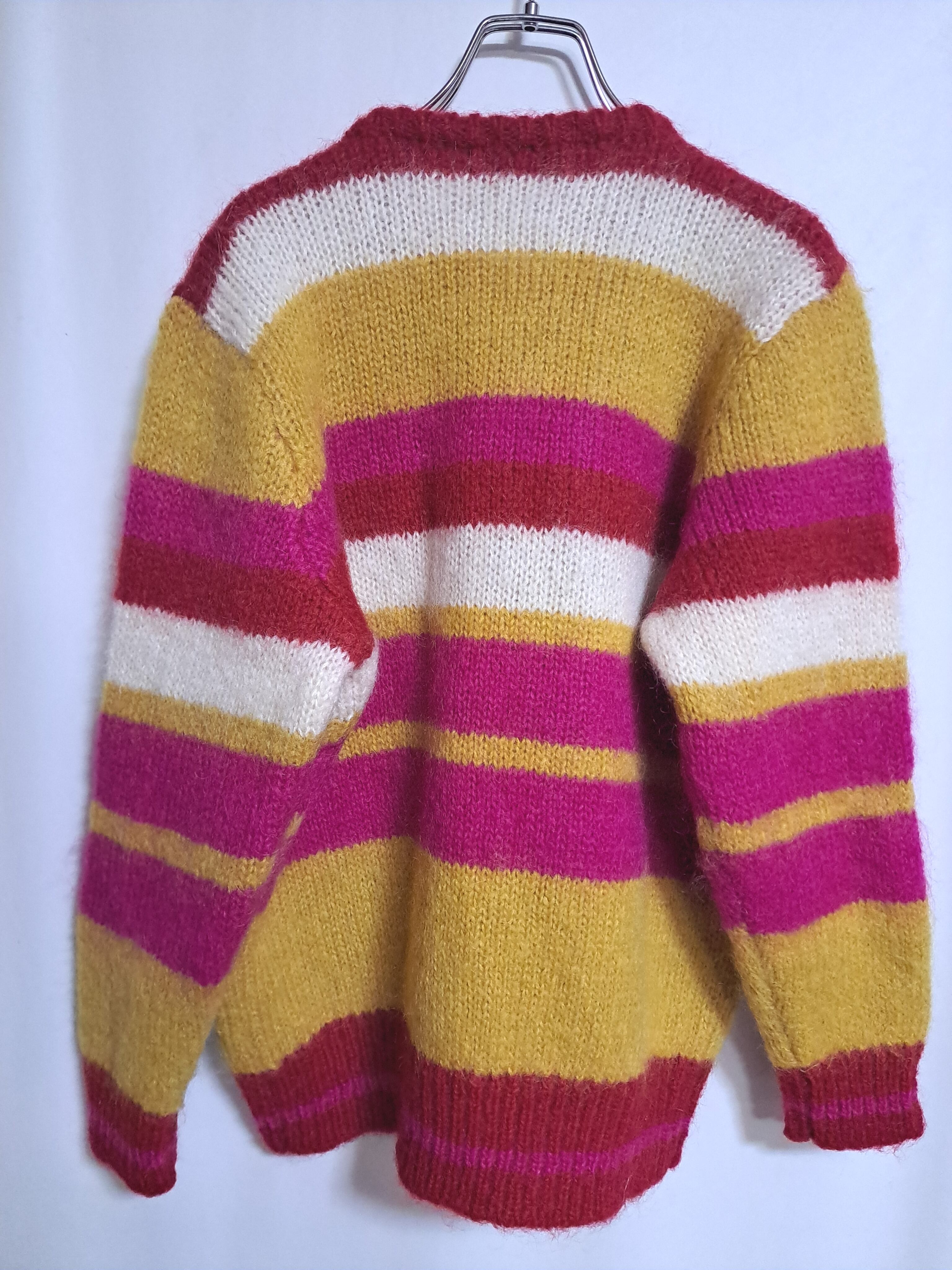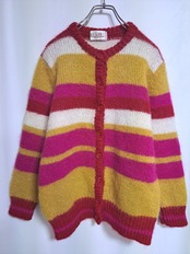 使用感のとても少ない、毛足長めのカーディガン。厚みがあり、ウールが大部分で暖かいです。レトロなボーダー柄。