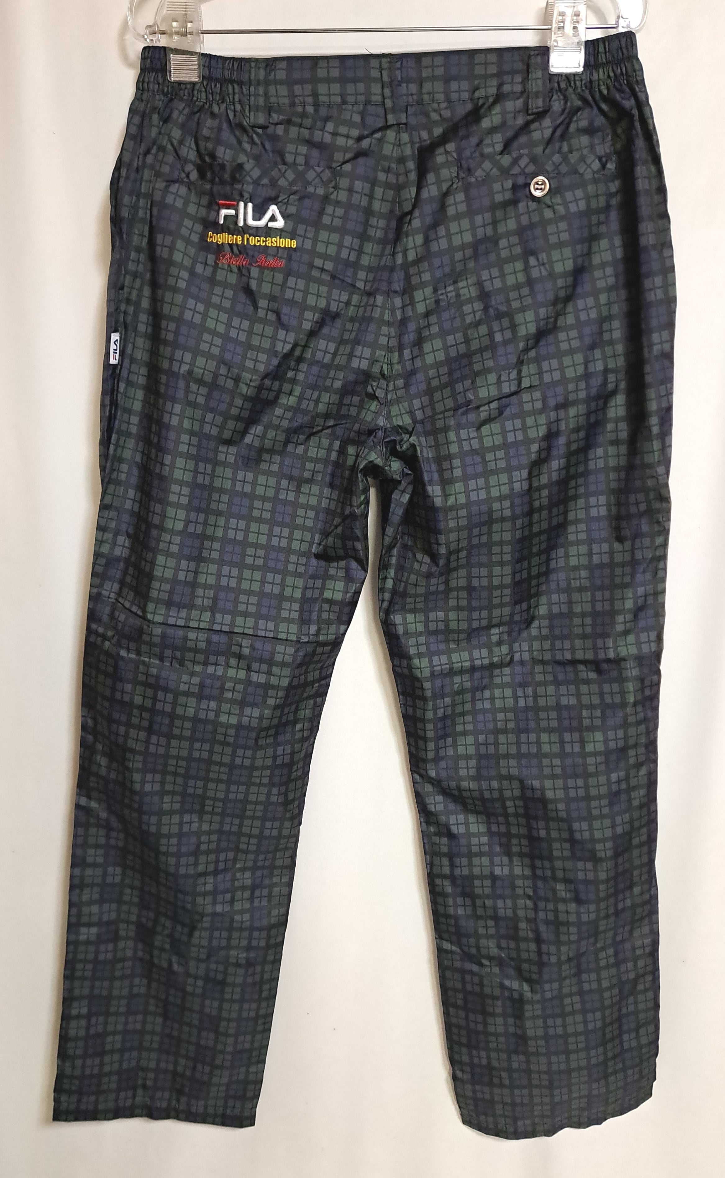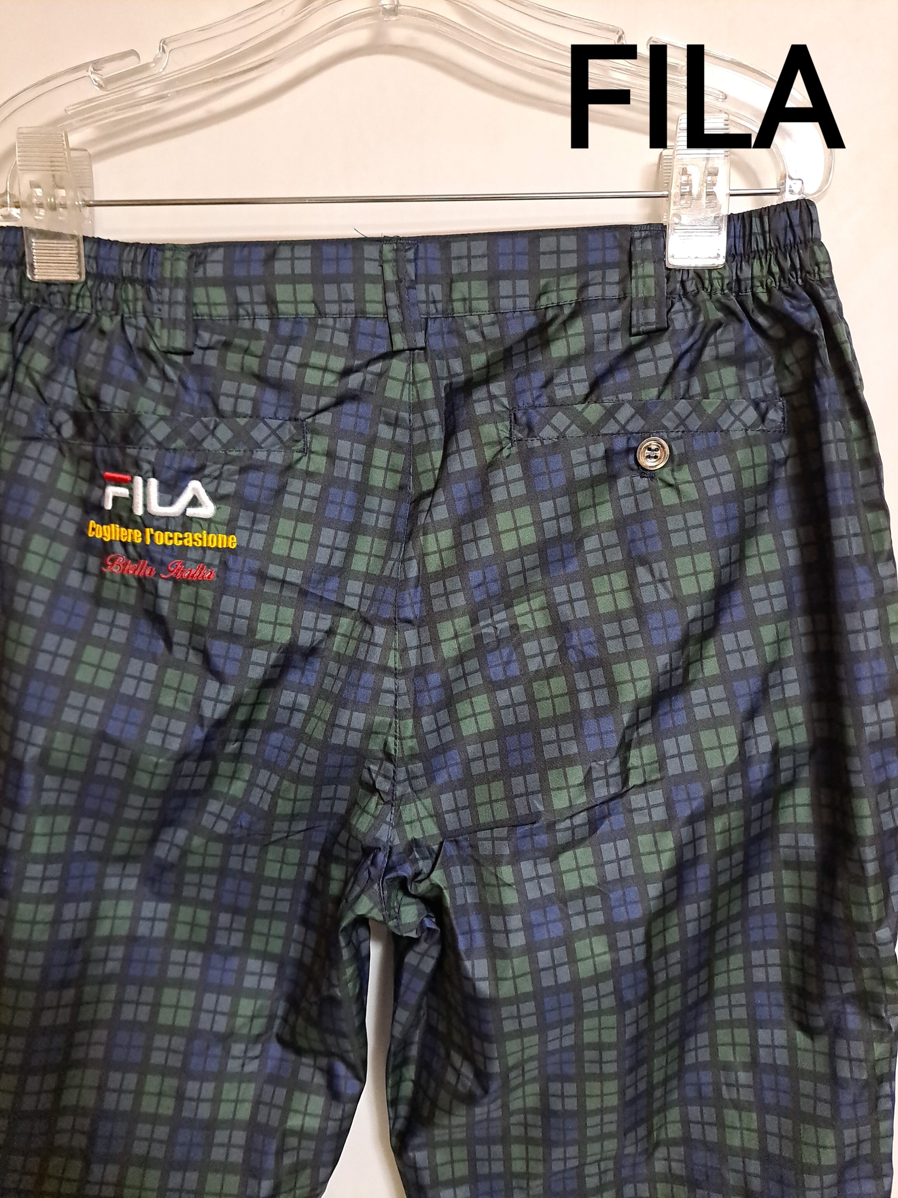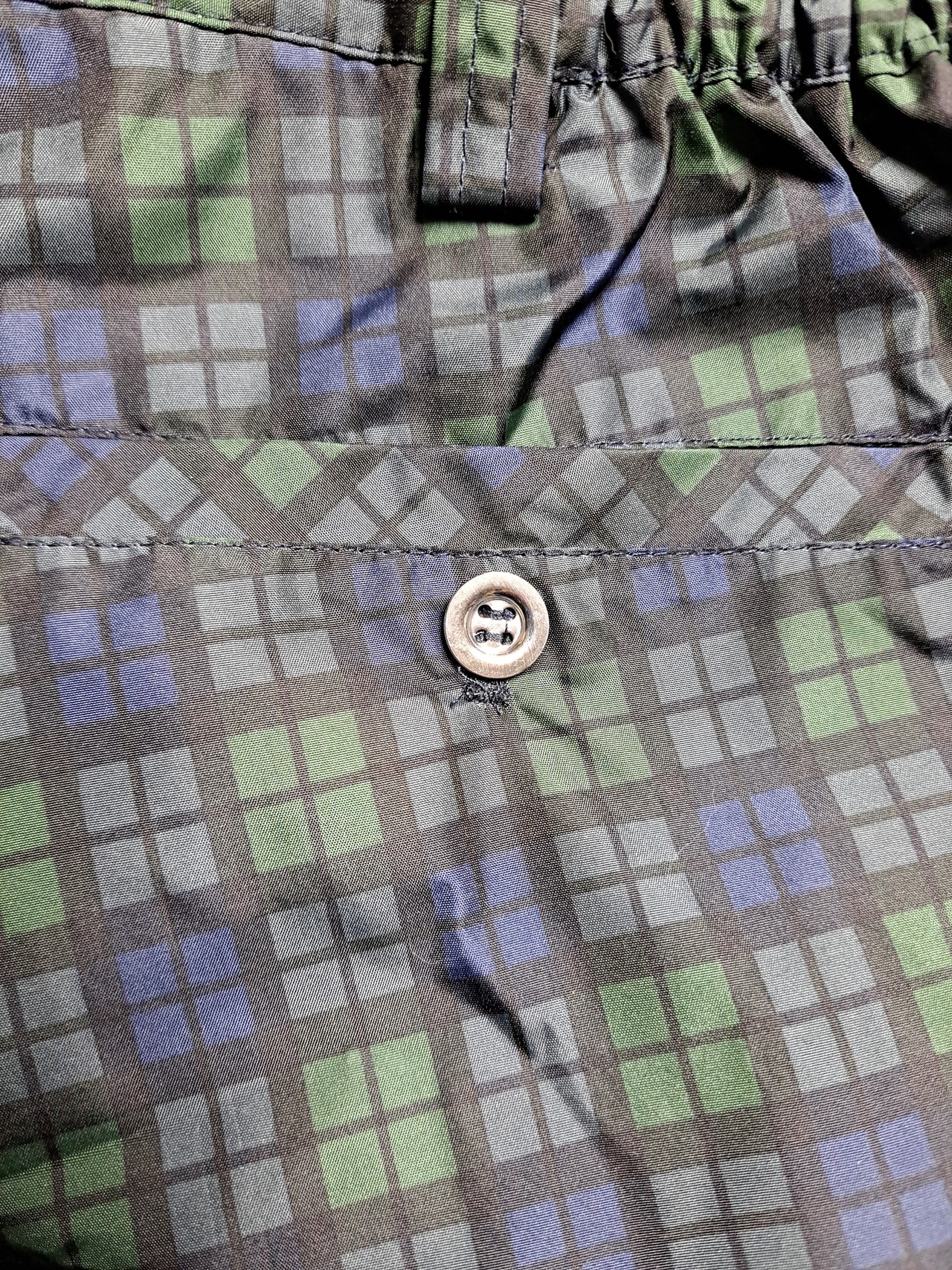 ウエストは両サイドがゴム入りで伸縮するため、数センチは伸びます。バック左ポケットにロゴ刺繍。ポケットは合計4つ。ボタンはプラスチック製です。