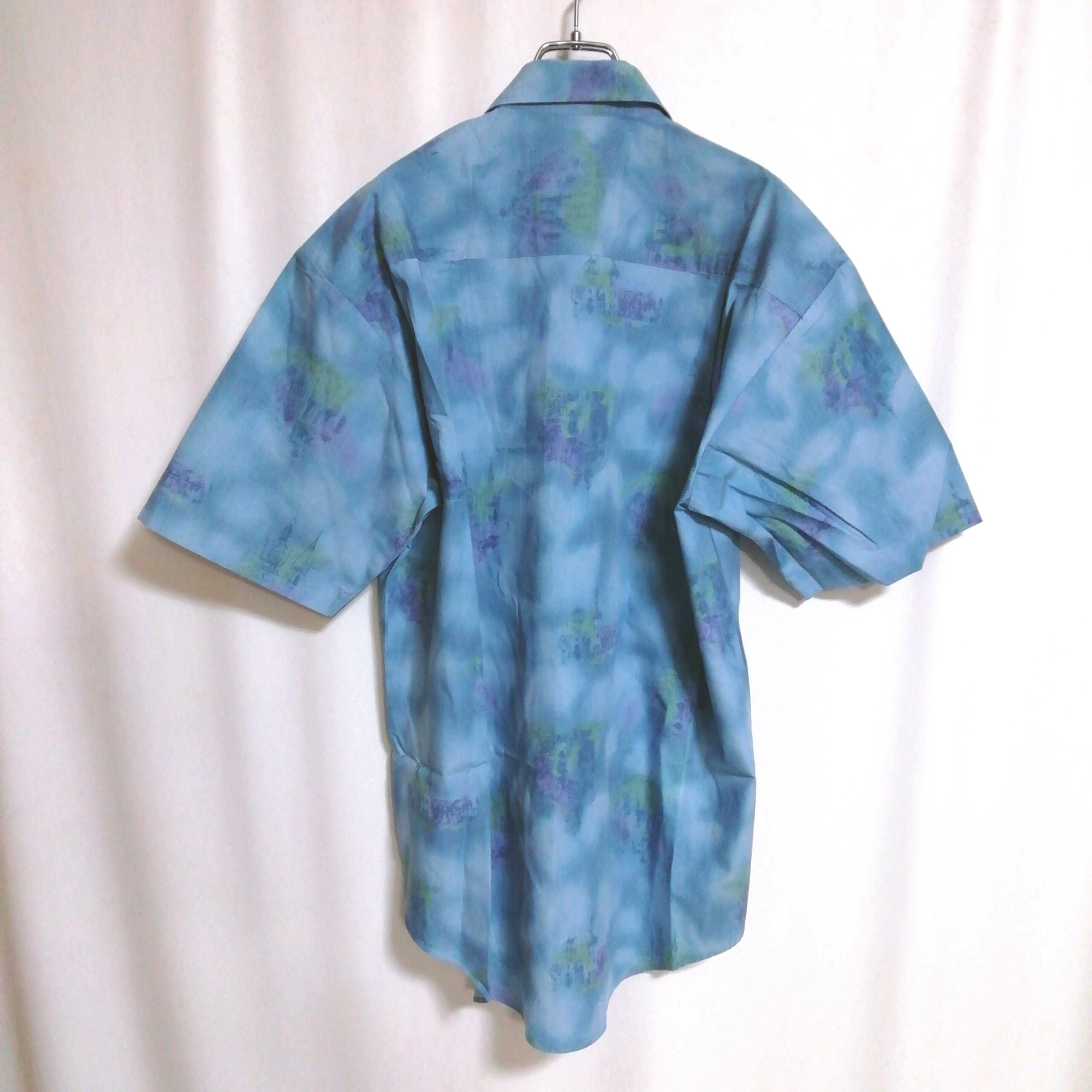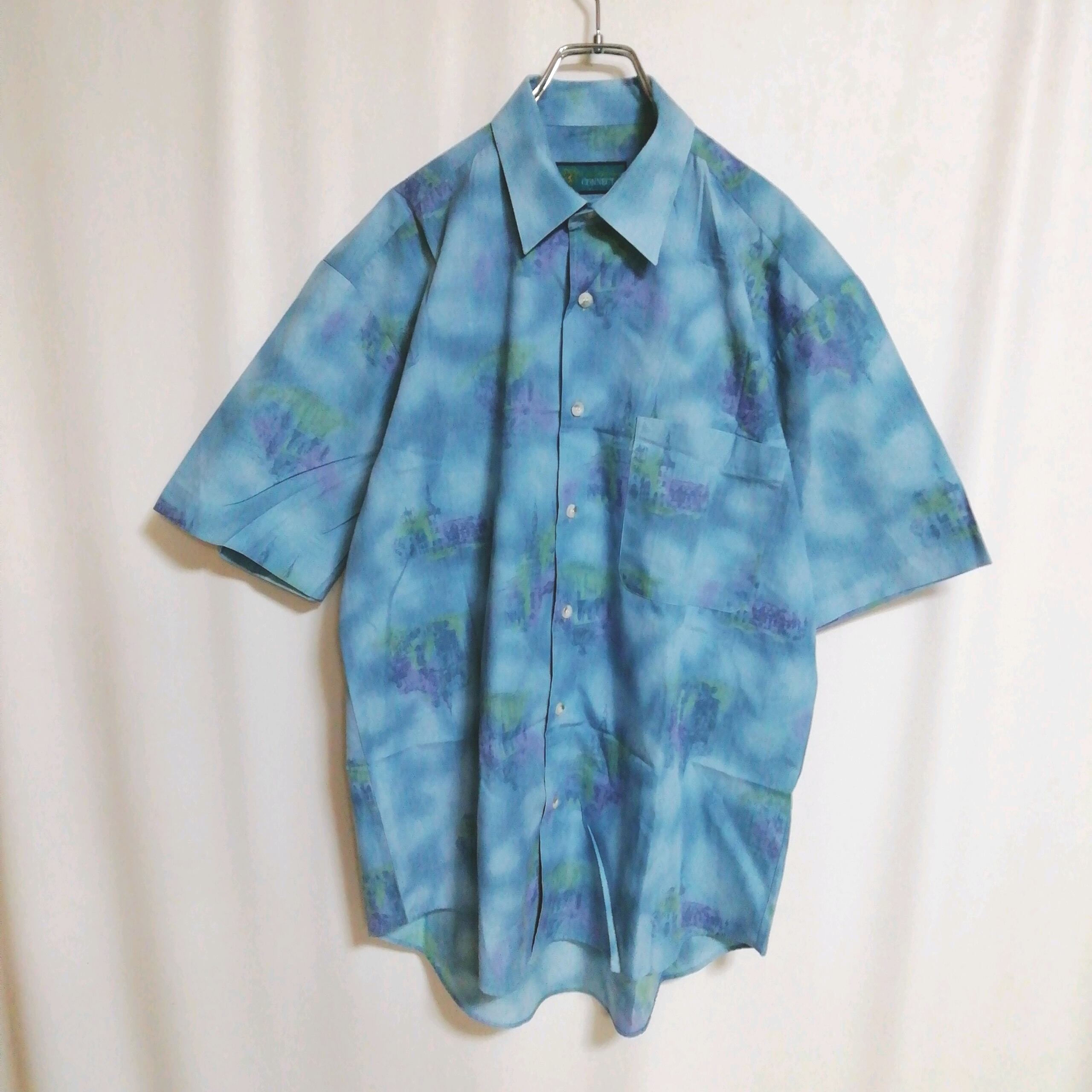 滲んだようなカラーリングに、ヨーロピアンなデザインが施された薄手の半袖シャツ。安心の日本製。左胸にポケット付き。