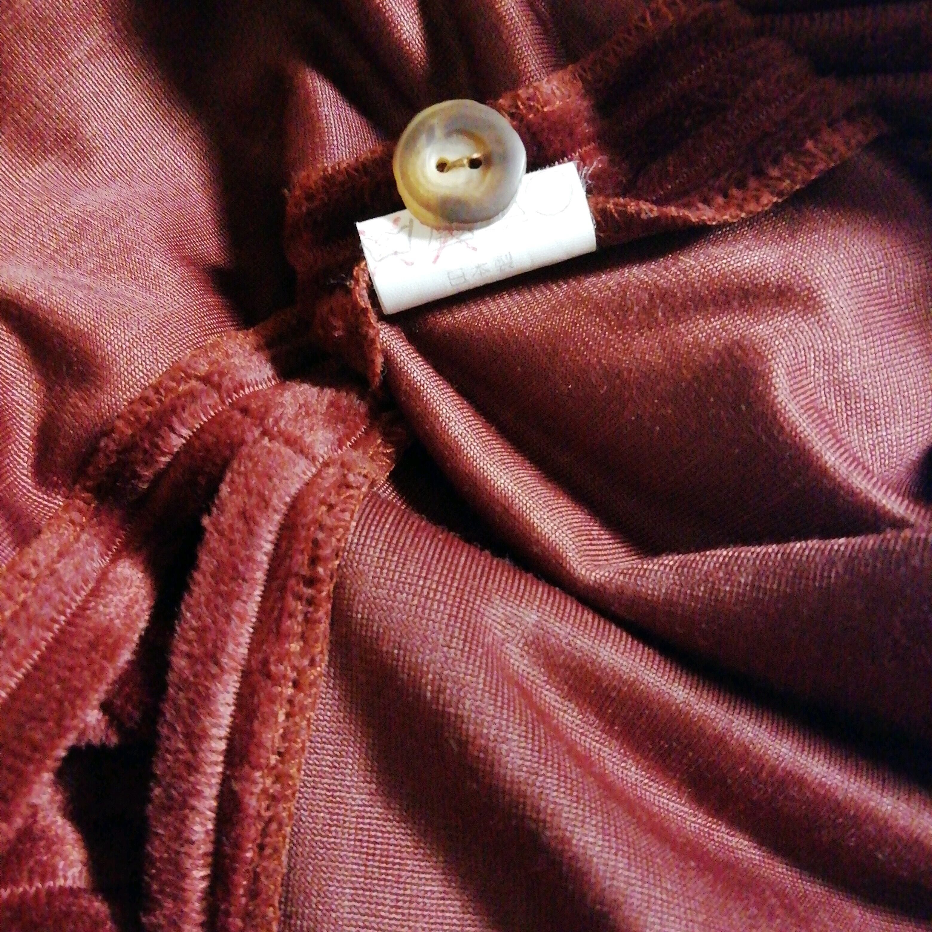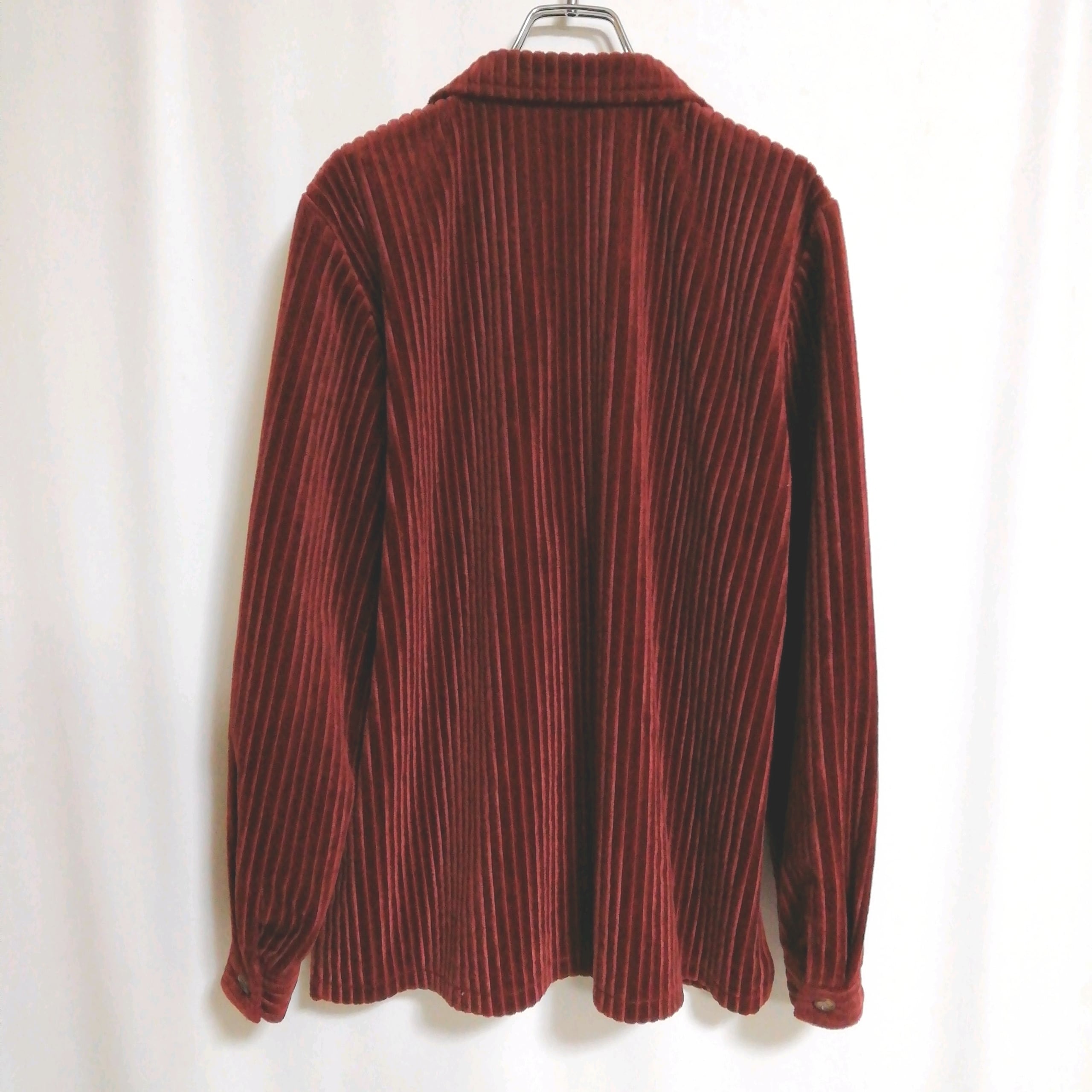 太畝コーデュロイのやや厚手のシャツ。すべすべな生地。安心の日本製。替えボタン・飾りボタン付き。ポケットは1つ。フリーサイズですが着用感はレディースL位かと思います。