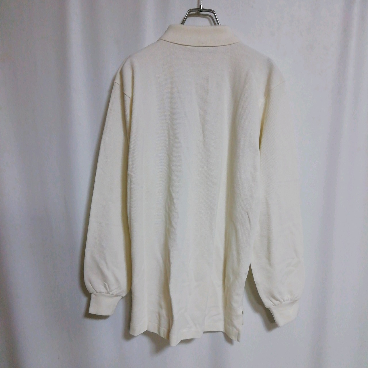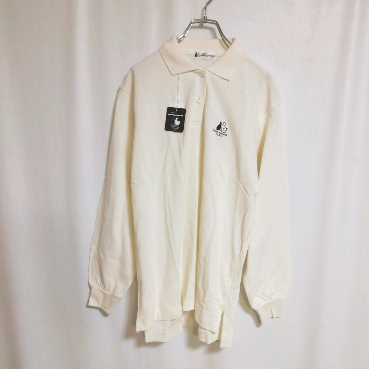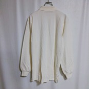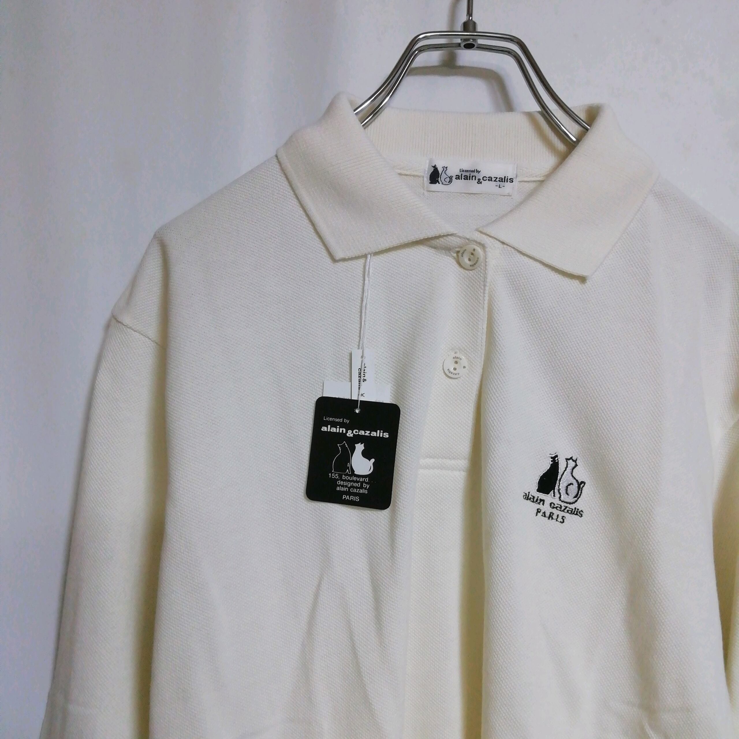 リブ付きのロングスリーブポロシャツ。左胸に白猫と黒猫のワンポイントロゴ刺繍入り。本体はクリームとアイボリーの中間のようなカラーです。