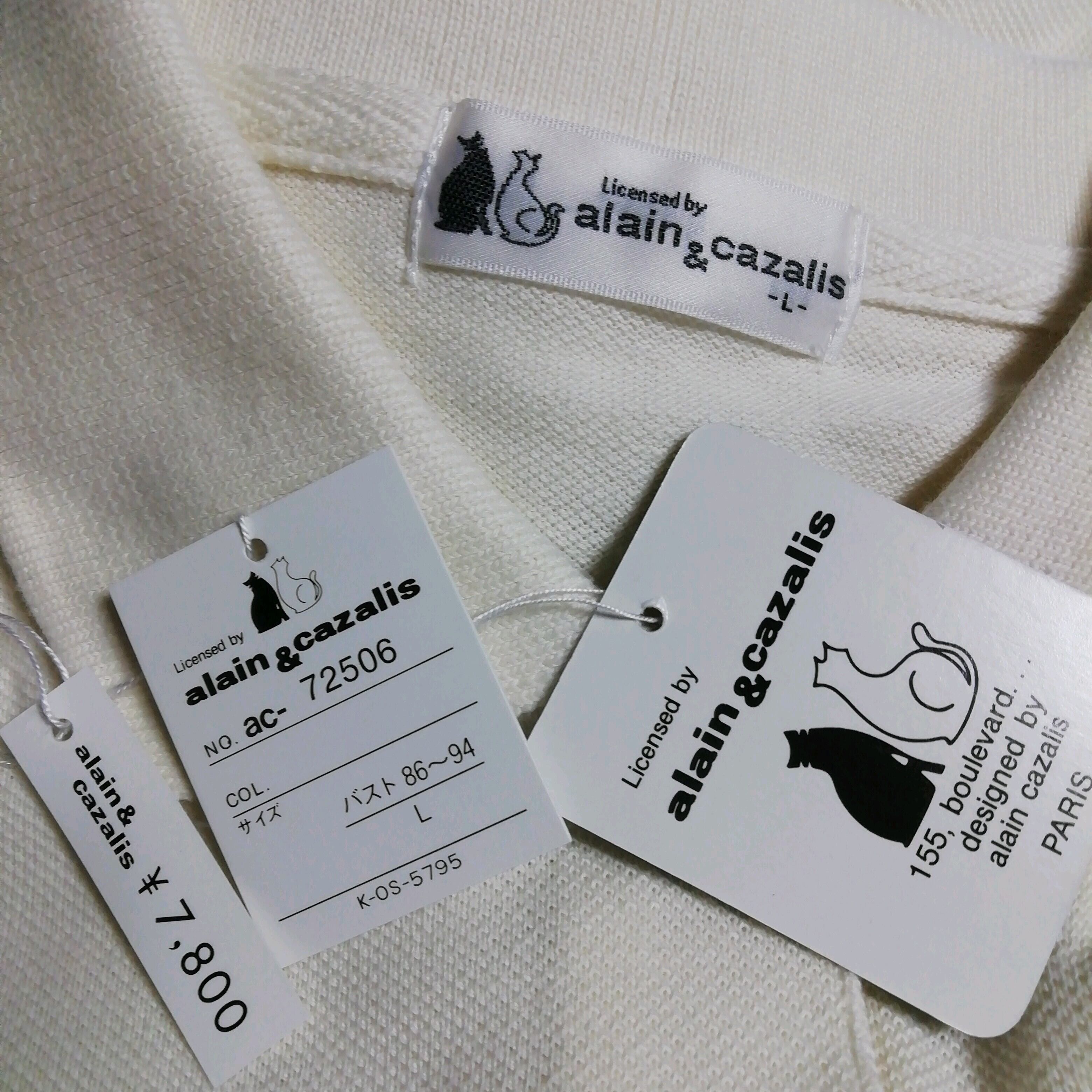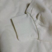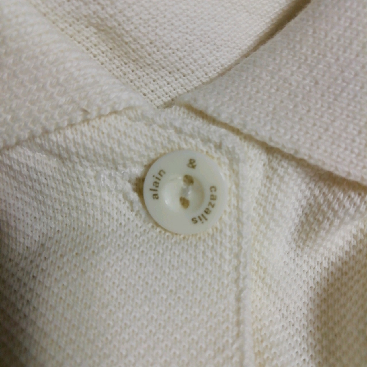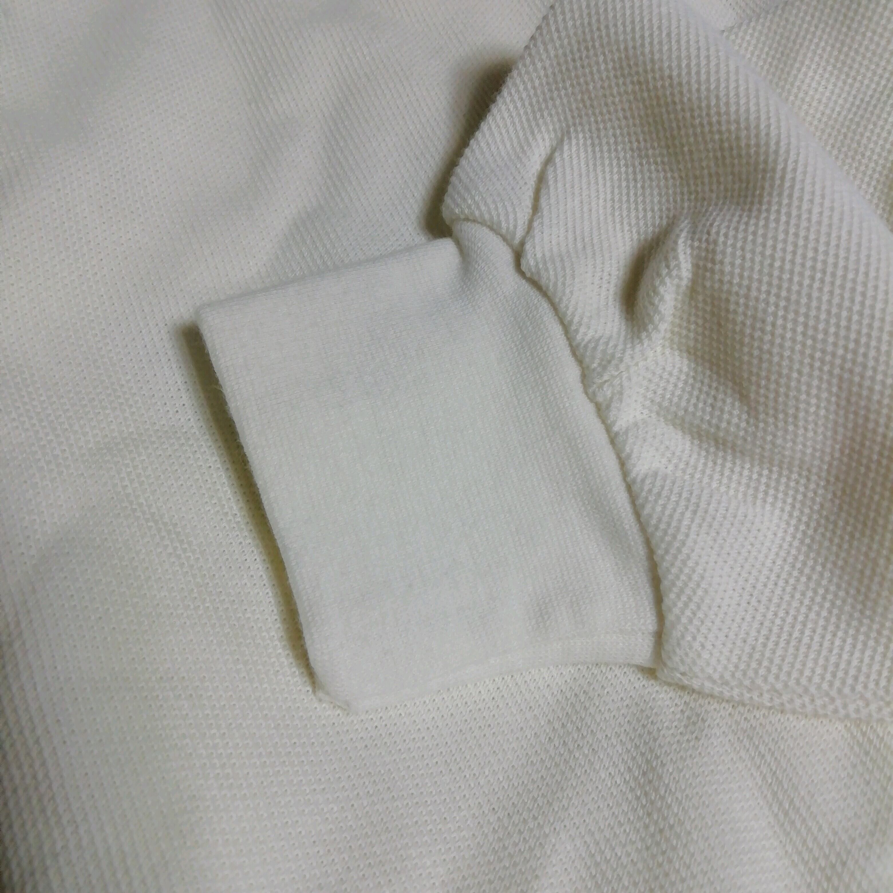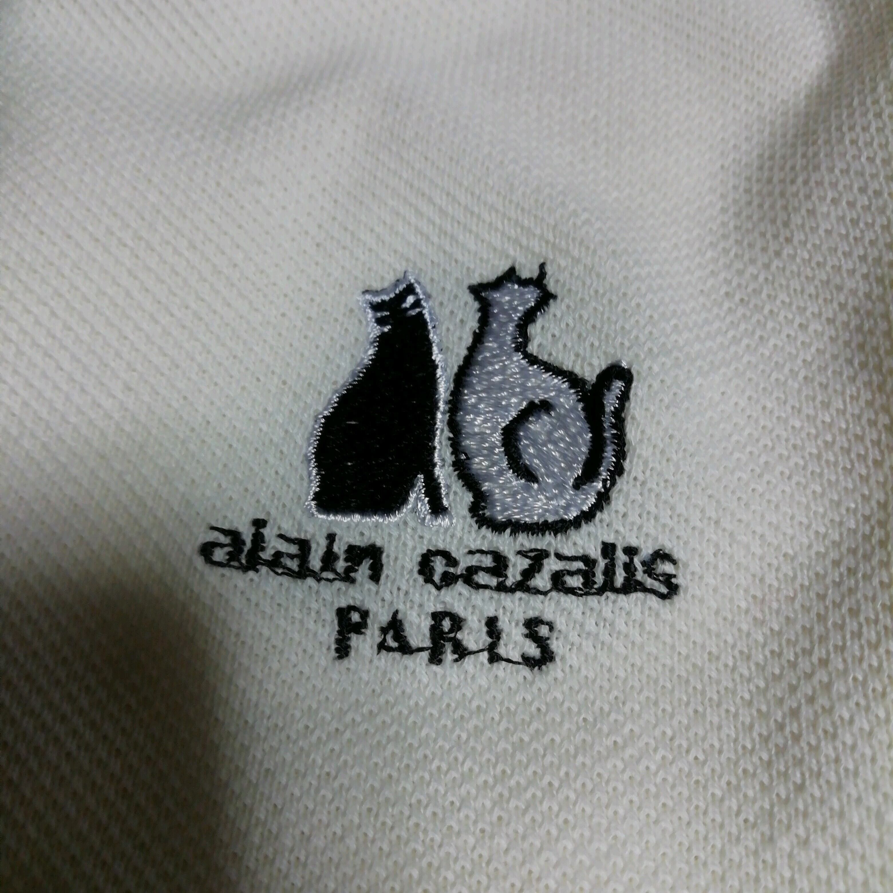 リブ付きのロングスリーブポロシャツ。左胸に白猫と黒猫のワンポイントロゴ刺繍入り。本体はクリームとアイボリーの中間のようなカラーです。