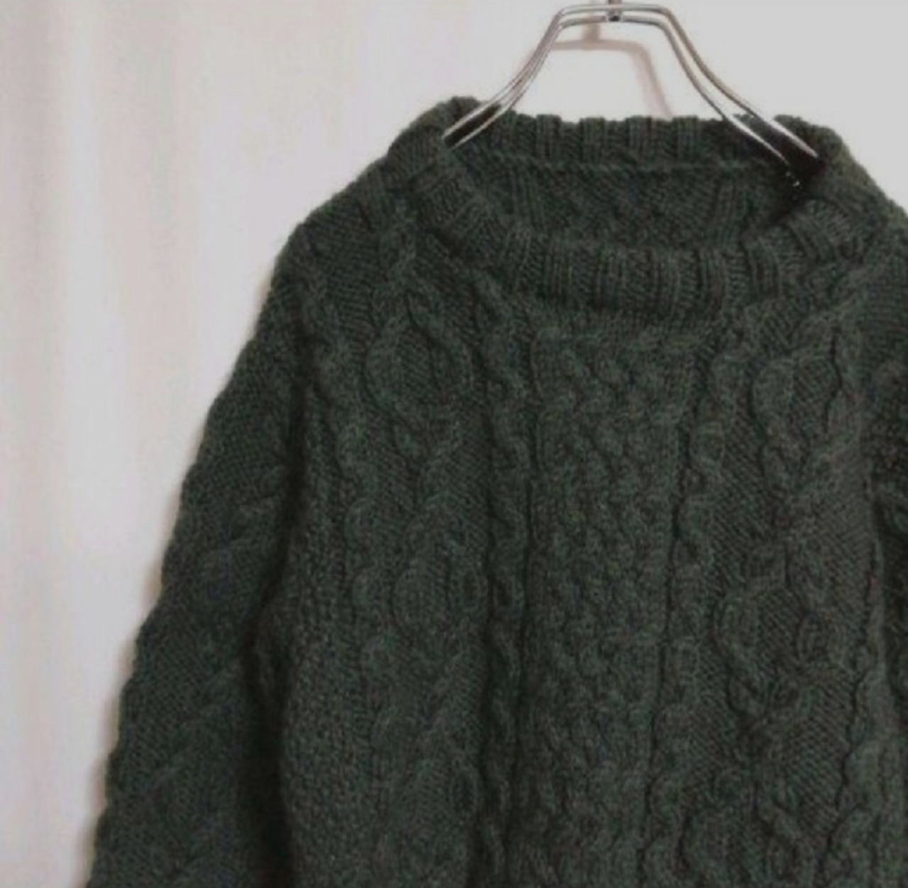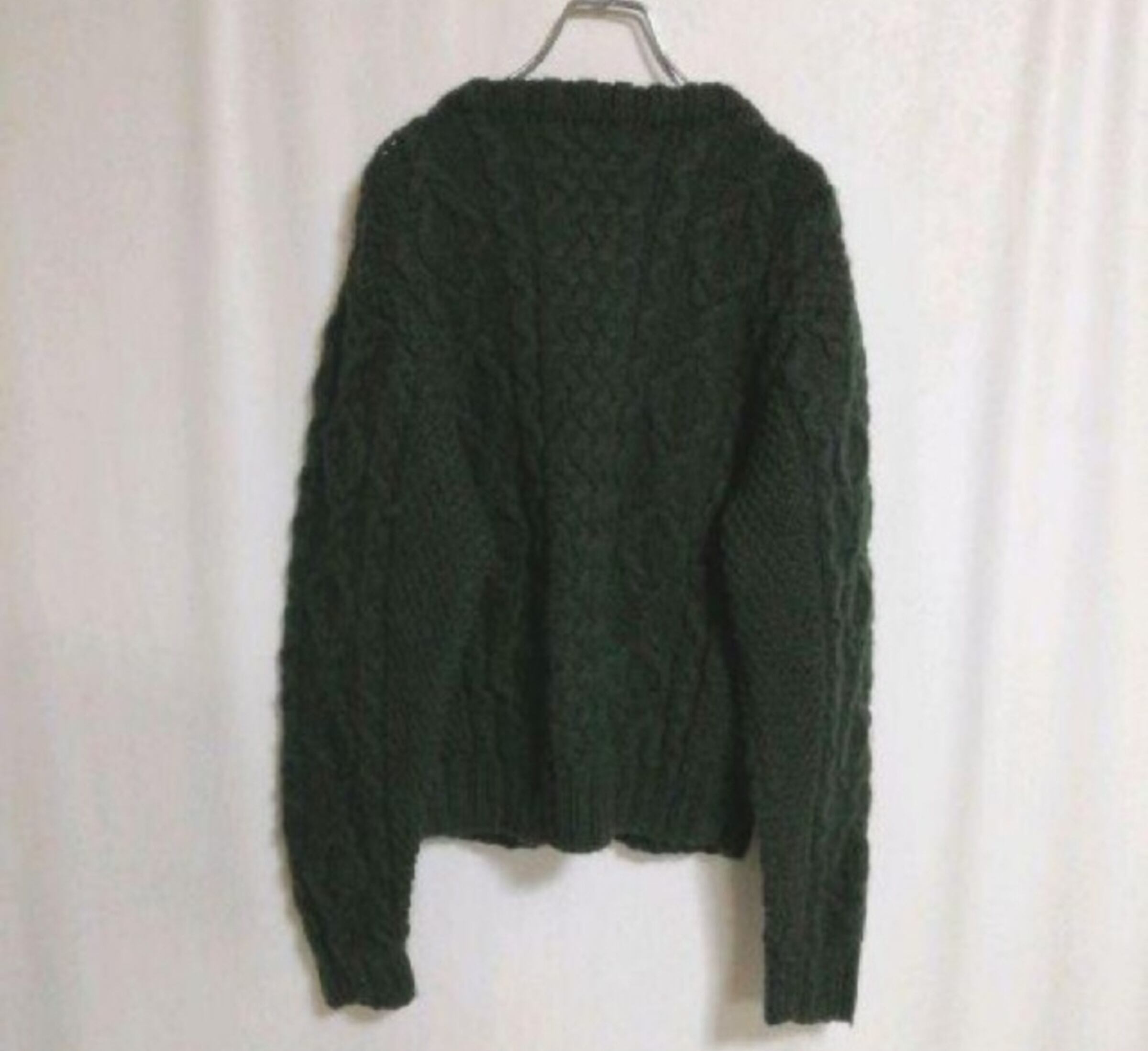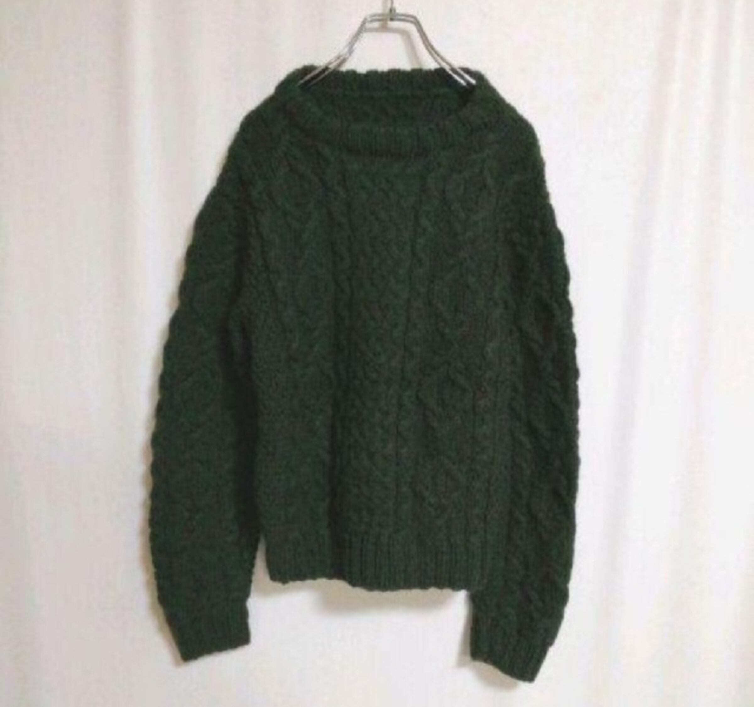 厚手で暖かいフィッシャーマンセーター。タグ表示が消えているため、素材やサイズが不明ですが、おそらくウールか、アクリルミックスウールだったと記憶しています。クリーニング済み。あまり見かけないダークグリーンカラー。