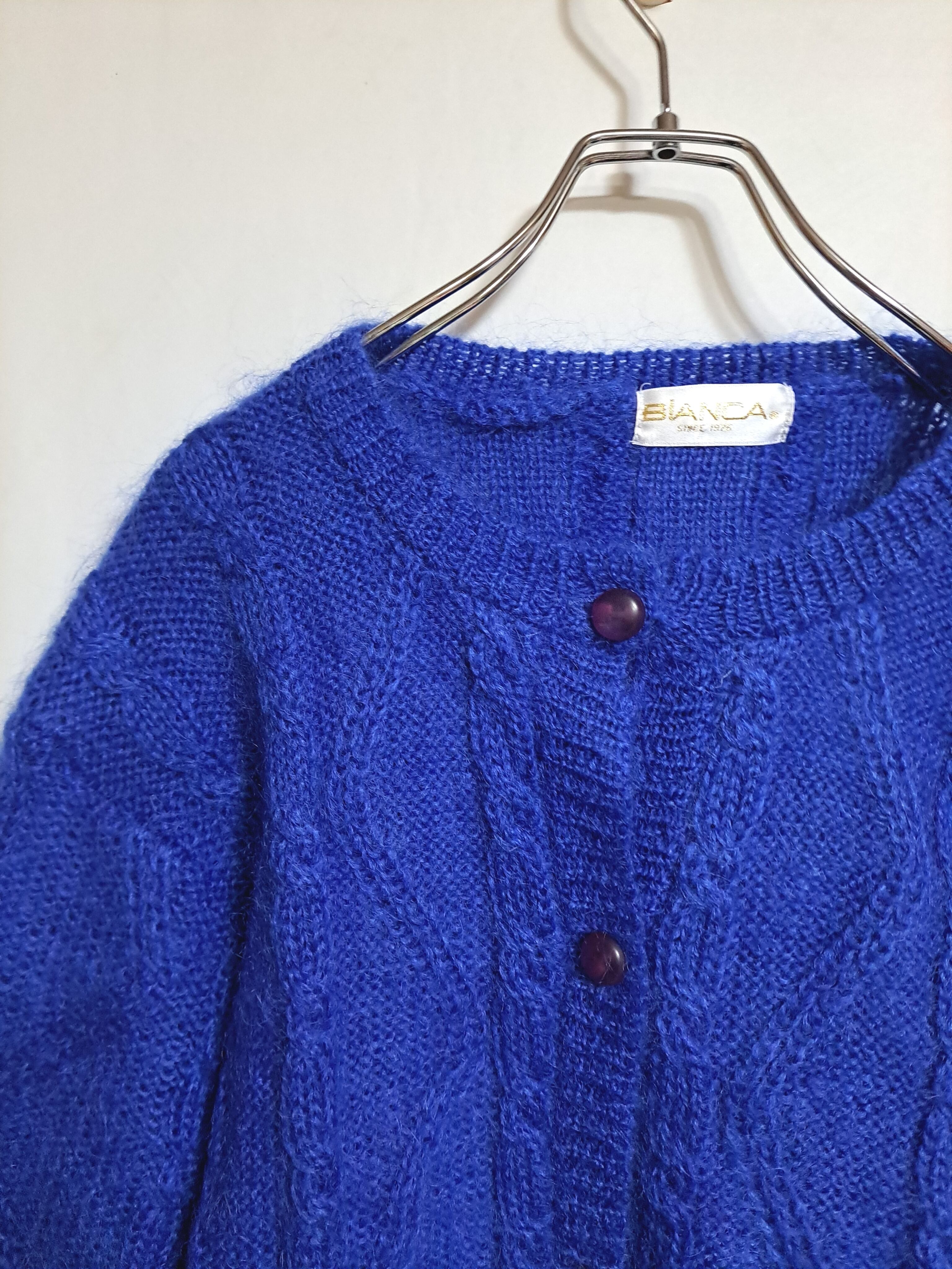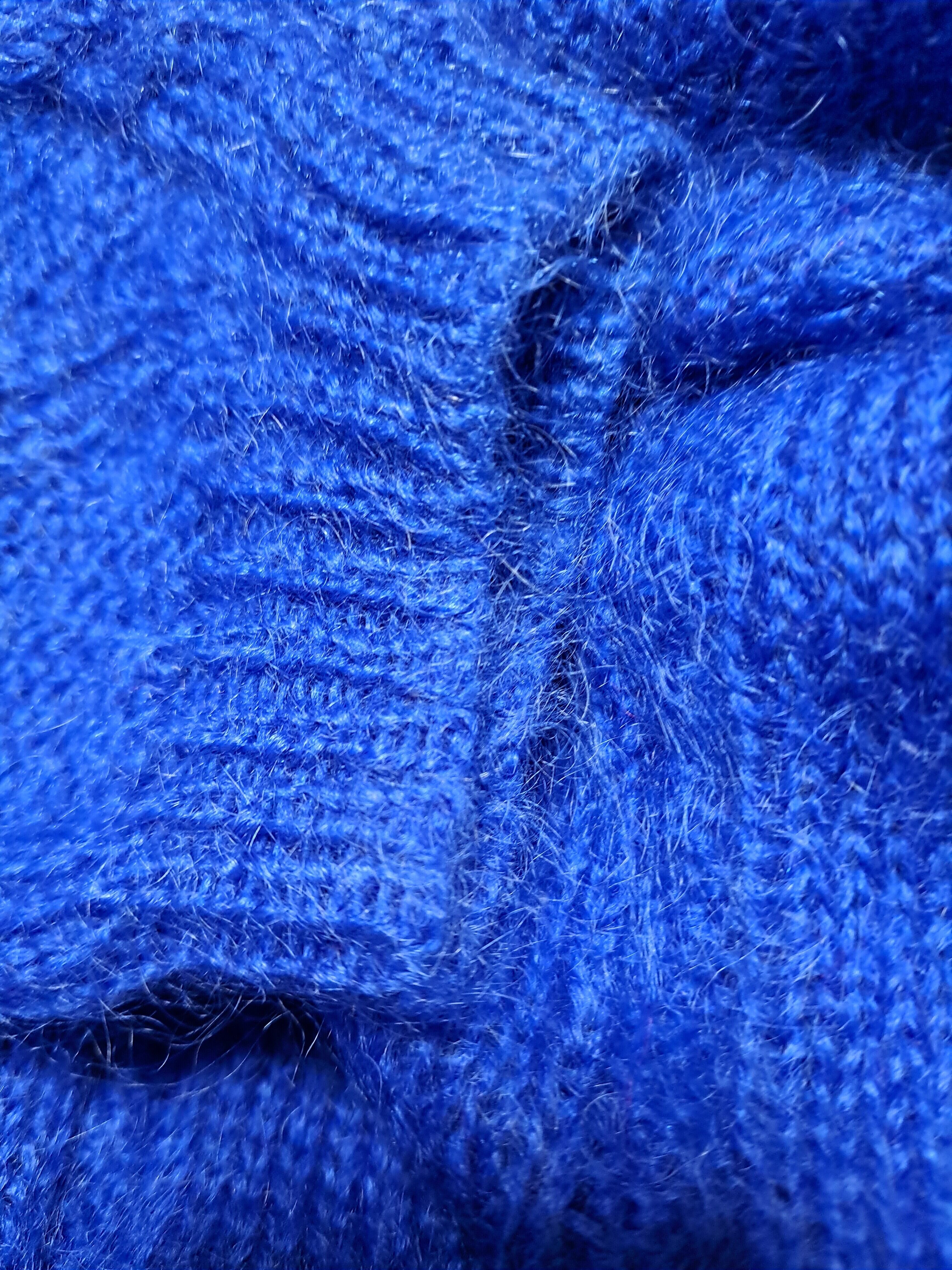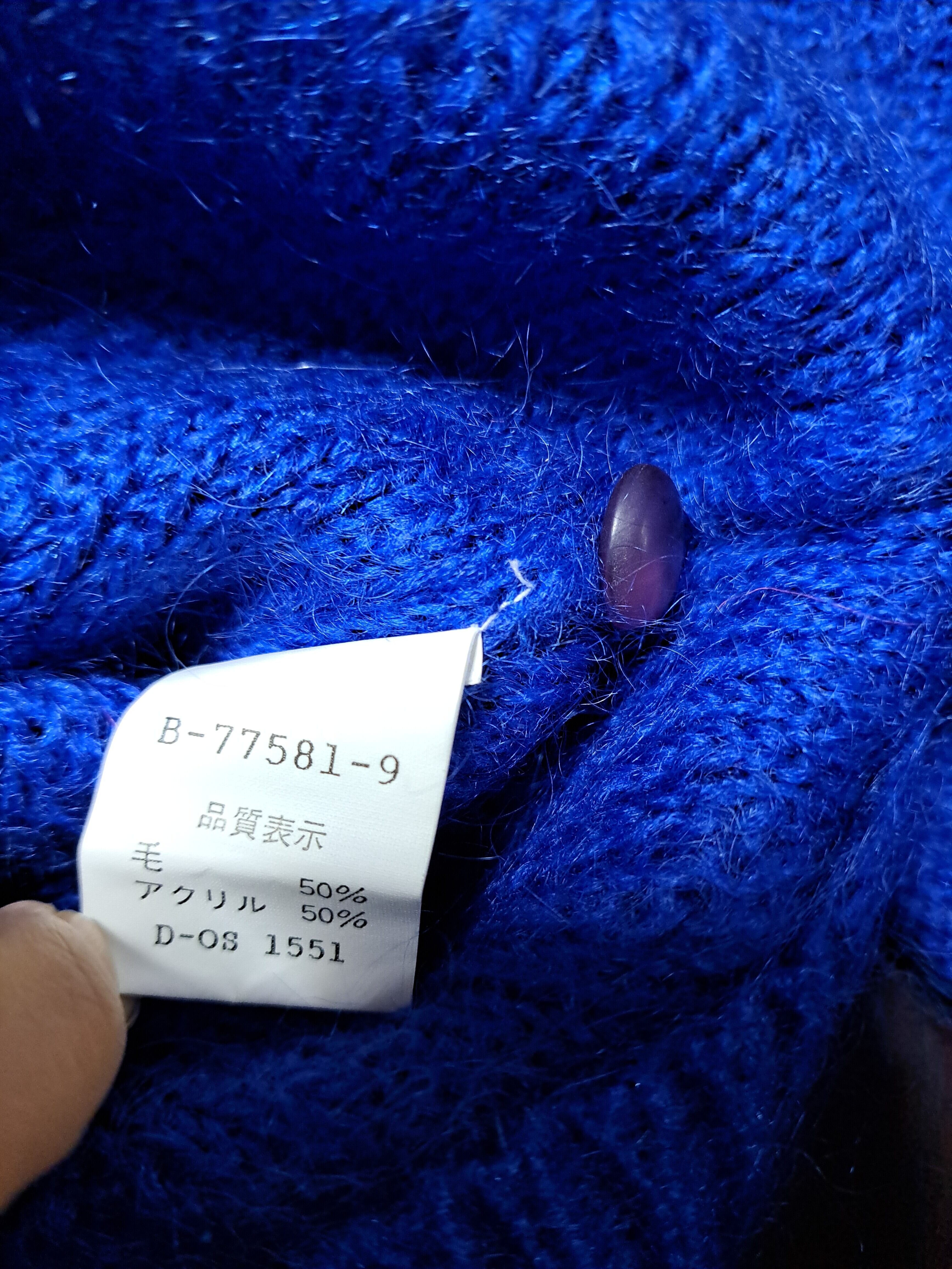綺麗なブルーの糸で編み込まれた、毛足長めのモヘアニットカーディガン。ウールが約半分で暖かいです。替えボタン付き。