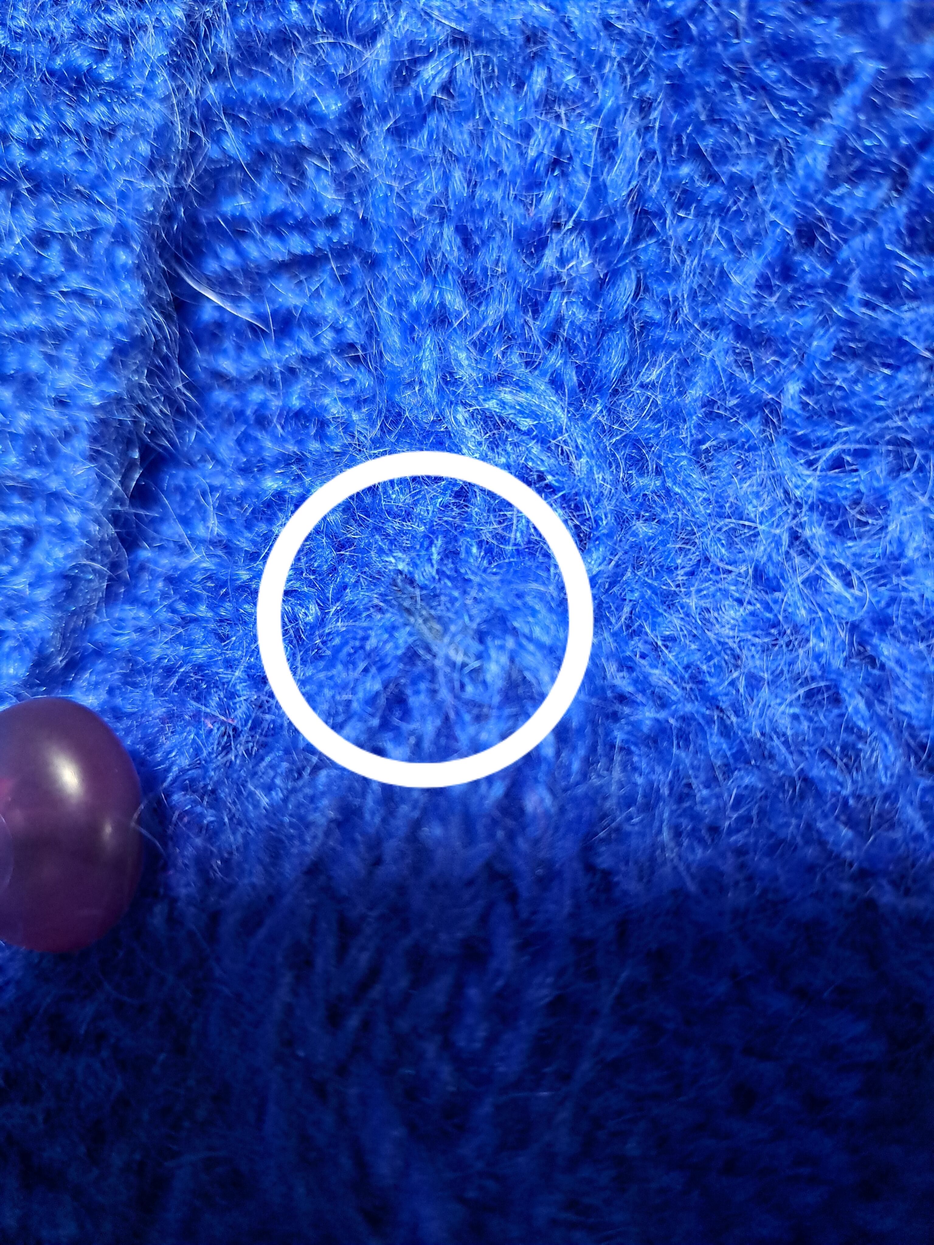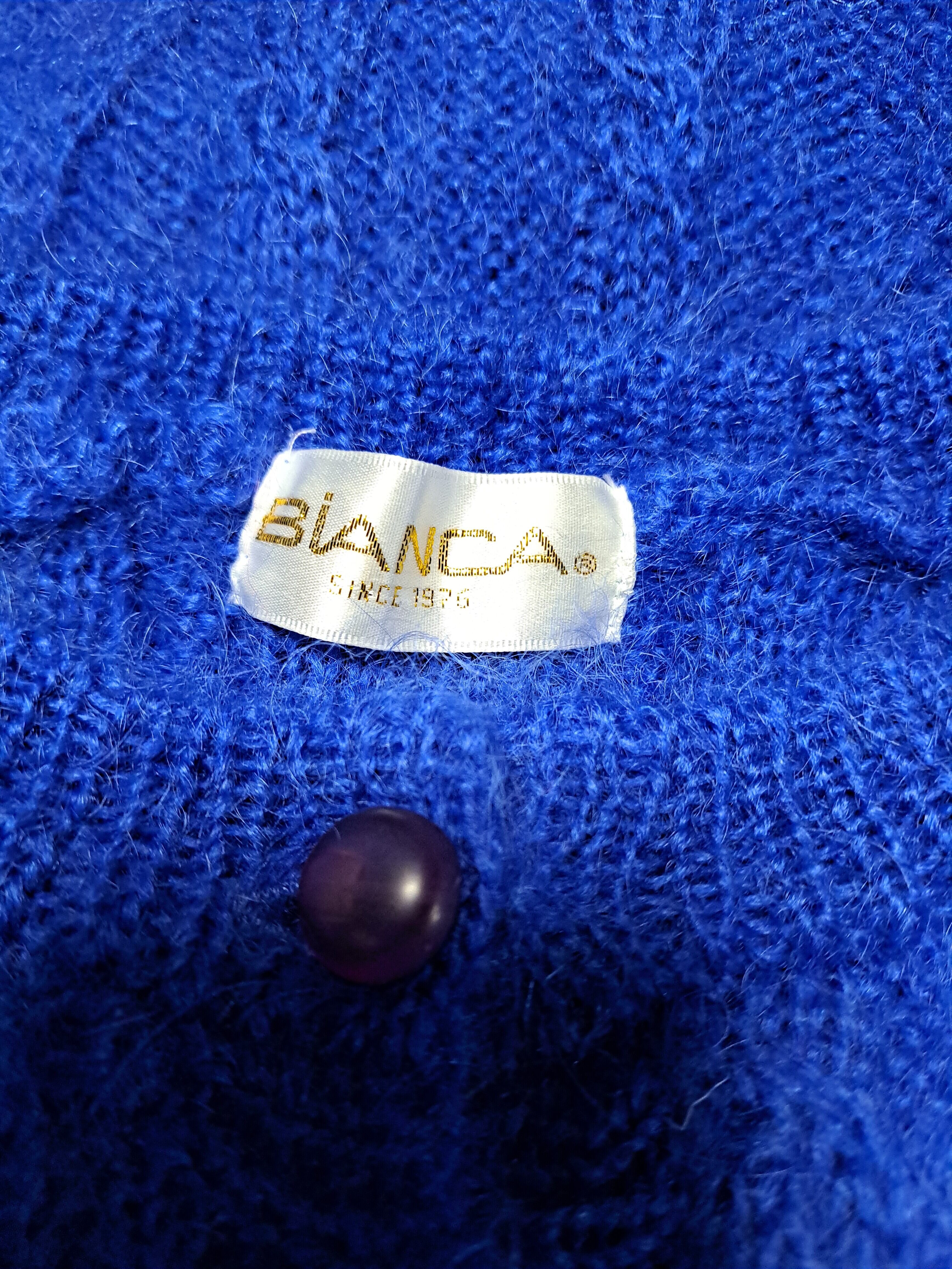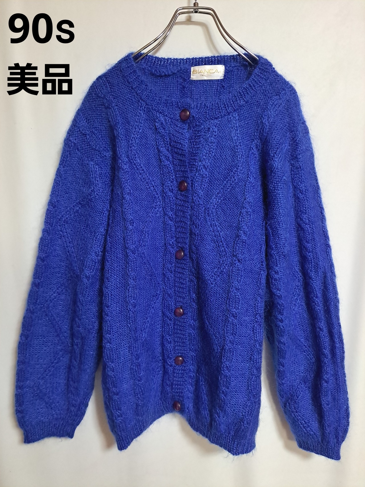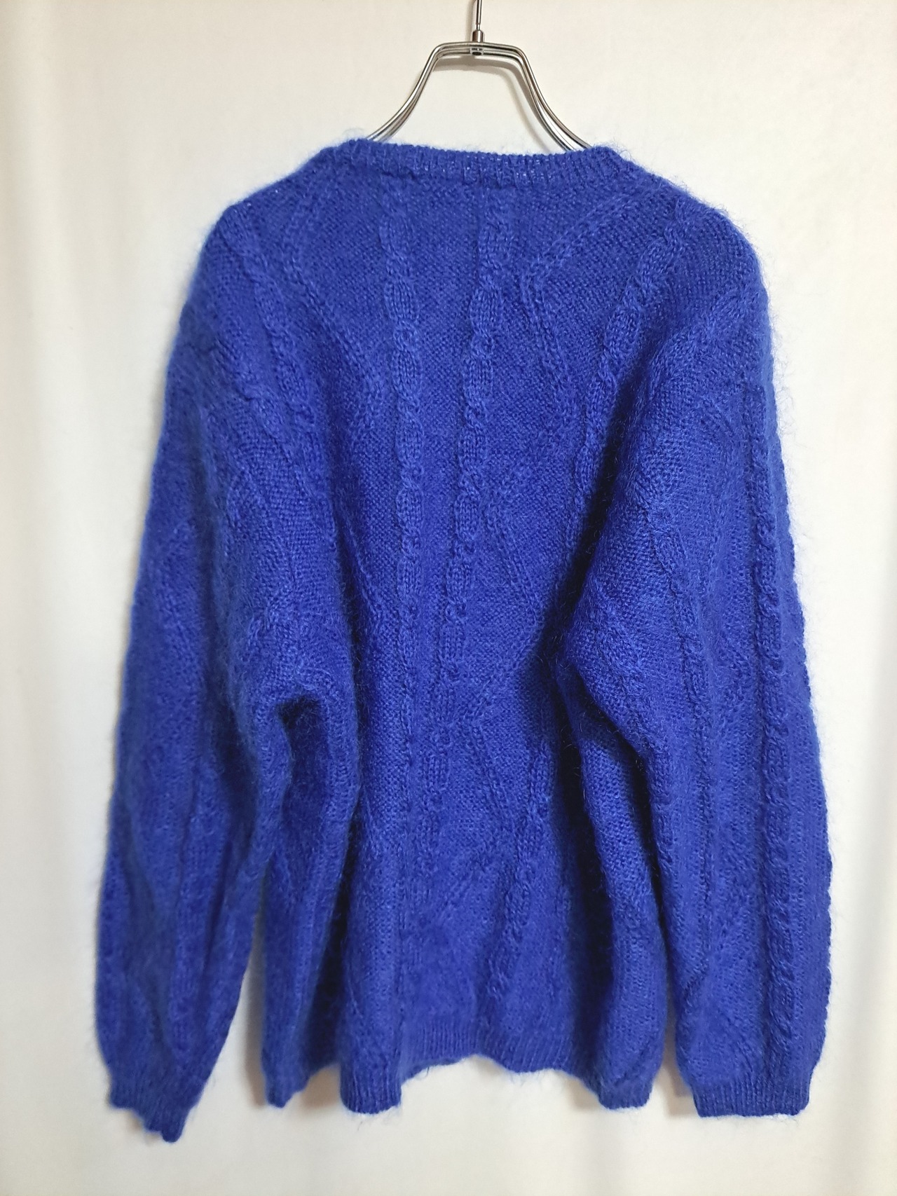綺麗なブルーの糸で編み込まれた、毛足長めのモヘアニットカーディガン。ウールが約半分で暖かいです。替えボタン付き。