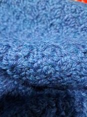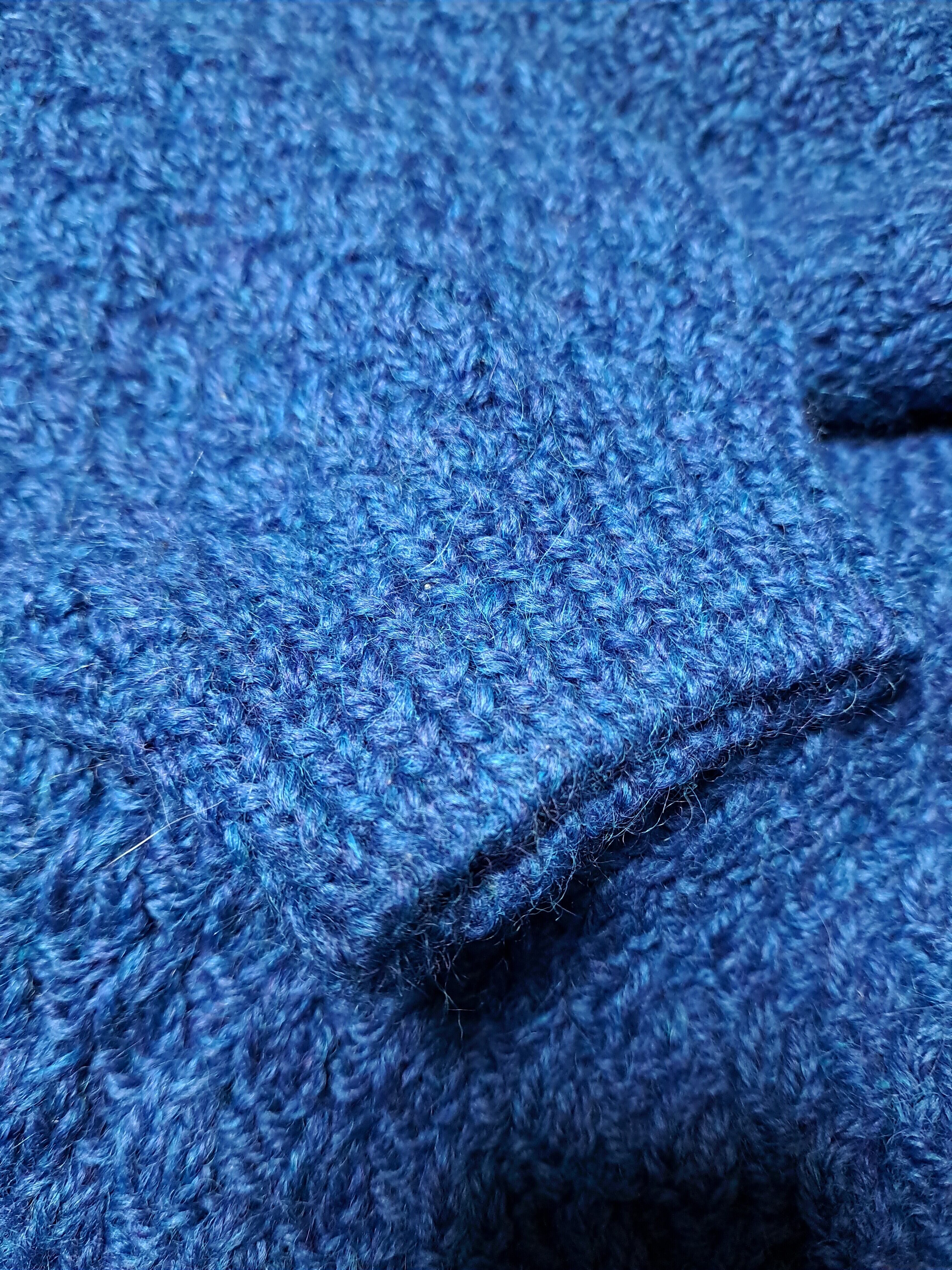 カラーはなんとも表現しがたいのですが、よく生地を見るとブルーと紫のミックスカラーでとても綺麗です。この手の編み方はあまり見かけず、造りもしっかりしていて状態も大変綺麗で暖かいです。