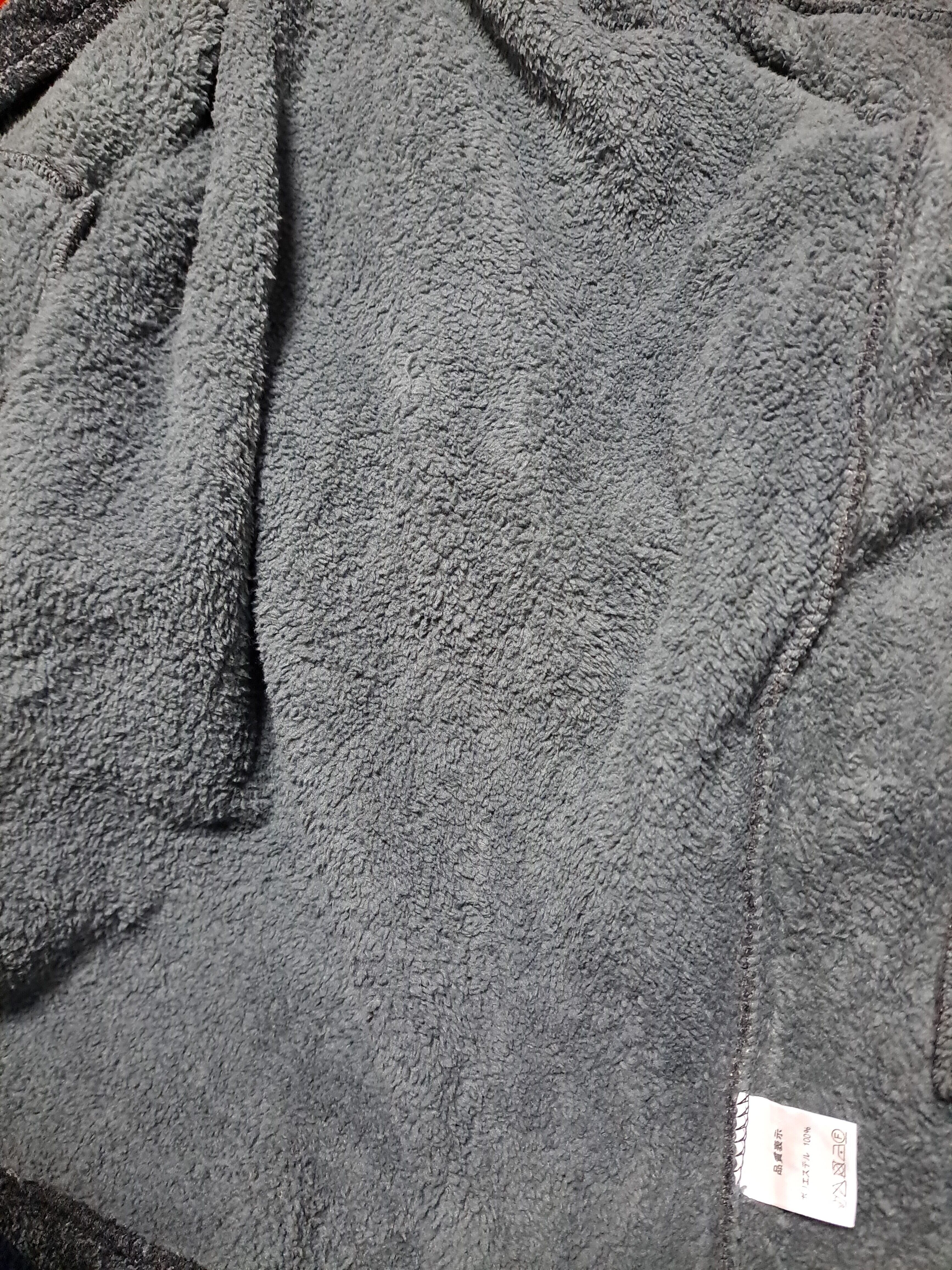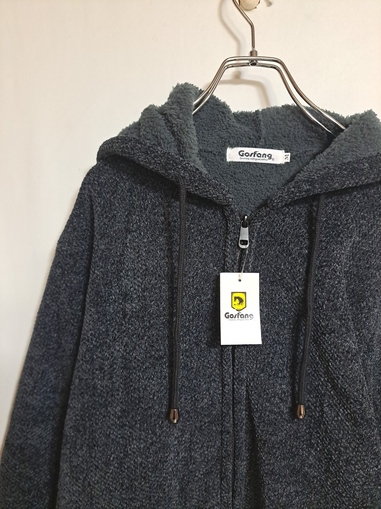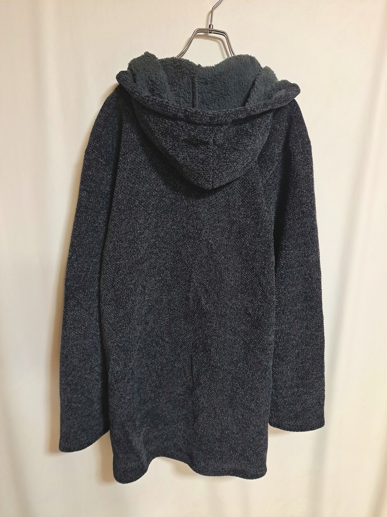 裏地がフリース仕様、表地もモコモコで暖かいフード一体型パーカー。フードは紐で絞れます。フロント左右に合計2つのポケット。