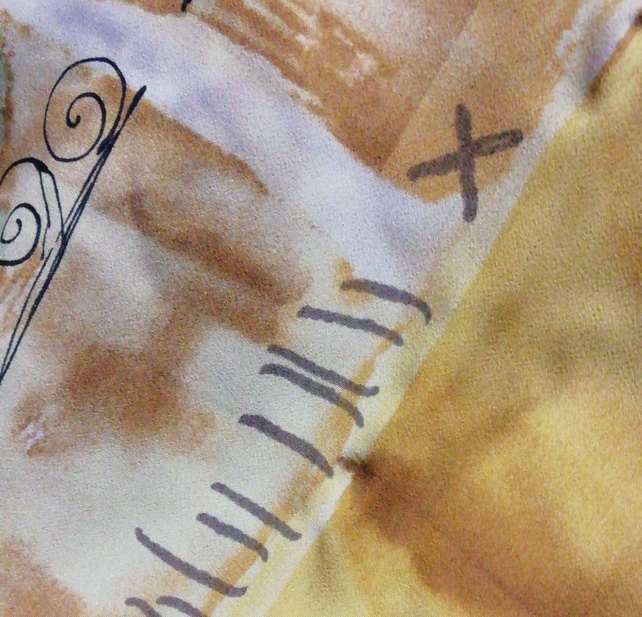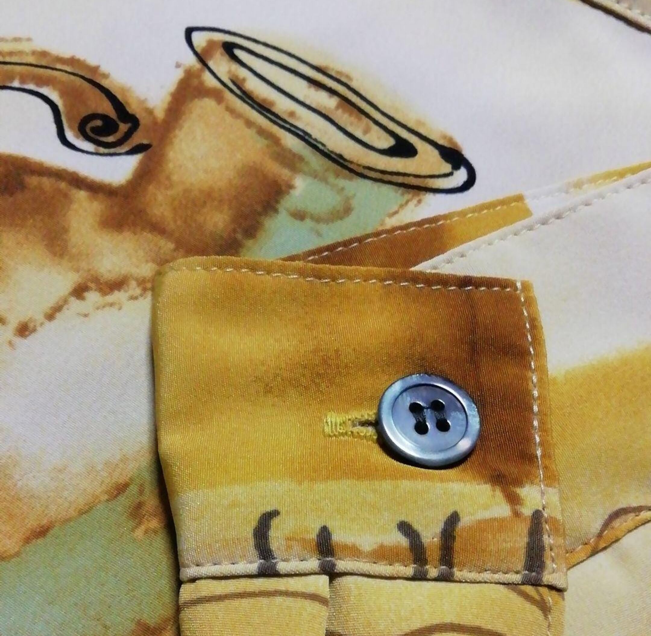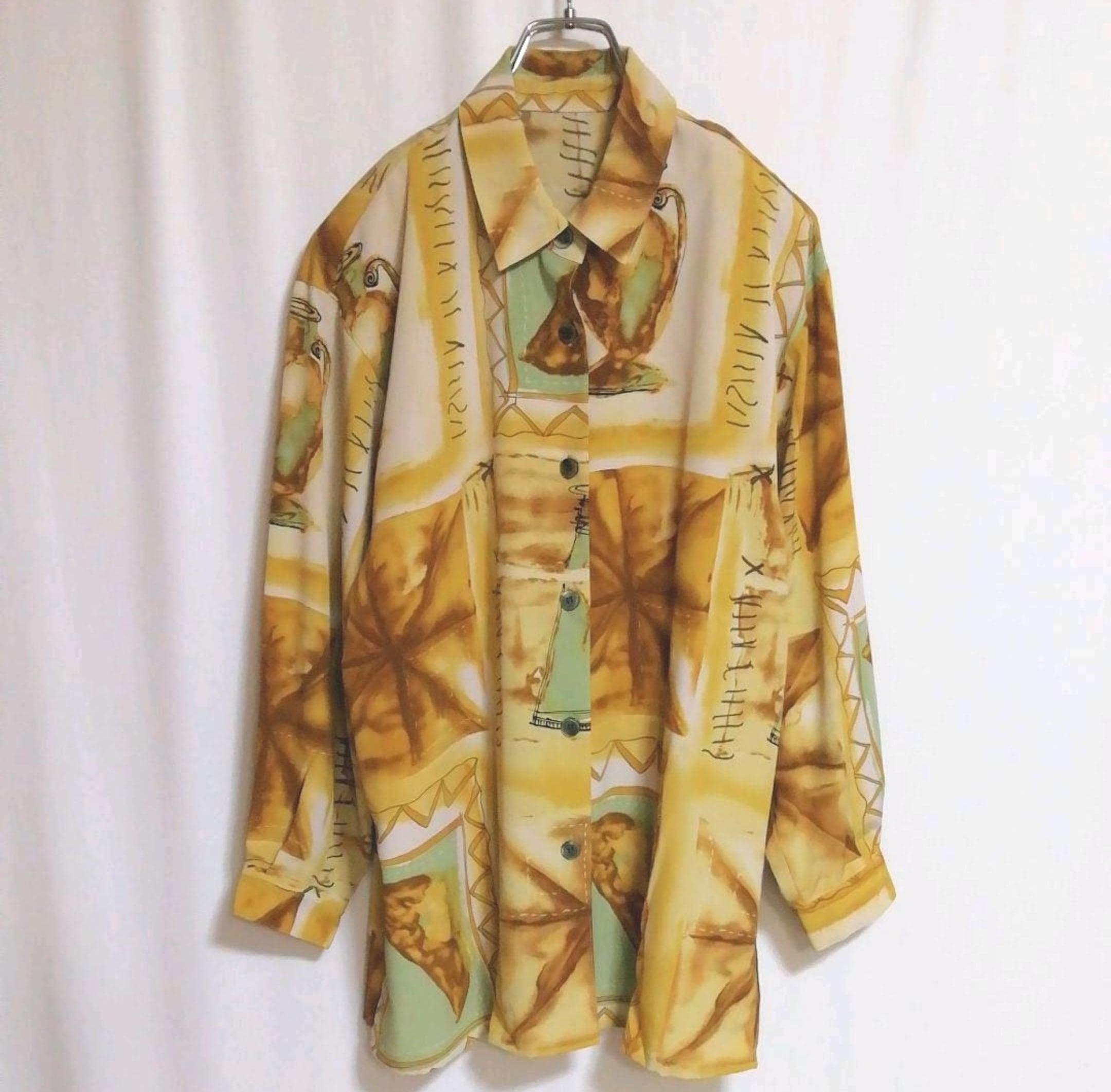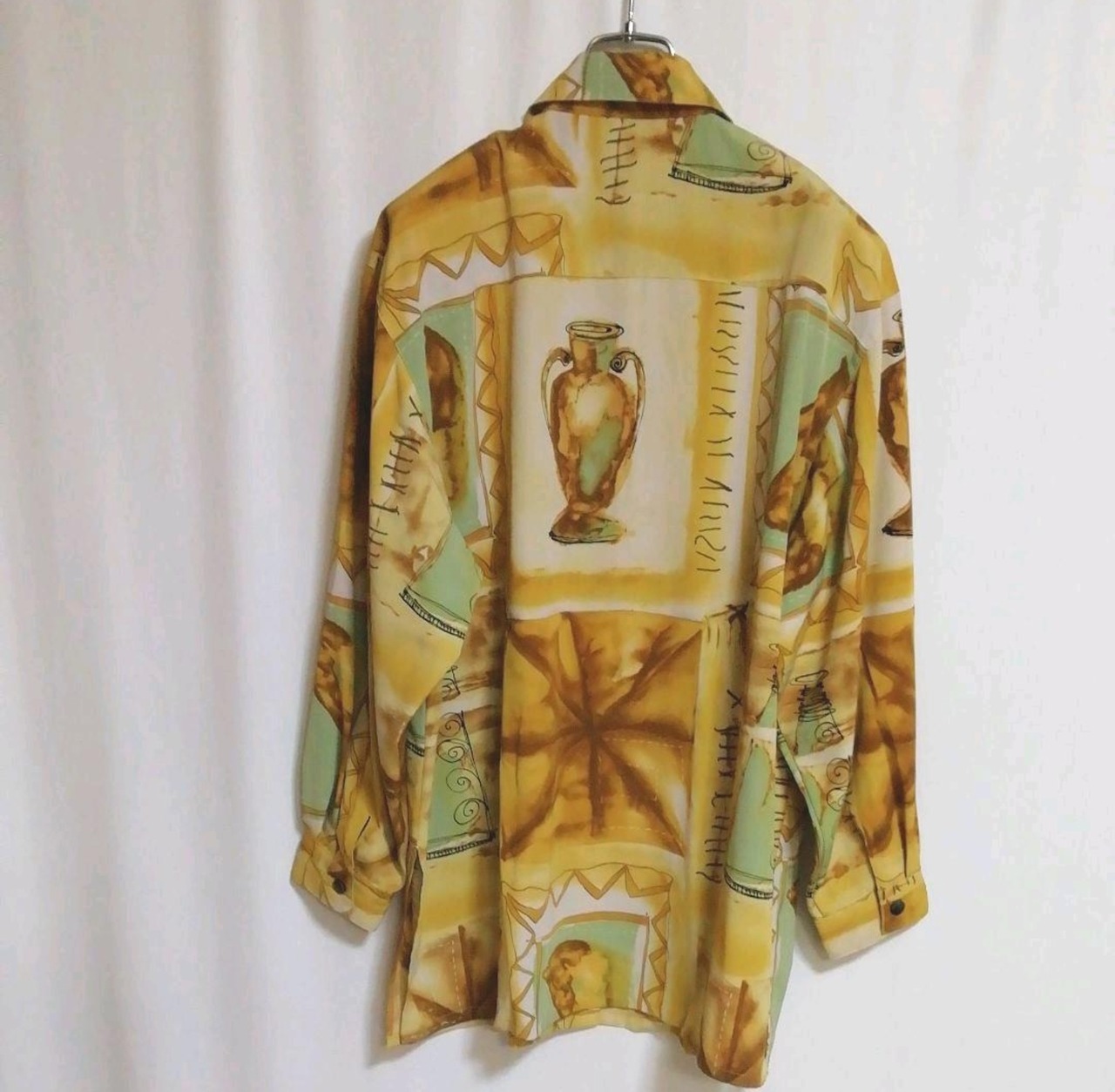 すべすべした薄手の長袖シャツになります。淡い黄色やベージュ系の優しい色味で描かれた坪や幾何学模様がレトロで可愛いです。安心の日本製。