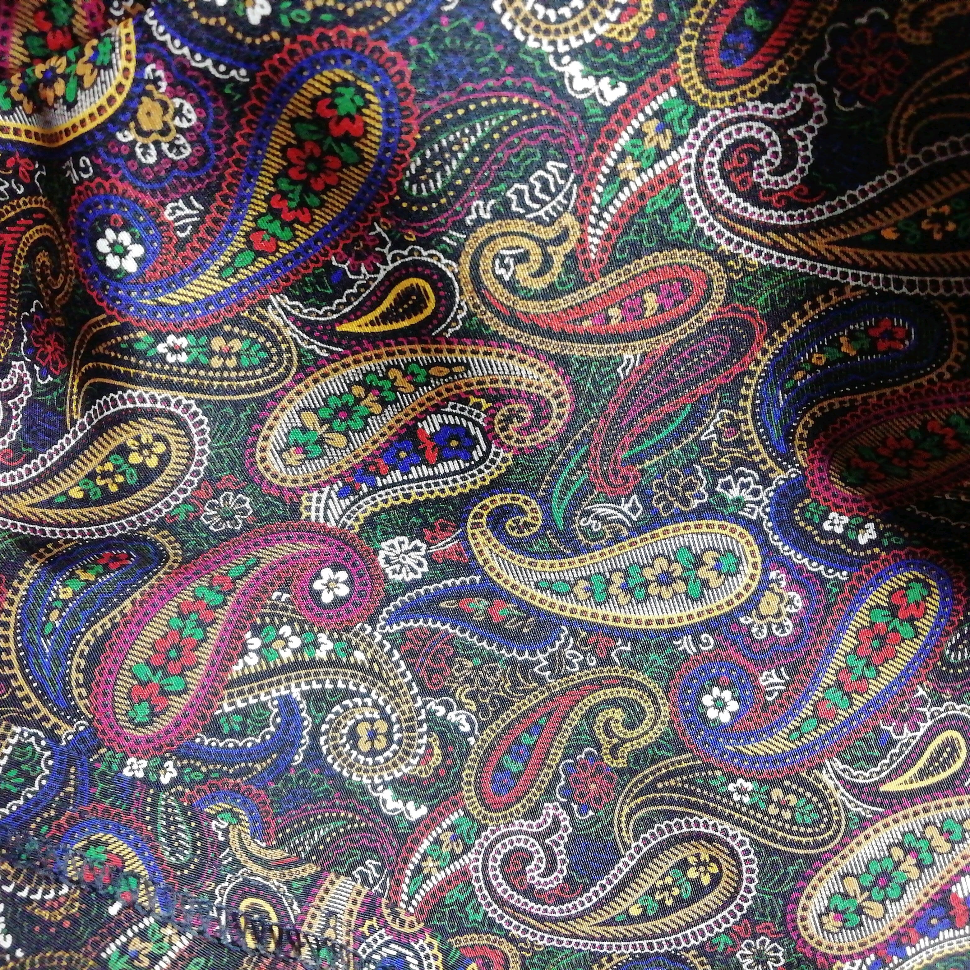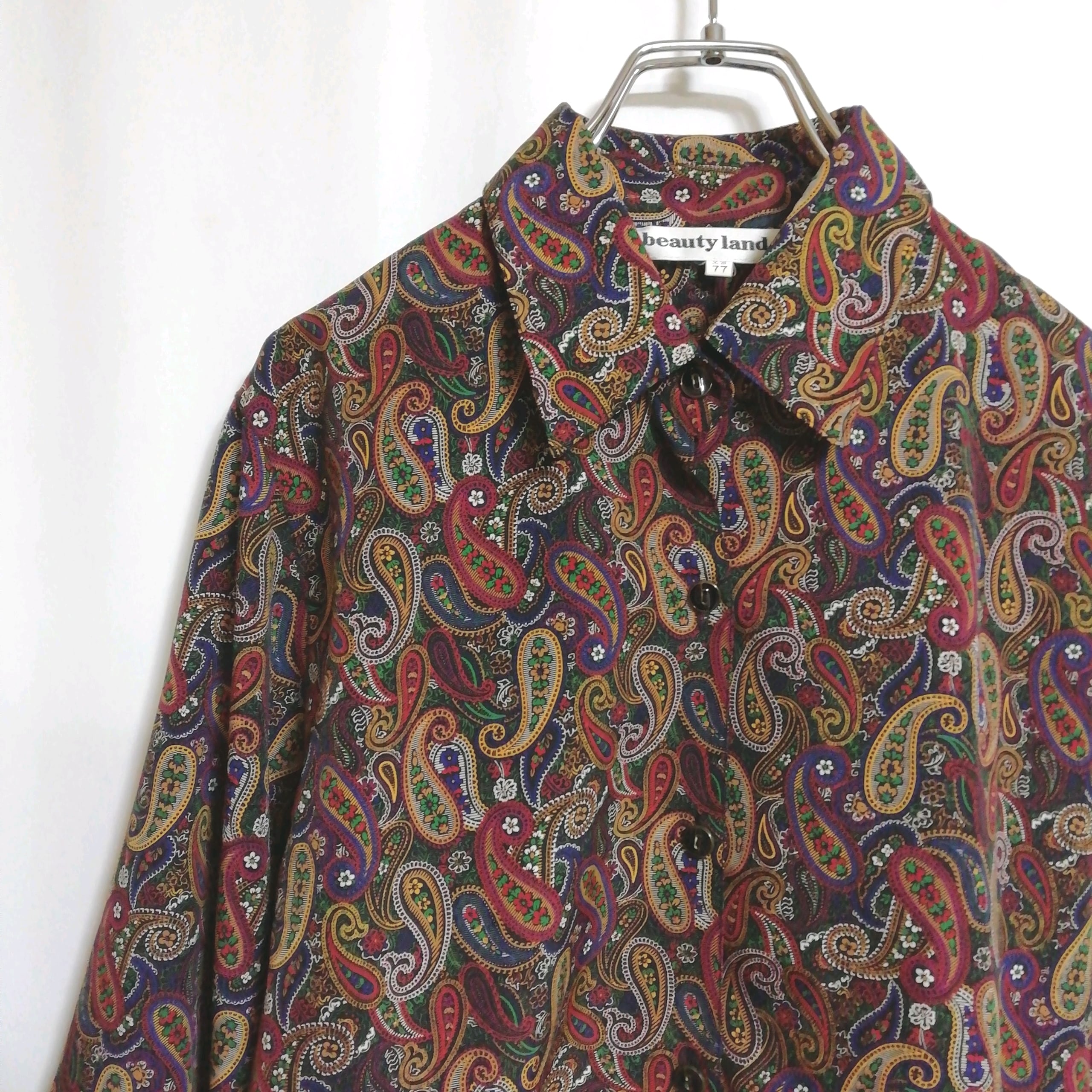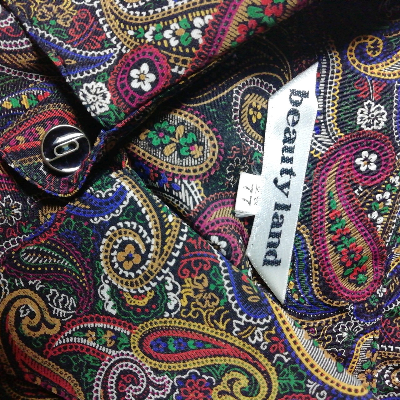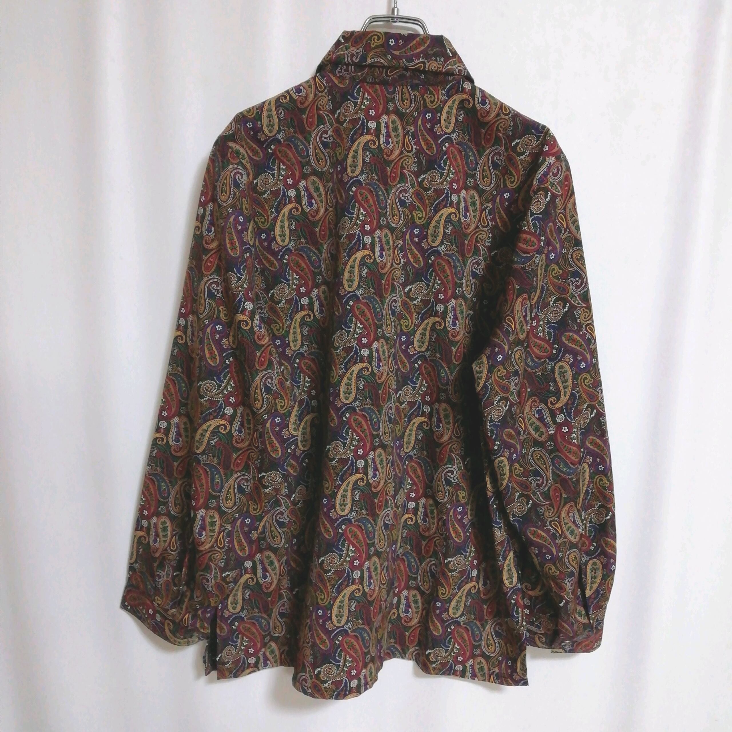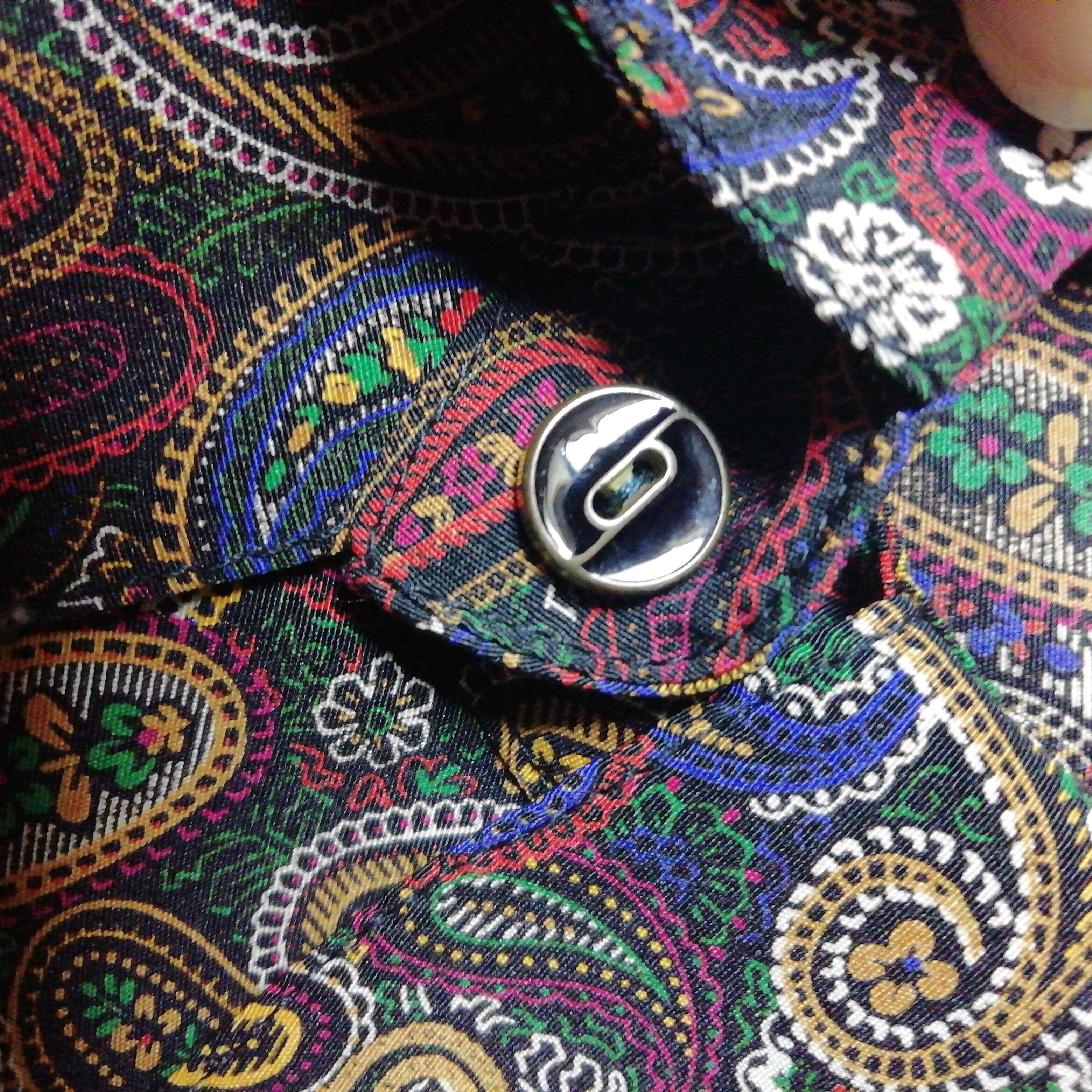 カラフルなペイズリー柄シャツ。素材はタグ表記がなく不明ですが、感触からおそらくポリエステルではないかと思います。